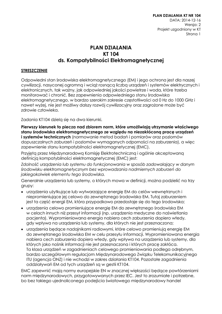 PLAN DZIAŁANIA KT NR 104 DATA: 2014-12-16 Wersja: 2 Projekt uzgodniony w KT Strona 1 PLAN DZIAŁANIA KT 104 ds. Kompatybilności Elektromagnetycznej STRESZCZENIE Odpowiedni stan środowiska elektromagnetycznego (EM) i jego ochrona jest dla naszej cywilizacji, nasyconej ogromną i wciąż rosnącą liczbą urządzeń i systemów elektrycznych i elektronicznych, tak ważny, jak odpowiedniej jakości powietrze i woda, które trzeba monitorować i chronić. Bez zapewnienia odpowiedniego stanu środowiska elektromagnetycznego, w bardzo szerokim zakresie częstotliwości od 0 Hz do 1000 GHz i nawet wyżej, nie jest możliwy dalszy rozwój cywilizacyjny oraz zagrożone może być zdrowie człowieka. Zadania KT104 dzielą się na dwa kierunki. Pierwszy kierunek to piecza nad zbiorem norm, które umożliwiają utrzymanie właściwego stanu środowiska elektromagnetycznego ze względu na niezakłóconą pracę urządzeń i systemów technicznych (normowanie metod badań i pomiarów oraz poziomów dopuszczalnych zaburzeń i poziomów wymaganych odporności na zaburzenia), a więc zapewnienie stanu kompatybilności elektromagnetycznej (EMC). Przyjętą przez Międzynarodową Komisję Elektrotechniczną i ogólnie akceptowaną definicją kompatybilności elektromagnetycznej (EMC) jest: Zdolność urządzenia lub systemu do funkcjonowania w sposób zadowalający w danym środowisku elektromagnetycznym bez wprowadzania nadmiernych zaburzeń do jakiegokolwiek elementu tego środowiska. Generalnie urządzenia lub systemy, o których mowa w definicji, można podzielić na trzy grupy: urządzenia użytkujące lub wytwarzające energię EM do celów wewnętrznych i niepromieniujące jej celowo do zewnętrznego środowiska EM. Tutaj zaburzeniem jest ta część energii EM, która przypadkowo przedostaje się do tego środowiska; urządzenia celowo promieniujące energię EM do zewnętrznego środowiska EM w celach innych niż przesył informacji (np. urządzenia medyczne do naświetlania pacjenta). Wypromieniowana energia nabiera cech zaburzenia dopiero wtedy, gdy wpływa na urządzenia lub systemy, dla których nie jest przeznaczona; urządzenia będące nadajnikami radiowymi, które celowo promieniują energię EM do zewnętrznego środowiska EM w celu przesyłu informacji. Wypromieniowana energia nabiera cech zaburzenia dopiero wtedy, gdy wpływa na urządzenia lub systemy, dla których jako nośnik informacji nie jest przeznaczona i których pracę zakłóca. Ta klasa urządzeń w zagadnieniach celowego promieniowania podlega odrębnym, bardzo szczegółowym regulacjom Międzynarodowego Związku Telekomunikacyjnego ITU (agencja ONZ) i nie wchodzi w zakres działania KT104. Pozostałe zagadnienia oddziaływań EM od tych urządzeń są w gestii KT104. EMC zapewnić mają normy europejskie EN w znacznej większości będące powtórzeniami norm międzynarodowych, przygotowywanych przez IEC. Jest to zrozumiałe i potrzebne, bo bez takiego ujednoliconego podejścia światowego międzynarodowy handel PLAN DZIAŁANIA KT NR 104 DATA: 2014-12-16 Wersja: 2 Projekt uzgodniony w KT Strona 2 wyrobami elektrycznymi i elektronicznymi byłby bardzo utrudniony, lub wręcz niemożliwy. Szczególnie teraz, w dobie globalizacji, ma to ogromne znaczenie. EMC dotyczy wszystkich prawie branż i wszystkich gałęzi gospodarki (elektryka i elektronika w różnych „wydaniach” jest stosowana praktycznie wszędzie). EMC jest problemem bardzo złożonym, a wraz z szybkim postępem technicznym komplikuje się coraz bardziej. Świadczyć o tym może duża liczba norm międzynarodowych poświęconych EMC – w IEC ponad 200, w ETSI ponad 120. Świadczą też obszerne prace badawcze z tego zakresu prowadzone przede wszystkim w niektórych krajach rozwiniętych. Użytkownikami norm są producenci, importerzy, sprzedawcy i użytkownicy urządzeń i systemów, którzy albo sami, albo wykorzystując wyspecjalizowane laboratoria, muszą wykazać zgodność z wymaganiami zasadniczymi Dyrektywy EMC (2004/108/EC) oraz dyrektywy RTTE (1999/5/EC) oraz z polskimi implementacjami prawnymi tych dyrektyw. Przyjmuje się, że spełnienie norm zharmonizowanych implikuje zgodność z tymi wymaganiami. Użytkownikiem norm jest także służba państwowa monitorująca i kontrolująca zgodność. Drugi kierunek to piecza nad zbiorem norm, które umożliwiają utrzymanie odpowiedniego stanu środowiska EM ze względu na ochronę człowieka przed narażeniami związanymi z ekspozycją na pola elektromagnetyczne (normowanie wyłącznie metod pomiarów; ustalanie poziomów dopuszczalnych nie jest w gestii KT). Tutaj uwzględniane są wszystkie urządzenia i systemy wprowadzające do środowiska energię elektromagnetyczną (celowo lub jako efekt uboczny wypełniania swojej podstawowej funkcji): elektroenergetyczne, radiokomunikacyjne, radiolokacyjne, radionawigacyjne, przemysłowe i inne. EMC w zakresie ochrony człowieka w środowisku naturalnym i w środowisku pracy mają zapewnić normy europejskie EN (35 pozycji), w części będące wprowadzeniem norm międzynarodowych przygotowywanych przez IEC, oraz odpowiednie przepisy krajowe. Normy te i przepisy umożliwiają pomiarową i obliczeniową weryfikację spełnienia wymagań podstawowych, którymi są poziomy dopuszczalne pól elektromagnetycznych określone w polskich przepisach środowiskowych oraz przepisach prawa pracy. Użytkownikami norm są producenci, importerzy, sprzedawcy i użytkownicy urządzeń i systemów, którzy albo sami, albo wykorzystując akredytowane laboratoria, muszą wykazać zgodność z wymaganiami podstawowymi określonymi w przepisach krajowych. Użytkownikami ich są także służby państwowe monitorujące i kontrolujące poziom ekspozycji człowieka, zarówno jeśli chodzi o ogół ludności jak i o ludzi w ich miejscach pracy. 1 ŚRODOWISKO BIZNESOWE KT 1.1 Opis środowiska biznesowego Środowiskiem KT104 są: cały przemysł elektryczny, energetyczny i elektroniczny z
