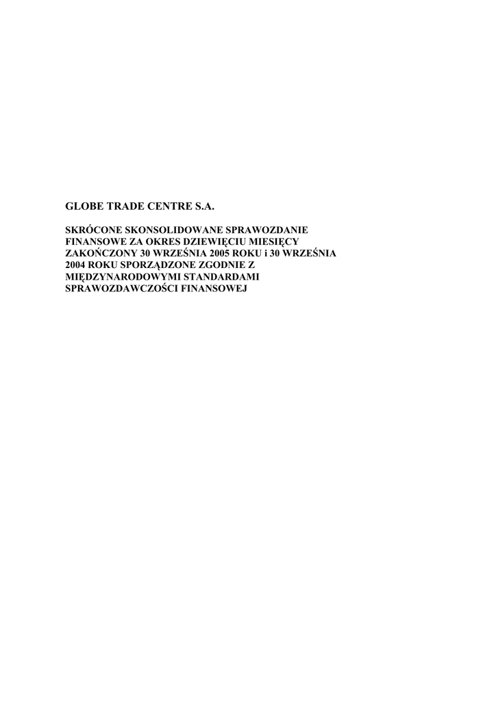 GLOBE TRADE CENTRE S.A. SKRÓCONE SKONSOLIDOWANE SPRAWOZDANIE FINANSOWE ZA OKRES DZIEWIĘCIU MIESIĘCY ZAKOŃCZONY 30 WRZEŚNIA 2005 ROKU i 30 WRZEŚNIA 2004 ROKU SPORZĄDZONE ZGODNIE Z MIĘDZYNARODOWYMI STANDARDAMI SPRAWOZDAWCZOŚCI FINANSOWEJ Globe Trade Centre S.A. Skrócone skonsolidowane bilanse na dzień 30 września 2005 roku, 30 września 2004 roku i 31 grudnia 2004 roku (w tysiącach PLN) AKTYWA Nota Aktywa trwałe Nieruchomości inwestycyjne Rzeczowe aktywa trwałe Wartość firmy Inwestycje w jednostkach stowarzyszonych Inwestycje w aktywa finansowe dostępne do sprzedaży Aktywa z tytułu odroczonego podatku dochodowego Zaliczki dla kontrahentów Pozostałe aktywa trwałe Aktywa obrotowe Zapasy Należności Naliczone przychody Należności z tytułu podatku VAT oraz innych podatków Czynne rozliczenia międzyokresowe kosztów oraz pozostałe należności Depozyty krótkoterminowe Środki pieniężne i ekwiwalenty środków pieniężnych 30 września 2005 r. (niebadane) 18 11 10 12 13 AKTYWA RAZEM PASYWA Kapitał własny przypadający na akcjonariuszy jednostki dominującej Kapitał akcyjny Nadwyżka za sprzedaży akcji powyżej ich wartości nominalnej Kapitał zapasowy Efekt wyceny transakcji zabezpieczających Niezrealizowany zysk/strata z tytułu aktywów finansowych dostępnych do sprzedaży Różnice kursowe z przeliczenia Zakumulowany zysk 15 Udziały mniejszości Kapitał własny razem Zobowiązania długoterminowe Długoterminowa część kredytów i pożyczek długoterminowych Depozyty od najemców Inne zobowiązania długoterminowe Rezerwy Rezerwa na odroczony podatek dochodowy Zobowiązania krótkoterminowe Zobowiązania z tytułu dostaw i inne zobowiązania Krótkoterminowe kredyty odnawialne Krótkoterminowa część kredytów i pożyczek długoterminowych Krótkoterminowa część innych zobowiązań długoterminowych Zobowiązania z tytułu podatku VAT i innych podatków Bierne rozliczenia międzyokresowe Otrzymane zaliczki Przychody przyszłych okresów Instrumenty pochodne 14 14 PASYWA RAZEM 30 września 2004 r. (niebadane, przekształcone) 31 grudnia 2004 r. (niebadane, przekształcone) 2.041.088 458.438 14.727 66.163 1.550.076 443.919 47.339 1.324.601 535.694 54.838 73.955 17.695 37.132 13.401 2.722.599 53.450 4.699 14.434 15.256 2.129.173 57.135 6.974 28.226 15.999 2.023.467 75.473 6.313 14.408 42.823 82.730 5.990 11.563 70.427 8.424 5.129 27.018 38.959 7.652 64.218 328.082 538.969 6.164 123.531 336.810 593.806 5.045 34.841 346.076 508.901 3.261.568 2.722.979 2.532.368 19.965 558.492 19.868 549.119 19.868 551.914 4.010 (4.319) 13.633 4.379 (1.103) (8.654) 3.681 (5.140) 5.081 (132.300) 1.124.883 1.584.364 (59.034) 909.410 1.413.985 (127.490) 793.709 1.241.623 28.773 1.613.137 35.306 1.449.291 33.286 1.274.909 1.250.538 979.218 995.845 9.906 11.906 163 103.901 1.376.414 7.576 63.021 1.049.815 8.343 20.909 1.346 30.167 1.056.610 101.715 101.455 42.733 7.153 119.633 71.530 6.026 66.193 11.004 - 2.013 2.567 3.575 2.022 21.561 17.229 1.446 15.040 272.017 39.108 6.410 5.261 223.873 35.388 6.373 11.304 200.849 3.261.568 2.722.979 2.532.368 Załączona informacja dodatkowa stanowi integralną część skróconych skonsolidowanych bilansów. 1 Globe Trade Centre S.A. Skrócone skonsolidowane rachunki zysków i strat za okresy dziewięciu miesięcy zakończone dnia 30 września 2005 roku, 30 września 2004 roku i za rok zakończony dnia 31 grudnia 2004 roku (w tysiącach PLN) Okres dziewięciu miesięcy Okres trzech miesięcy zakończony zakończony 30 września 30 września 2005 r. 2005 r. 2004 r. 2004 r. (niebadany) (niebadany, (niebadany) (niebadany, przekształcony) przekształcony) Rok zakończony 31 grudnia 2004 r. (przekształcony) Nota 7 217.582 150.762 73.064 47.862 206.021 8 (82.204) (49.502) (27.614) (16.005) (77.007) Zysk brutto z działalności operacyjnej 135.378 101.260 45.450 31.857 129.014 Koszty sprzedaży (8.437) (4.536) (2.831) (2.298) (6.718) (15.534) (13.155) (5.142) (3.933) (17.109) (5.001) (4.555) (1.281) (2.633) (6.941) 274.992 84.217 144.109 84.217 84.964 913 (1.342) (23) (667) (2.178) 382.311 161.889 180.282 106.543 181.032 (3.818) 8.044 3.041 2.518 (48.597) (39.590) (14.357) (9.928) (55.834) 906 2.102 1.033 524 5.322 Zysk brutto 330.802 132.445 169.999 99.657 149.022 Podatek dochodowy (62.665) (21.464) (29.228) (17.536) 621 Zysk netto 268.137 110.981 140.771 82.121 149.643 Przypadający na: Akcjonariuszy jednostki dominującej Udziały mniejszości 254.349 13.788 94.000 16.981 124.691 16.080 64.534 17.587 131.613 18.030 12,74 12,63 5,31 5,25 6,25 6,18 3,25 3,21 7,21 7,15 Przychody operacyjne Koszty operacyjne Koszty administracyjne Płatności w formie akcji własnych Zysk z aktualizacji wyceny nieruchomości inwestycyjnych Pozostałe przychody/ (koszty) Zysk przed opodatkowaniem i uwzględnieniem przychodów/(kosztów) finansowych 18.502 Dodatnie/ (ujemne) różnice kursowe, netto Przychody/ (koszty) finansowe, netto Udział w zysku/ (stracie) jednostek stowarzyszonych Zysk na jedną akcję (PLN) Rozwodniony zysk na jedną akcję (PLN) 16 16 Załączona informacja dodatkowa stanowi integralną część skróconych skonsolidowanych rachunków zysków i strat. 2 Globe Trade Centre S.A. Skrócone zestawienia zmian w skonsolidowanym kapitale własnym za okresy dziewięciu miesięcy zakończone dnia 30 września 2005 roku, 30 września 2004 roku i rok zakończony dnia 31 grudnia 2004 roku (w tysiącach PLN) Kapitał akcyjny Saldo na 1 stycznia 2004 r. Przeklasyfikowanie straty na inwestycji w aktywa finansowe dostępne do sprzedaży Przeklasyfikowanie z tytułu zastosowania standardu MSSF 2 „Płatności w formie akcji własnych” (nota 3) Przekształcone saldo na 1 stycznia 2004 r. Emisja akcji Różnice kursowe z przeliczenia Płatności w formie akcji własnych Zysk na inwestycji w aktywa finansowe dostępne do sprzedaży Nadwyżka ze sprzedaży akcji powyżej ich wartości nominalnej Kapitał zapasow y Efekt wyceny transakcji zabezpiecza