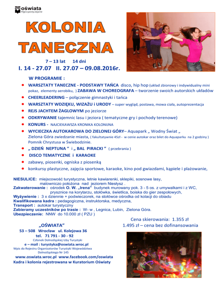 7 – 13 lat 14 dni I. 14 - 27.07 II. 27.07 – 09.08.2016r. W PROGRAMIE : WARSZTATY TANECZNE - PODSTAWY TAŃCA disco, hip hop (układ zbiorowy i indywidualny mini pokaz, elementy aerobiku, ) ZABAWA W CHOREOGRAFA – tworzenie swoich autorskich układów CHEERLEADERING – połączenie gimnastyki i tańca WARSZTATY WDZIĘKU, WIZAŻU i URODY – super wygląd, postawa, mowa ciała, autoprezentacja REJS JACHTEM ŻAGLOWYM po jeziorze ODKRYWANIE tajemnic lasu i jeziora ( tematyczne gry i pochody terenowe) KONURS - NAJCIEKAWSZA KRONIKA KOLONIJNA WYCIECZKA AUTOKAROWA DO ZIELONEJ GÓRY– Aquapark „ Wodny Świat „ Zielona Góra zwiedzanie miasta, ( fakultatywnie 45zł - w cenie autokar oraz bilet do Aquaparku na 2 godziny ) Pomnik Chrystusa w Świebodzinie. „ DZIEŃ NEPTUNA ” i „ BAL PIRACKI ” ( przebrania ) DISCO TEMATYCZNE i KARAOKE zabawy, piosenki, ogniska z piosenką konkursy plastyczne, zajęcia sportowe, karaoke, kino pod gwiazdami, kąpiele i plażowanie, NIESULICE: miejscowość turystyczna, letnie kawiarenki, sklepiki, sosnowe lasy, malowniczo położona nad jeziorem Niesłysz . Zakwaterowanie : ośrodek O. W. „Irena” budynek murowany pok. 3 - 5 os. z umywalkami i z WC, prysznice na korytarzu, stołówka, świetlica, boiska do gier zespołowych, Wyżywienie : 3 x dziennie + podwieczorek, na stołówce ośrodka od kolacji do obiadu Kwalifikowana kadra : pedagogiczna, instruktorska, medyczna, Transport : autokar turystyczny Zabieramy uczestników po trasie : W- w , Legnica, Lubin, Zielona Góra. Ubezpieczenie: NNW do 10.000 zł ( PZU ) „OŚWIATA” 53 – 508 Wrocław ul. Kolejowa 36 tel. 71 791 - 30 - 92 Członek Dolnośląskiej Izby Turystyki e – mail : [email protected] Wpis do Rejestru Organizatorów Turystyki Województwa Dolnośląskiego Nr 145 www.oswiata.wroc.pl www.facebook.com/oswiata Kadra i kolonia rejestrowana w Kuratorium Oświaty Cena skierowania: 1.355 zł 1.495 zł – cena bez dofinansowania KOLONIA 2016 TANECZNE NIESULICE NIESULICE : 12 km od Świebodzina, 40 km od Zielonej Góry, bardzo czyste, malowniczo położone jezioro Niesłysz – 550 ha powierzchni, I klasa czystości wody, sosnowe lasy, ośrodki wczasowe, sklepiki, punkty małej gastronomii itp. Zabieramy ze sobą : kieszonkowe na własne potrzeby – pieniądze można zdeponować u wychowawców ( koperta podpisana imieniem i nazwiskiem dziecka z kwotą podzieloną na mniejsze nominały np. po 10 , 20 zł ), legitymację szkolną, ubranie od wiatru, sweter lub polar, ubranie i obuwie sportowe, strój do zajęć tanecznych, czapeczka z daszkiem od słońca, krem z filtrem UV, kosmetyki, stroje i ręczniki kąpielowe, ulubione nagrania, śpiewniki, latarkę , dobry humor :-) , Prosimy o zaopatrzenie uczestników : w podstawowe leki ( od przeziębienia, ból gardła, uczulenia, środki na oparzenia słoneczne, witaminy ) Koszty leków specjalistycznych, antybiotyków, witamin itp. pokrywa uczestnik we własnym zakresie. UWAGA ! - drogocenne rzeczy zostawiamy w domu ! KOLONIA TANECZNA DOCHODZI DO SKUTKU PRZY MIN. 10 UCZESTNIKÓW W TURNUSIE. PRZYPOMINAMY O MOŻLIWOŚCI WYKUPIENIA POLISY UBEZPIECZENIOWEJ OD KOSZTÓW REZYGNACJI Z UDZIAŁU W IMPREZIE TURYSTYCZNEJ LUB WCZEŚNIEJSZEGOA WYJAZDU Z POWODÓW LOSOWYCH. TRANSPORT: wyjazd pierwszego dnia turnusu, powrót ostatniego dnia turnusu ZBIÓRKA wyjazd : Wrocław ul. Petrusewicza godz. 09.15, Legnica ul. Nowodworska stacja paliw LOTOS godz. 10.30, Lubin PKS stadion godz.11.00, Zielona Góra ul. Sulechowska przystanek MZK na wys. stadionu sportowego godz. 13.00, Niesulice godz. 14.00 Planowany powrót : Zielona G. godz. 16.00, Lubin godz.18.00, Legnica 18.30, W – w godz. 20.00. Zakup skierowania : telefonicznie, e- mailem lub w biurze w godz. 10.00 – 17.00, wpłata zaliczki na konto 200 zł Pozostała należność : do 12 dni przed rozpoczęciem turnusu. PŁATNOŚĆ na konto z dopiskiem KOLONIA TANECZNA NIESULICE TURNUS .... IMIĘ I NAZWISKO..........: „Oświata” Spółdzielnia Pracy 53 – 508 Wrocław ul. Kolejowa 36 BZ WBK S.A. I O / Wrocław 59 1090 2398 0000 0006 0800 0825 Faktury wystawiamy na instytucje lub osoby wpłacające