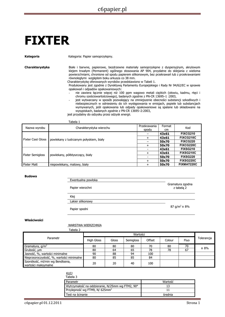 c6papier.pl FIXTER Kategoria Kategoria: Papier samoprzylepny. Charakterystyka Białe i barwne, papierowe, bezdrzewne materiały samoprzylepne z dyspersyjnym, akrylowym klejem trwałym (Permanent) ogólnego stosowania AP 904, przydatne do sklejania z wieloma powierzchniami, chronione od spodu papierem silikonowym, bez przekrawań lub z przekrawaniami równoległymi względem boku arkusza co 38 mm. Charakterystykę oferowanych wyrobów przedstawiono w Tabeli 1. Produkowany jest zgodnie z Dyrektywą Parlamentu Europejskiego i Rady Nr 94/62/EC w sprawie opakowań i odpadów opakowaniowych: nie zawiera łącznie więcej niż 100 ppm wagowo metali ciężkich (ołowiu, kadmu, rtęci i chromu sześciowartościowego), badanych zgodnie z PN-CR 13695–1 :2003, jest wytwarzany w sposób pozwalający na zmniejszenie obecności substancji szkodliwych i niebezpiecznych w odniesieniu do ich występowania w emisjach, popiele lub substancjach wymywanych, jeśli opakowania lub odpady opakowaniowe są spalane lub składowane na wysypiskach, badanych zgodnie z PN-CR 13695–2:2003, jest przydatny do odzysku przez odzysk energii. Tabela 1 Nazwa wyrobu Przekrawania spodu – + – + + + + Charakterystyka wierzchu Fixter Cast Gloss powlekany z lustrzanym połyskiem, biały Fixter Semigloss powlekany, półbłyszczący, biały Fixter Matt niepowlekany, matowy, biały Format cm 43x61 43x61 50x70 50x70 43x61 43x61 50x70 50x70 50x70 Kod FIXCG210 FIXCG210C FIXCG220 FIXCG220C FIXSG210 FIXSG210C FIXSG220 FIXSG220C FIXMAT220C Budowa Ewentualna powłoka Gramatura zgodna z tabelą 2 Papier wierzchni Klej Lakier silikonowy 87 g/m2 ± 8% Papier spodni Właściwości WARSTWA WIERZCHNIA Tabela 2 Wartości Parametr High Gloss Gloss Semigloss Offset Colour Fluo 80 80 90 80 80 64 88 85 80 65 94 85 70 78 100 84 80 78 70 67 20 20 40 100 Gramatura, g/m2 Grubość, µm Jasność, %, wartości minimalne Nieprzezroczystość, %, wartości minimalne Szorstkość, ml/min wg Bendtsena, wartości maksymalne Tolerancja KLEJ Tabela 3 c6papier.pl 01.12.2011 Parametr Wytrzymałość na oddzieranie, N/25mm wg FTM2, 90° Przylepność wg FTM9, N/ 625mm2 Wartość 13 11 Test na ścinanie średnia Strona 1 ± 8% c6papier.pl PAPIER SILIKONOWY Tabela 4 Parametr Wartości 87 93 Gramatura, g/m2 Grubość, µm Tolerancja ± 8% OGÓLNIE MATERIAŁ SAMOPRZYLEPNY Tabela 5 Parametr Minimalna temperatura naklejania,ºC minimalna Temperatura stosowania, ºC maksymalna Wartość +5 - 40 + 100 Certyfikaty Produkowany w Zakładach mających Certyfikat ISO 9001 i ISO 14001. Spełnia wymagania normy PN-EN 71-3:1998 Bezpieczeństwo zabawek. Migracja określonych pierwiastków. Zgodnie z Dyrektywą Rady Unii Europejskiej 1935/2004/EEC i innymi badaniami jest dopuszczony do kontaktu ze środkami spożywczymi. Spełnia wymagania Dyrektywy 2003/11/EC. Spełnia wymagania wymagania RoHS (Dyrektywy 2002/95/EC) dot. użytkowania w urządzeniach elektrycznych i elektronicznych. Włókna do wytworzenia wyrobu papierowego pochodzą z lasów, w których prowadzona jest zrównoważona gospodarka leśna (PEFC). Zastosowanie Etykiety i innego przeznaczenia naklejki trwale naklejane na podłoża metalowe, szklane, niechropowate, płaskie i walcowe o dużym promieniu krzywizny. W przypadku naklejania na inne podłoża należy dokonać sprawdzenia przydatności przy każdym zakupie, każdej partii (Nr Ref.). Za wynik sprawdzenia producent i dystrybutor nie biorą odpowiedzialności. W zależności od wymagań można dobrać papier wierzchni o różnym uszlachetnieniu, wyglądzie zewnętrznym. Warunek: należy sprawdzić właściwości użytkowe oraz przydatność do danego zastosowania. Przetwarzanie Przydatne do zadrukowywania wszystkimi technikami drukowania, tłoczenia. Przy drukowaniu offsetowym maksymalna liniatura stosowanego rastra jest zależna od wierzchniej powłoki na papierze: od mniej niż 50 l/cm dla niepowlekanych do więcej niż 80 l/cm dla powlekanych przez odlewanie. Papiery niepowlekane (offsetowe) przydatne do drukarek laserowych, igłowych i atramentowych. Przydatne do zadrukowywania strony spodniej. Papiery z powlekaną warstwą wierzchnią przydatne do lakierowania. Papiery bez powlekanej powierzchni można lakierować dla zwiększenia wytrzymałości na ścieranie, ale nie dla zwiększenia połysku i estetyki. Laminowanie możliwe, ale po przeprowadzeniu prób, czy dana technologia laminowania jest możliwa do zastosowania. Przydatne do krojenia, wykrawania. Przy krojeniu zaleca się nie stosowanie wyższych stosów niż 50 mm przy jak najmniejszym nacisku belki dociskowej. Zalecane warunki przy drukowaniu i krojeniu: 20ºC, 50% wilgotności względnej. W przypadku przerw w procesie technologicznym, dla przeciwdziałania zmianom wilgotności, zaleca się szczelne opakowywanie stosów folią polietylenową. Pakowanie Paczki pakowane na paletach zgodnie z tabelą 6. Tabela 6 Nazwa wyrobu Min l. ark. w paczce High Gloss, Gloss, Semigloss, Offset, Colour, Fluo 198 Oferta, jednostki sprzedaży, ceny c6papier.pl 01.12.2011 Nominalna l. ark. w paczce 200 Max. l. ark. w paczce L. arkuszy na palecie L. paczek na palecie 10000 50 2000 10 202 200 Wyroby dostępne w ofercie podano w tabeli 1 Przy sprzedaży całej paczki, rzeczywista liczba arkuszy w paczce powinna być równa liczbie deklarowanej, nominalnej z dopuszczalną tolerancją 1% tj. 2 arkuszy w paczce. Przy sprzedaży części paczki, rzeczywista liczba dostarczonych arkuszy jest równa liczbie deklarowanej. Jednostką sprzedaży jest 1 arkusz. Cena jest wyrażona w zł za 1 arkusz. Strona 2 c6papier.pl Przechowywanie c6papier.pl 01.12.2011 Należy przechowywać w oryginalnych opakowaniach, w temperaturze ok. 22ºC ±2ºC przy wilgotności względnej ok. 50 % ±5ºC, z dala od urządzeń grzewczych i źródeł ognia, chronić przed bezpośrednim działaniem promieni słonecznych. Wyroby przechowywane w tych warunkach mają trwałość 2 lata. Strona 3