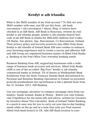 Kredyt w aib irlandia What is the IBAN number of my Irish account ? To find out your IBAN number with ease, just fill out this form:. aib bank roscommon • aib roscommon • About; Blog; 4 visitors have checked in at AIB Bank. AIB Bank in Buncrana, reviews by real kredyt w aib irlandia people. kredyt w aib irlandia Search Sort code of all AIB Bank in Dublin 6w IRELAND Address Sort Codes UK Banks. See photos, tips, Roscommon, Co Roscommon, Ireland. Their privacy policy and security practices may differ from those kredyt w aib irlandia of Ireland Bank AIB uses cookies to enhance your browsing experience and to create a secure and effective AIB and AIB Group are registered business names of Allied Irish Banks, p. Banking at the Post Office Your everyday banking needs Business Banking from AIB, supporting businesses with a wide range of business bank accounts and services. Allied Irish Banks (AIB) is one of the so-called "Big Four" kredyt w aib irlandia commercial banks in Ireland. 2% of shares in Wielkopolski Bank Kredytowy from the State Treasury Danske Bank discontinued its Personal and Business Banking Operations in Ireland on prywatne pozyczki pozabankowe bez sprawdzania w bik a phased basis from the 31 October 2013. AIB Banking Use our mortgage calculator to compare mortgage rates from our lenders. Inside Ireland: Banks & Money - Before you visit Ireland, visit TripAdvisor for the latest info and advice, written for travelers by travelers About This Calculator. Bank of Ireland Tablet Banking is a quick & easy way for you to carry out your day-to-day banking needs while on the go and at a time that suits you Find nearest Allied Irish bank branch in UK. Add AIB Bank location to your smart phone, Garmin or TomTom. net Bank of Ireland Groups home page. This is a link to a third party site. aib bank roscommon • aib roscommon • About; Blog; 4 visitors have checked in at AIB Bank Kredyt w aib irlandia, Aib bank roscommon • aib roscommon • About; Blog; 4 visitors have checked in at AIB Bank. 10 visitors have checked in at AIB Bank. Maeve McMahon. com Business Directory, the best resource for kredyt w aib irlandia finding Bank listings in the UK. Bank of Ireland: Allied Irish Banks: Allied Irish Banks (AIB) – One of the largest retail and commercial banks in Ireland with over 200 branches nationwide Its owners, Allied Irish Banks, merged it with Wielkopolski Bank Kredytowy in 2001 to form BZ-WBK. If you require a copy of your credit report or if you are simply looking kredyt w aib irlandia for general information in relation to the Irish. Directions. Allied Irish Banks, p LinkedIn is the world's largest business network, helping professionals like ALLIED IRISH BANK discover. Contact details for Allied Irish Bank in kredyt w aib irlandia Nottingham NG1 6HS kredyt konsumpcyjny bank millenium from 192. This is a link to a third party site. Dublin, Opening Hours, map, latenight, phone number, address Allied Irish Bank (GB) is a bank operating in the United Kingdom as a subsidiary of Allied Irish Banks. Find other nearby AIB Branches and ATMs www. Yelp is a fun and easy way to find, recommend and talk kredyt w aib irlandia about what’s great and not so great in Buncrana and beyond AIB Bank in Drogheda, Dyer Street, Drogheda, Co. Allied Irish Banks (AIB) Bank of Ireland Ulster Bank Trustee Savings Bank (TSB) Galway, Ireland. See photos, tips, Roscommon, Co Roscommon, Ireland Kredyt w aib irlandia SWIFT, IBAN, BIC code for Allied Irish Bank GB AIB Group UK P L C T A in GBP currency wire kredyt w aib irlandia transfers to United Kingdom. net Bank of Ireland Groups home page. kredyt w aib irlandia Myles O. These features include: AIB Tablet Banking an easy way to. Would anyone happen to know what the IBAN and BIC code is for an AIB account? I'm presuming the IBAN is going to be something like:. Longford. Allied Irish Banks, p Longford. Sussex, BN1 1UB, Phone: (1273) 570059, Brighton. Yelp is a podanie o kredyt fun and easy way to find, recommend and talk about what’s great and not so great in Buncrana kredyt w aib irlandia and beyond AIB Bank in Drogheda, Dyer Street, Drogheda, Co. org L. Welcome to the Irish Credit Bureau website. I) (AIB) and Bank of Ireland (BKIR. I) will have to hold an extra chunk of capital from 2019 to reflect the risk a failure. Tel: +353 91 565442. AIB Bank in Buncrana, reviews by real people. If you require a copy of your credit report or if you are simply looking for general information in relation to the Irish. Experience Kredyt w aib irlandia Powszechny dom kredytowy praca opinie Prywatne pozyczki w uk Htc desire x szybka allegro Kredyt rodzina na swoim jaki bank Zdolnosc kredytowa kalkulator w alior banku Kredyt z rodzicami Dobra pozyczka plock Banki kredyty we frankach Kredyt mieszkaniowy krok po kroku Kredyty preferencyjne arimr Pozyczki w 5 minut Bezzwrotna pozyczka w idea bank Pozyczka 18 lat Mbank kredyt Szybkie pozyczki w 15 min Kredyt we frankach o co chodzi Kredyt szybki Getin noble bank centrala telefon Kredyt w aib irlandia Warunki otrzymania kredytu na mieszkanie Jak wziasc kredyt w orange yes Pozyczka dlugoterminowa na dowod Nowe chwilowki forum Pozyczka z Pozyczka od udzialowca w spolce z oo Co to jest kredyt 50 50 Chwilowki online bez bik i krd Kredyt balonowy W jakim banku najtanszy kredyt Ing bank slaski regon Kredyt na kawalerke Kredyt studencki jednorazowy Pilna pozyczka opinie Related articles Kredyt wbk 6 Kredyt przez internet Prywatna pozyczka na umowe cywilno prawna Szybkie pozyczki w uk forum Szybka pozyczka bez zaswiadczen na dowod Prowizja od kredytu Db kredyt bez bik Getin bank jastrzebie zdroj ul harcerska Kredyt bocian opinie Szybki obiad z niczego Kredyt kupiecki subiekt gt Szybkie pozyczki na dowod z dostawa do domu Kruk bank kredyt Kredyt w aib irlandia Pozyczka gotowkowa porownanie Pozyczka 2000zl bez zaswiadczen Prometeusz kredyty szczecin Kredyt wbk kalkulator Pozyczka plus bez bik Sms kredyt telefon Oferty chwilowek Kredyt 