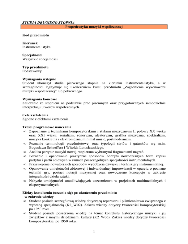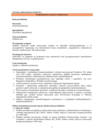 STUDIA DRUGIEGO STOPNIA Propedeutyka muzyki współczesnej Kod przedmiotu Kierunek Instrumentalistyka Specjalności Wszystkie specjalności Typ przedmiotu Podstawowy Wymagania wstępne Student ukończył studia pierwszego stopnia na kierunku Instrumentalistyka, a w szczególności legitymuje się ukończeniem kursu przedmiotu „Zagadnienia wykonawcze muzyki współczesnej” lub pokrewnego. Wymagania końcowe Zaliczenie ze stopniem na podstawie prac pisemnych oraz przygotowanych samodzielnie interpretacji utworów współczesnych. Cele kształcenia Zgodne z efektami kształcenia. Treści programowe nauczania • Zapoznanie z technikami kompozytorskimi i stylami muzycznymi II połowy XX wieku oraz XXI wieku: serializm, sonoryzm, aleatoryzm, grafika muzyczna, spektralizm, muzyka konkretna i elektroniczna, minimal music, postmodernizm. • Poznanie terminologii przedmiotowej oraz typologii stylów i gatunków wg m.in. Bogusława Schaeffera i Witolda Lutosławskiego. • Analiza partytur muzyki nowej, wspierana wybranymi fragmentami nagrań. • Poznanie i opanowanie praktyczne sposobów odczytu nowoczesnych form zapisu partytur i partii solowych w ramach poszczególnych specjalności instrumentalnych. • Przyswojenie nowatorskich sposobów wydobycia dźwięku i technik gry instrumentalnej. • Opanowanie umiejętności zbiorowej i indywidualnej improwizacji w oparciu o poznane techniki gry, postaci notacji muzycznej oraz nowoczesne koncepcje w zakresie integralności dzieła sztuki. • Nabycie umiejętności umożliwiających uczestnictwo w projektach multimedialnych i eksperymentalnych. Efekty kształcenia (uczenia się) po ukończeniu przedmiotu - w zakresie wiedzy • Student posiada szczegółową wiedzę dotyczącą repertuaru i piśmiennictwa związanego z wybraną specjalnością (K2_W02). Zakres wiedzy dotyczy twórczości kompozytorskiej po 1950 roku. • Student posiada poszerzoną wiedzę na temat kontekstu historycznego muzyki i jej związków z innymi dziedzinami kultury (K2_W06). Zakres wiedzy dotyczy twórczości kompozytorskiej po 1950 roku. 1 • Student poprzez indywidualną pracę poszerza wiedzę dotyczącą improwizacji; jeżeli improwizacja jest związana ze specjalnością i zawarta w programie nauczania, absolwent dysponuje szeroką wiedzą umożliwiającą swobodną improwizację w różnych kontekstach (K2_W09). Zakres wiedzy dotyczy twórczości kompozytorskiej po 1950 roku. - w zakresie umiejętności • Student samodzielnie interpretuje i wykonuje utwory muzyczne w oparciu o własne twórcze motywacje i inspiracje na wysokim poziomie profesjonalizmu, zgodnie z wymaganiami stylistycznymi (K2_U02). Zakres umiejętności dotyczy twórczości kompozytorskiej po 1950 roku. • Student potrafi działać w różnych formacjach zespołowych i posiada umiejętność współdziałania z innymi artystami w różnego typu zespołach oraz w ramach innych wspólnych prac i projektów, także o charakterze multidyscyplinarnym (K2_U06). Zakres umiejętności dotyczy twórczości kompozytorskiej po 1950 roku. • Student osiąga wysoki poziom biegłości w sztuce improwizacji (K2_U16). Zakres umiejętności dotyczy twórczości kompozytorskiej po 1950 roku. - w zakresie kompetencji społecznych • Student inicjuje działania artystyczne w zakresie szeroko pojętej kultury; potrafi podejmować się realizacji projektów o charakterze interdyscyplinarnym lub też wymagających współpracy z przedstawicielami innych dziedzin sztuki i nauki (K2_K02). Metody nauczania Ćwiczenia - analiza przykładów muzycznych pod względem harmoniki, rytmiki, melodyki, faktury, formy, notacji oraz aspektów wykonawczych na przykładzie partytur i nagrań. Nakład pracy studenta potrzebny do osiągnięcia efektów uczenia się ROK SEMESTR Punkty ECTS Ilość godzin w semestrze Rodzaj zaliczenia LEGENDA I II 1 2 1 1 15 15 zs zs 3 4 zal – zaliczony; zs – zaliczenie ze stopniem; egz – egzamin; ed – egzamin dyplomowy Kryteria oceny • Część teoretyczna – praca pisemna z uwzględnieniem pytań zawierających przykłady muzyczne, mająca na celu sprawdzenie wiedzy dotyczącej technik kompozytorskich, stylów, twórczości wybranych kompozytorów, notacji oraz technik wykonawczych typowych dla muzyki powstałej po roku 1950. • Część praktyczna – przygotowanie dwóch lub trzech utworów muzycznych z wykorzystaniem nowych sposobów notacji, technik kompozytorskich oraz wykonawczych, w tym również improwizacji (np. grafika muzyczna), w obsadzie solowej lub kameralnej. 2 Literatura (piśmiennictwo) Cage J., Notations, Something Else Press, New York 1969. Kutnik J., John Cage. Przypadek paradoksalny, Lublin 1993. Kultura dźwięku. Teksty o muzyce nowoczesnej, red. Christoph Cox, Daniel Warner, słowo/obraz terytoria, Gdańsk 2010. Rae Ch. B., Muzyka Lutosławskiego, PWN, Kraków 1996. Artykuły dotyczące omawianych zagadnień i kompozytorów dostępne na stronie internetowej www.glissando.pl Język wykładowy Polski, angielski, niemiecki, rosyjski. Imię i nazwisko wykładowcy dr Artur Zagajewski dr Sławomir Zamuszko 3