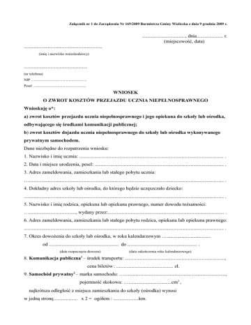 Załącznik nr 1 do Zarządzenia Nr 169/2009 Burmistrza Gminy Wieliczka z dnia 9 grudnia 2009 r. .................................., dnia..................... r. (miejscowość, data) .............................................................. (imię i nazwisko wnioskodawcy) .................................................. (nr telefonu) NIP …....................................................... Pesel ….................................................... WNIOSEK O ZWROT KOSZTÓW PRZEJAZDU UCZNIA NIEPEŁNOSPRAWNEGO Wnioskuję o*: a) zwrot kosztów przejazdu ucznia niepełnosprawnego i jego opiekuna do szkoły lub ośrodka, odbywającego się środkami komunikacji publicznej; b) zwrot kosztów dojazdu ucznia niepełnosprawnego do szkoły lub ośrodka wykonywanego prywatnym samochodem. Dane niezbędne do rozpatrzenia wniosku: 1. Nazwisko i imię ucznia: .................................................................................................................. . 2. Data i miejsce urodzenia, pesel: ...................................................................................................... . 3. Adres zameldowania, zamieszkania lub stałego pobytu ucznia: ….......................................................................................................................................................... . 4. Dokładny adres szkoły lub ośrodka, do którego będzie uczęszczało dziecko: .............................................................................................................................................................. . 5. Nazwisko i imię rodzica, opiekuna lub opiekuna prawnego, numer dowodu tożsamości: …....................................., wydany przez:............................................................................................ . 6. Adres zameldowania, zamieszkania lub stałego pobytu rodzica, opiekuna lub opiekuna prawnego: .............................................................................................................................................................. . 7. Okres dowożenia do szkoły lub ośrodka, w roku kalendarzowym …................................... od ....................................................... do ....................................................... . (data rozpoczęcia dowozu) (data zakończenia roku kalendarzowego) 8. Komunikacja publiczna1 – środek transportu: ..............................................................................., cena biletów : ............................................. zł. 9. Samochód prywatny2 – marka samochodu: …................................................................................, pojemność skokowa: …..................................cm3 , najkrótsza odległość z miejsca zamieszkania do szkoły (ośrodka) wynosi w jedną stronę................... x 2 = ogółem : ....................km. 10. Zwracam się z prośbą o*: • przekazanie kwoty należnej z tytułu zwrotu kosztów przejazdu na konto bankowe numer ......................................................................................................................... , /pełna nazwa banku i numer rachunku bankowego/ 11. Załączniki do wniosku**: □ - aktualne orzeczenie o niepełnosprawności ucznia; □ - aktualne orzeczenie z poradni psychologiczno-pedagogicznej o potrzebie kształcenia specjalnego ucznia lub potrzebie zajęć rewalidacyjno-wychowawczych wydane na podstawie art. 71b ust. 3 ustawy z dnia 7 września 1991 r. o systemie oświaty (Dz. U. z 2004 r. Nr 256, poz. 2572 z późn. zm.); □ - potwierdzenie przyjęcia dziecka do szkoły lub ośrodka specjalnego, wydane przez dyrektora szkoły lub ośrodka; □ - kserokopia dowodu rejestracyjnego samochodu; □ - inne dokumenty: ….................................................................................................................................... 13. Oświadczenia wnioskodawcy: 1. Oświadczam pod odpowiedzialnością z art. 233 § 1 ustawy z dnia 6 czerwca 1997r. Kodeks Karny (Dz. U. z 1997 r. Nr 88, poz. 553 z późn. zm.), iż informacje zawarte w złożonym wniosku i załącznikach do wniosku są zgodne z prawdą. 2. Oświadczam, że posiadam uprawnienia do kierowania pojazdem zgodne z rozporządzeniem Ministra Infrastruktury z dnia 21 stycznia 2004 r. w sprawie wydawania uprawnień do kierowania pojazdami (Dz. U. z 2004 r. Nr 24, poz. 215 z późn. zm.). 3. Wyrażam zgodę na przetwarzanie danych osobowych zawartych we wniosku, dla celów związanych z organizacją dowozu uczniów do szkół i ośrodków, zgodnie z ustawą z dnia 29 sierpnia 1997 r. o ochronie danych osobowych (Dz. U. z 2002 r. Nr 101, poz. 926 z późn. zm.) .................................................................... (czytelny podpis wnioskodawcy) Objaśnienia do wniosku: * - odpowiednie podkreślić; ** - zaznaczyć dołączone do wniosku załączniki; indeks 1 - dotyczy dowozu środkami komunikacji publicznej; indeks 2 - dotyczy dowozu prywatnym samochodem.