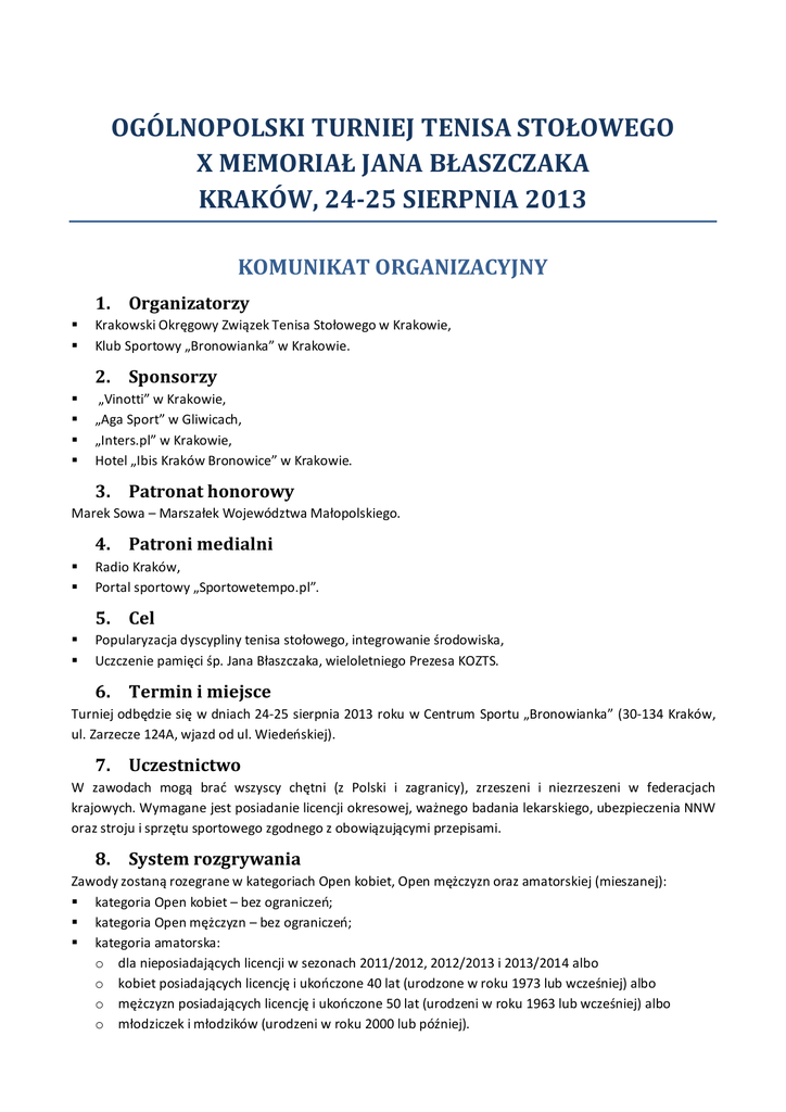 OGÓLNOPOLSKI TURNIEJ TENISA STOŁOWEGO X MEMORIAŁ JANA BŁASZCZAKA KRAKÓW, 24-25 SIERPNIA 2013 KOMUNIKAT ORGANIZACYJNY 1. Organizatorzy Krakowski Okręgowy Związek Tenisa Stołowego w Krakowie, Klub Sportowy „Bronowianka” w Krakowie. 2. Sponsorzy „Vinotti” w Krakowie, „Aga Sport” w Gliwicach, „Inters.pl” w Krakowie, Hotel „Ibis Kraków Bronowice” w Krakowie. 3. Patronat honorowy Marek Sowa – Marszałek Województwa Małopolskiego. 4. Patroni medialni Radio Kraków, Portal sportowy „Sportowetempo.pl”. 5. Cel Popularyzacja dyscypliny tenisa stołowego, integrowanie środowiska, Uczczenie pamięci śp. Jana Błaszczaka, wieloletniego Prezesa KOZTS. 6. Termin i miejsce Turniej odbędzie się w dniach 24-25 sierpnia 2013 roku w Centrum Sportu „Bronowianka” (30-134 Kraków, ul. Zarzecze 124A, wjazd od ul. Wiedeńskiej). 7. Uczestnictwo W zawodach mogą brać wszyscy chętni (z Polski i zagranicy), zrzeszeni i niezrzeszeni w federacjach krajowych. Wymagane jest posiadanie licencji okresowej, ważnego badania lekarskiego, ubezpieczenia NNW oraz stroju i sprzętu sportowego zgodnego z obowiązującymi przepisami. 8. System rozgrywania Zawody zostaną rozegrane w kategoriach Open kobiet, Open mężczyzn oraz amatorskiej (mieszanej): kategoria Open kobiet – bez ograniczeń; kategoria Open mężczyzn – bez ograniczeń; kategoria amatorska: o dla nieposiadających licencji w sezonach 2011/2012, 2012/2013 i 2013/2014 albo o kobiet posiadających licencję i ukończone 40 lat (urodzone w roku 1973 lub wcześniej) albo o mężczyzn posiadających licencję i ukończone 50 lat (urodzeni w roku 1963 lub wcześniej) albo o młodziczek i młodzików (urodzeni w roku 2000 lub później). Warunkiem rozegrania kategorii jest zgłoszenie co najmniej ośmiu uczestników. Kategorie zostaną rozegrane systemem mieszanym: turniej grupowy, po czym turniej główny systemem pucharowym, z grami o 3. miejsca. Wszystkie gry do trzech wygranych setów (poza finałami – do czterech). Każdy zawodnik rozegra minimum 3 gry. 9. Program 23 sierpnia (piątek) 1500 otwarcie biura zawodów 24 sierpnia (sobota) 815 losowanie grup turnieju Open mężczyzn 930 początek turnieju grupowego Open mężczyzn (duża hala) 940 losowanie grup turniejów Open kobiet oraz amatorskiego 00 10 początek turnieju grupowego Open kobiet (mała hala) 15 12 początek turnieju grupowego amatorskiego (mała hala) Po zakończeniu rozgrywek w grupach odbędzie się losowanie turniejów głównych. 1400 początek turniej głównego 25 sierpnia (niedziela) 900 turniej główny 00 11 finały 00 12 ceremonia dekoracji (obecność dekorowanych zawodników obowiązkowa) Szczegółowy program zawodów zostanie podany po zamknięciu listy zgłoszeń. 10. Zgłoszenia, rezerwacja noclegów Zgłoszenia wyłącznie za pomocą elektronicznej karty zgłoszeniowej, którą wraz z potwierdzeniem dokonania opłaty wpisowego należy przesłać w terminie 18 sierpnia 2013 na adres e-mail [email protected]. Zamówienia noclegów również poprzez elektroniczną kartę zgłoszeniową. Po tym terminie Organizator nie gwarantuje noclegów. Organizator zastrzega sobie prawo dokonania zmian w zamówionych noclegach. Należność za zamówienie po otrzymaniu potwierdzenia należy wpłacić na konto Krakowskiego Okręgowego Związku Tenisa Stołowego: Bank Pocztowy 31 1320 1465 2897 8431 2000 0001 (30-134 Kraków, ul. Zarzecze 124A). Prosimy o zabranie na zawody potwierdzenia wpłaty. Zamówienie uznaje się za zrealizowane po dokonaniu przedpłaty. Zawodnicy bez zgłoszenia nie będą dopuszczeni do turnieju. 11. Koszt wpisowego, noclegów Wpisowe: 25 zł za udział w turnieju Open bądź amatorskim, 35 zł za udział w obu turniejach. Noclegi: hotel „Ibis Kraków Bronowice” (1,5 km) – 65 zł za osobę (pokoje 2 osobowe z łazienką). Koszty dojazdu, noclegów i wpisowego ponoszą zawodnicy, pozostałe koszty pokrywa Organizator. 12. Biuro zawodów Uczestnicy zgłaszają się do biura zawodów, które zlokalizowane będzie w miejscu zawodów. Biuro czynne będzie przez całe zawody. 13. Nagrody Pula nagród wynosi 26 500 zł. Wartość nagród za poszczególne miejsca netto: Open Open Amatorski mężczyzn kobiet 1. 6 250 (bon 6 000) 4 200 (bon 4 000) 2 150 (bon 2 000) 2. 3 150 (bon 3 000) 2 150 (bon 2 000) 1 100 (bon 1 000) 3. 1 600 (bon 1 500) 1 300 (bon 1 200) 500 4. 1 100 (bon 1 000) 900 (bon 800) 300 5.-8. 200 150 100 Część nagród realizowana jest w postaci bonów towarowych, których wartość podano w nawiasach. Bony można wykorzystać w salonie meblowym Vinotti. Oprócz nagród we wszystkich kategoriach puchary za miejsca 1.-4. oraz dyplomy za miejsca 1.-8. 14. Sprzęt sportowy Stoły Andro, piłeczki Andro ***. Projekt zrealizowano przy wsparciu finansowym Województwa Małopolskiego. Projekt jest współfinansowany ze środków Gminy Miejskiej Kraków. Za Organizatorów, Kazimierz Skrzypek Prezes Krakowskiego Okręgowego Związku Tenisa Stołowego