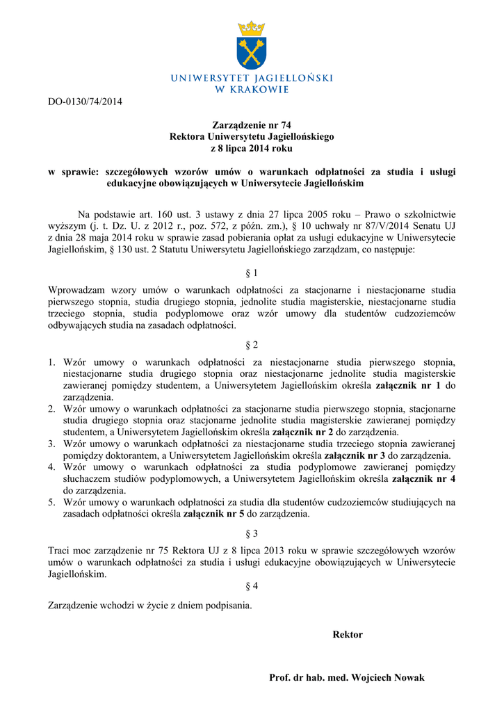 Zarządzenie nr 74 Rektora UJ z dnia 8 lipca 2014 r.