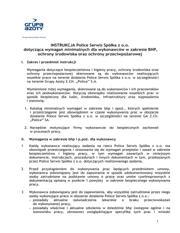 INSTRUKCJA Police Serwis Spółka z o.o. dotycząca wymagań minimalnych dla wykonawców w zakresie BHP, ochrony środowiska oraz ochrony przeciwpożarowej I. Zakres i przedmiot instrukcji Wymagania dotyczące bezpieczeństwa i higieny pracy, ochrony środowiska oraz ochrony przeciwpożarowej skierowane są do wykonawców realizujących wszelkie prace na terenie działania Police Serwis Spółka z o.o. w szczególności na terenie Grupy Azoty Z.CH. „Police” S.A. Wymienione niżej wymagania, skierowane są do wykonawców i ich pracowników oraz ich podwykonawców. Dotyczą obowiązku realizowania wszelkich prac w sposób bezpieczny dla ludzi, środowiska, infrastruktury oraz wyposażenia i stanowią: 1. Katalog minimalnych wymagań w zakresie bhp i ppoż., których spełnienie i przestrzeganie jest obowiązkiem w czasie wykonywania prac w obszarze działania Police Serwis Spółka z o.o. w szczególności na terenie GA Z.Ch. „Police” SA. 2. Narzędzie motywujące w procesach pracy. firmy wykonawcze do bezpiecznych zachowań II. Wymagania w zakresie bhp i p.poż. dla wykonawcy 1 Każdy wykonawca realizujący zadania na rzecz Police Serwis Spółka z o.o. ma obowiązek przestrzegania i stosowania się do wymagań przepisów i zasad w zakresie bezpieczeństwa i higieny pracy, w tym wymagań zawartych w niniejszym dokumencie, instrukcjach, procedurach i innych dokumentach w tym, przekazanych przez Police Serwis Spółka z o.o. dotyczących realizowanego zadania. 2 Przed przystąpieniem do wykonywania prac będących przedmiotem umowy, wykonawca zobowiązany jest do zapoznania w sposób udokumentowany wszystkie osoby zatrudnione na podstawie umowy o pracę oraz umów cywilnoprawnych z dokumentacją opisaną w punkcie 1 powyżej w zakresie bezpiecznego wykonywania pracy. 3 Wykonawca zobowiązany jest do zapewnienia, aby wszystkie zatrudnione przez niego osoby wykonujące prace w obszarze działania Police Serwis Spółka z o.o.: − posiadały aktualne zaświadczenia lekarskie o braku przeciwwskazań do wykonywanej pracy, − posiadały właściwe i aktualne szkolenia w dziedzinie bhp (wstępne ogólne i na stanowisku pracy, okresowe) uwzględniające specyfikę tych prac i wnioski 1 − − − − z przeprowadzonej oceny ryzyka zawodowego oraz postanowienia zasad alarmowania w przypadku zdarzeń pożarowych, awarii chemicznych i innych miejscowych zagrożeń oraz ewakuacji. odbyły instruktaże stanowiskowe na stanowiskach realizowanych prac, tematycznie powiązane z prowadzonymi pracami, wykorzystywanymi maszynami, urządzeniami, wyposażeniem technicznym oraz zagrożeniami dla życia i zdrowia i sposobami ograniczania lub eliminowania zagrożeń wypadkowych, posiadały kwalifikacje i uprawnienia właściwe do wykonywanych prac, wyposażone były we właściwe i sprawne środki ochrony indywidualnej, odzież i obuwie, w szczególności: kaptury ucieczkowe wyposażone we właściwe pochłaniacze, okulary ochronne, gogle, kamizelkę ostrzegawczą, hełm ochronny, środki chroniące przed upadkiem z wysokości, ochrony rąk, twarzy, słuchu itp. właściwie dobrane w zależności od występujących zagrożeń, poświadczyły własnoręcznym podpisem zapoznanie się z poszczególnymi dokumentami, instrukcjami, procedurami i wynikającymi z nich obowiązkami, wymaganiami i zasadami bhp i p.poż. oraz zobowiązały się na piśmie do przestrzegania nałożonych na nich obowiązków w zakresie bhp podczas realizacji prac w obszarze Police Serwis Spółka z o.o. 4 Przed przystąpieniem do pracy w obszarze działania Police Serwis Spółka z o.o. wykonawca zobowiązany jest opracować, prowadzić i przechowywać niezbędną dokumentację w zakresie BHP, w tym: • Ocenę Ryzyka Zawodowego dla realizowanego zadania, • Instrukcję Bezpiecznego Wykonywania Robót (IBWR) obejmującą: − opis zakresu i rodzaju wykonywanych prac, − określenie materiałów, urządzeń, maszyn, technologii, przy użyciu których będą wykonywane prace, − określenie środków ostrożności, instrukcji i zaleceń bhp, jakie należy zachować przy wykonywaniu prac, − wykaz środków ochrony indywidualnej z jakich i gdzie należy korzystać , − instrukcję bezpieczeństwa pożarowego, plan ewakuacji. − wykaz podwykonawców z danymi teleadresowymi. • Plan BIOZ gdy jest wymagany, • Instrukcje bhp maszyn, urządzeń, narzędzi i innego stosowanego wyposażenia. 5 Wykonawca ma obowiązek przedstawić do wglądu oryginały lub poświadczone przez siebie kopie powyższych dokumentów oraz innych dokumentów dotyczących bezpieczeństwa, organizacji i realizacji zadania. 6 Wykonawca zobowiązany jest w czasie wykonywania prac w obszarze działania Police Serwis Spółka z o.o. do zapewnienia i sprawowania: • Skutecznego nadzoru nad realizacją zadania lub zespołu zadań, • Skutecznego i bezpośredniego nadzoru w przypadku wykonywania prac szczególnie niebezpiecznych. Wykonawca wyznacza osobę do właściwego nadzoru, podając imię, nazwisko, stanowisko oraz nr telefonu kontaktowego i powyższe informacje przekazuje do Police Serwis Spółka z o.o. 7 Osoba sprawująca nadzór w zakresie BHP po stronie wykonawcy ma obowiązek stałej obecności w miejscu realizacji robót, a jeśli zachodzi konieczność czasowego opuszczenia przez nią miejsca prowadzenia prac, powinna wyznaczyć swojego 2 zastępcę, co powinno zostać zgłoszone do wykonawcy oraz koordynatorowi robót. 8 Wykonawca oświadcza, że: • Wszystkie zatrudnione przez niego osoby wykonujące pracę w obszarze działania Police Serwis Spółka z o.o., w tym prace szczególnie niebezpieczne, posiadają aktualne orzeczenia lekarskie o braku przeciwwskazań zdrowotnych do wykonywania tych prac, • Wszystkie zatrudnione przez niego osoby posiadają uprawnienia kwalifikacyjne właściwe do rodzaju prac wykonywanych w ramach zadania. • Wszystkie osoby zatrudnione przez niego przy realizacji zadania korzystają przy zabezpieczeniu prac pożaro