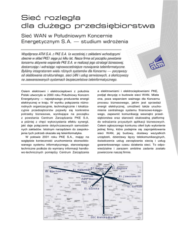 Sieć rozległa dla dużego przedsiębiorstwa Sieć WAN w Południowym Koncernie Energetycznym S.A. — studium wdrożenia Współpraca ATM S.A. z PKE S.A. (a wcześniej z zakładami wchodzącymi obecnie w skład PKE) sięga już kilku lat. Nasza firma od początku powstania koncernu aktywnie wspierała PKE S.A. w realizacji jego strategii biznesowej, dostarczając i wdrażając najnowocześniejsze rozwiązania teleinformatyczne. Byliśmy integratorem wielu różnych systemów dla Koncernu — począwszy od okablowania strukturalnego, sieci LAN i usług serwisowych, a skończywszy na zaawansowanych systemach bezpieczeństwa teleinformatycznego. Osiem elektrowni i elektrociepłowni z południa Polski utworzyło w 2000 roku Południowy Koncern Energetyczny — największego producenta energii elektrycznej w kraju. W wyniku połączenia różnorodnych organizacyjnie, technologicznie i lokalizacyjnie przedsiębiorstw pojawiły się konkretne potrzeby biznesowe, wynikające na początku z powstania Centrum Zarządzania PKE S.A, a później z chęci wykorzystania efektu synergii, jaki daje połączenie dotychczasowych samodzielnych zakładów. Istotnym narzędziem do zaspokojenia tych potrzeb okazała się teleinformatyka. W połowie 2001 roku PKE S.A., mając na względzie konieczność uruchomienia skonsolidowanego systemu informatycznego, stanowiącego techniczne podłoże do wymiany informacji handlowo-technicznych pomiędzy Centrum Zarządzania El. Blachownia El. Halemba a elektrowniami i elektrociepłowniami PKE, podjął decyzję o budowie sieci WAN. Miała ona, poza wsparciem ważnego dla Koncernu procesu biznesowego, jakim jest sprzedaż energii elektrycznej, umożliwić także uruchomienie centralnego systemu finansowo-księgowego, zapewnić komunikację wewnątrz przedsiębiorstwa oraz stanowić skalowalną platformę do wdrażania przyszłych aplikacji biznesowych. Celem ogłoszonego konkursu ofert było wyłonienie jednej firmy, która podejmie się zaprojektowania sieci WAN, jej budowy, dostawy wszystkich urządzeń, dzierżawy łączy telekomunikacyjnych, świadczenia usług zarządzania siecią i usług gwarantowanego czasu działania sieci. To odpowiedzialne i zarazem ambitne zadanie zostało powierzone naszej firmie. EC Katowice El. £agisza Centrum Zarz¹dzania PKE El. £aziska ZEC Bielsko-Bia³a El. Jaworzno III El. Siersza PKE nie powstał od zera — składa się nań osiem uprzednio samodzielnych zakładów o różnym stopniu zinformatyzowania czy wręcz różnej kulturze teleinformatycznej. Budowa sieci WAN nie polegała wyłącznie na budowie samej sieci, ale też na integracji tych kultur teleinformatycznych. Poszczególne zakłady posiadały odpowiednie struktury techniczne w postaci komputerów, serwerów, aplikacji, sieci LAN, systemów bezpieczeństwa oraz odpowiedni wykwalifikowany personel wydziałów informatyki. O ich różnorodności świadczyć może fakt, że ilość komputerów wykorzystywana w sieciach lokalnych wahała się od kilkudziesięciu do kilkuset. W ramach budowy sieci WAN dla PKE, poza typowymi czynnościami dla takiej instalacji, wykonaliśmy wiele innych prac, w tym m.in.: zaprojektowanie i readresację sieci w poszczególnych zakładach, modyfikację istniejących strategii bezpieczeństwa sieciowego, adaptację sieci lokalnych poszczególnych elektrowni, przebudowę systemów firewall, zestawienie odpowiednich łączy, budowę radiolinii, dokonanie odpowiednich uzgodnień z podmiotami współpracującymi z PKE (w tym szczególnie z PSE). Szybka sieć WAN została zbudowana w technologii ATM (w oparciu o urządzenia firmy Cisco Systems) na bazie łączy telekomunikacyjnych. O wyborze tej technologii zdecydowała konieczność zapewnienia QoS na właściwym poziomie, zagwarantowanie odpowiedniej separacji ruchu, bezpieczeństwa transmisji i elastyczności w przyszłej rozbudowie. Wymaganie ciągłości działania kluczowych aplikacji biznesowych spowodowało, że sieć korzysta z łączy podstawowych i rezerwowych, tak aby zawsze aplikacje te były dostępne. Realizacja sieci wymagała od nas dużej odpowiedzialności — wielokrotnie musieliśmy wykonywać prace na „żywym organizmie”, pod presją działających on-line systemów, przeznaczonych do wymiany informacji handlowej i technicznej z Operatorem Systemu Przesyłowego w ramach rynku dobowego-godzinowego. Obecnie sieć pokrywa obszar w promieniu 100 kilometrów od Katowic i nie ma żadnych przeszkód, aby w przyszłości, w miarę rozbudowy PKE, włączać do niej kolejne zakłady. Na centralny punkt sieci WAN wybrano Centrum Zarządzania PKE. Stało się tak ze względu na konfigurację istniejącej struktury teleinformatycznej, jak i z powodu racjonalizacji kosztów eksploatacji łączy — Katowice stanowią mniej więcej geograficzny środek lokalizacji poszczególnych zakładów PKE. W rezultacie Południowy Koncern Energetyczny otrzymał w pełni skalowalną sieć szkieletową WAN, obejmującą wszystkie zakłady koncernu. Zaspokoiła ona aktualne potrzeby i usprawniła procesy biznesowe w PKE, umożliwiła wdrożenie centralnego systemu finansowo-księgowego oraz zapewniła bezpieczny obieg wewnętrznej poczty elektronicznej. Obecne aplikacje pracują w sieci WAN w pełni stabilnie i bez opóźnień, a sama sieć może być rozbudowywana, gdy trzeba będzie przyłączyć do niej nowe zakłady lub wdrożyć przyszłe aplikacje. Zastosowana technologia gwarantuje osiągnięcie oczekiwanych parametrów oraz pozwala elastycznie skalować przepływności, co pozwala na nieograniczony rozwój systemów teleinformatycznych w PKE. Powierzenie naszej firmie obsługi tej sieci i zawarcie odpowiedniej umowy o gwarantowanym poziomie usług pozwoliło PKE zracjonalizować wydatki na bieżącą eksploatację siecią WAN bez konieczności tworzenia rozbudowanych własnych struktur i przy zachowaniu odpowiedniego bezpieczeństwa ciągłości pracy kluczowych aplikacji biznesowych w rozprosz