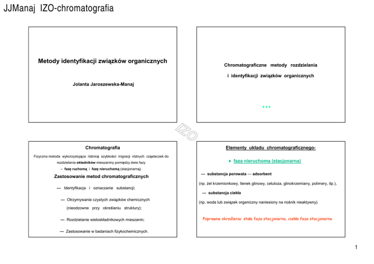 JJManaj IZO-chromatografia Metody identyfikacji związków organicznych Chromatograficzne metody rozdzielania i identyfikacji związków organicznych Jolanta Jaroszewska-Manaj ♦♦♦ #1 #2 1 2 Chromatografia Elementy układu chromatograficznego: Fizyczna metoda wykorzystująca różnicę szybkości migracji różnych cząsteczek do rozdzielania składników mieszaniny pomiędzy dwie fazy ♦ faza nieruchoma (stacjonarna) – fazę ruchomą i fazę nieruchomą (stacjonarną). — substancja porowata — adsorbent Zastosowanie metod chromatograficznych (np. żel krzemionkowy, tlenek glinowy, celuloza, glinokrzemiany, polimery, itp.), — Identyfikacja i oznaczanie substancji; — substancja ciekła — Otrzymywanie czystych związków chemicznych (np. woda lub związek organiczny naniesiony na nośnik nieaktywny). (nieodzowne przy określaniu struktury); Poprawne określenia: stała faza stacjonarna, ciekła faza stacjonarna — Rozdzielanie wieloskładnikowych mieszanin; — Zastosowanie w badaniach fizykochemicznych. IZO - Chromatografia IZIZOObszar stopki #3 #4 3 4 1 JJManaj IZO-chromatografia Elementy układu chromatograficznego: Elementy ♦ faza ruchoma układu chromatograficznego: ♦ substancja chromatografowana — Ciecz • rozpuszczalnik lub układ rozpuszczalników, poruszający się względem fazy stacjonarnej działaniem sił kapilarnych, na skutek swobodnego przepływu, składniki rozdzielanej mieszaniny lub pod ciśnieniem. Ciekła faza ruchoma jest nazywana eluentem. — Gaz • wprowadzany pod ciśnieniem. Gazowa faza ruchoma jest nazywana gazem nośnym; #5 #6 5 6 #7 #8 7 8 Jak przebiega proces chromatograficzny na przykładzie chromatografii adsorpcyjnej IZO - Chromatografia IZIZOObszar stopki 2 JJManaj IZO-chromatografia Elementy układu chromatograficznego wzajemnie ze sobą oddziałują ! Rodzaje technik chromatograficznych Chromatografia planarna Fazę stacjonarną stanowi płaszczyzna. Chromatografia kolumnowa Faza stacjonarna umieszczona jest w rurce szklanej lub metalowej. #9 #10 9 10 Chromatografia cienkowarstwowa Rodzaje technik chromatograficznych Chromatografia adsorpcyjna Rozdzielanie związków organicznych techniką TLC – najprostsze, najszybsze, najtańsze Fazę stacjonarną stanowi adsorbent. • faza stacjonarna ― adsorbent na płytce • faza ruchoma roztwór rozwijający - eluent ― Chromatografia podziałowa Analizę wykonuje się Fazę stacjonarną stanowi ciecz niemieszająca się z fazą ruchomą. - na płaskiej powierzchni, - najczęściej pod ciśnieniem atmosferycznym, - w temperaturze pokojowej. #11 11 IZO - Chromatografia IZIZOObszar stopki #12 (TLC – thin Layer Chromatography) 12 3 JJManaj IZO-chromatografia Nanoszenie roztworów substancji badanej W technice chromatografii cienkowarstwowej do nanoszenia na płytkę stosujemy rozpuszczalnik, w którym związek najlepiej się rozpuszcza. IZO - Chromatografia IZIZOObszar stopki #13 #14 13 14 #15 #16 15 16 4 JJManaj IZO-chromatografia Wynik chromatografii poziomej Wywoływanie chromatogramów - Identyfikacja plamek barwnych związków; - Identyfikacja plamek związków fluoryzujących w świetle UV; - Stosowanie adsorbentów z indykatorem i identyfikacja plamek w świetle UV; - Wizualizacja związków z wiązaniami wielokrotnymi w parach jodu; - Spryskiwanie odczynnikami wywołującymi (np. ninhydryna, FeCl3, itp); - Działanie manganianem (VII) potasu – utlenianie plamek; - Działanie stężonym kwasem siarkowym – rozkład związku w plamce; #17 densytogram plamki na płytce 17 - Wypalanie płytek w wysokiej temperaturze; - Itp. #18 18 Wizualizacja chromatogramów IZO - Chromatografia IZIZOObszar stopki #19 #20 19 20 5 JJManaj IZO-chromatografia Współczynniki retencji #21 #22 21 22 Chromatografia cienkowarstwowa IZO - Chromatografia IZIZOObszar stopki #23 #24 23 24 6 JJManaj IZO-chromatografia Chromatografia cienkowarstwowa Powtarzalność wartości Rf ● skład eluentu ● aktywność adsorbentu ● wpływ temperatury (zmiany składu fazy ruchomej, zmiany rozpuszczalności substancji). ● kondycjonowanie komory - nasycenie komory parami eluentu; #25 #26 25 26 Dobór warunków chromatografii cienkowarstwowej eluenty IZO - Chromatografia IZIZOObszar stopki #27 #28 27 28 7 JJManaj IZO-chromatografia Określenie polarności rozpuszczalnika współczynniki polarności E Szereg eluotropowy rozpuszczalników Rozpuszczalnik #29 Współczynnik E Stała dielektryczna n-Pentan 0,00 1,84 Toluen 0,29 2,38 Chloroform 0.40 4,80 Aceton 0.56 21,40 Metanol 0.95 33,60 29 #30 30 Obliczanie polarności eluentu: E obl. = Wpływ rozpuszczalnika x E1 + x E2 + ……..x En x = ułamek objętościowy Szereg eluotropowy wskazuje jak wzrasta siła wymywania. En = wartość E czystego rozpuszczalnika Przykład: E1 - chloroform, E2 - metanol Kolejność rozpuszczalników zależy od rodzaju adsorbentu! 25 cm3 CHCl3 + 75 cm3 MeOH E (CHCl3) = 0,40 E (MeOH) = 0,88 IZO - Chromatografia IZIZOObszar stopki Przykład – szereg eluotropowy dla silikażelu: #31 #32 31 32 8 JJManaj IZO-chromatografia Wymogi względem rozpuszczalników stosowanych jako eluenty — mają odpowiednie właściwości chemiczne (polarność), Dobór warunków chromatografii cienkowarstwowej — są dostępne, niedrogie, adsorbenty — są czyste, — są nie reaktywne (względem adsorbentu i adsorbatu), — odznaczają się średnią lotnością. #33 #34 33 34 Aktywność adsorbentów Podział adsorbentów względem polarności: Podział adsorbentów względem mocy: S : sacharoza, celuloza Polarne: SiO2, Al2O3 skrobia Słabo polarne: MgO, talk, węglan sodu Ś : Niepolarne: węglan wapnia CaCO3 węgiel aktywowany, talk tlenek magnezu (nieaktywowany) S : silikażel tlenek glinu tlenek magnezu (aktywowany) węgiel aktywowany IZO - Chromatografia IZIZOObszar stopki #35 #36 35 36 9 JJManaj IZO-chromatografia Typy oddziaływań adsorbentów Podział adsorbentów względem charakteru chemicznego: I Typ – brak na powierzchni grup aktywnych lu