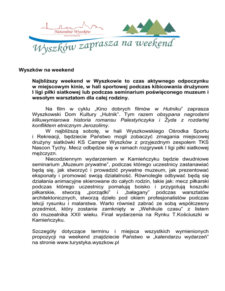 Wyszków na weekend Najbliższy weekend w Wyszkowie to czas aktywnego odpoczynku w miejscowym kinie, w hali sportowej podczas kibicowania drużynom I ligi piłki siatkowej lub podczas seminarium poświęconego muzeum i wesołym warsztatom dla całej rodziny. Na film w cyklu „Kino dobrych filmów w Hutniku” zaprasza Wyszkowski Dom Kultury „Hutnik”. Tym razem obsypana nagrodami kilkuwymiarowa historia romansu Palestyńczyka i Żyda z rozdartej konfliktem etnicznym Jerozolimy. W najbliższą sobotę, w hali Wyszkowskiego Ośrodka Sportu i Rekreacji, będziecie Państwo mogli zobaczyć zmagania miejscowej drużyny siatkówki KS Camper Wyszków z przyjezdnym zespołem TKS Nascon Tychy. Mecz odbędzie się w ramach rozgrywek I ligi piłki siatkowej mężczyzn. Niecodziennym wydarzeniem w Kamieńczyku będzie dwudniowe seminarium „Muzeum prywatne”, podczas którego uczestnicy zastanawiać będą się, jak stworzyć i prowadzić prywatne muzeum, jak prezentować eksponaty i promować swoją działalność. Równolegle odbywać będą się działania animacyjne skierowane do całych rodzin, takie jak: mecz piłkarski podczas którego uczestnicy pomalują boisko i przygotują koszulki piłkarskie, stworzą „porządki” i „bałagany” podczas warsztatów architektonicznych, stworzą dzieło pod okiem profesjonalistów podczas lekcji rysunku i malarstwa. Warto również zabrać ze sobą współczesny przedmiot, który zostanie zamknięty w „Wehikule czasu” z listem do muzealnika XXII wieku. Finał wydarzenia na Rynku T.Kościuszki w Kamieńczyku. Szczegóły dotyczące terminu i miejsca wszystkich wymienionych propozycji na weekend znajdziecie Państwo w „kalendarzu wydarzeń” na stronie www.turystyka.wyszkow.pl 12.10.2013r. (sobota) 9.00 – 17.00 „Muzeum prywatne” – seminarium w Kamieńczyku, Miejsce: Muzeum Etnograficzno-Historyczne, Rynek T.Kościuszki 14, Kamieńczyk; Ośrodek PTTK „Ursus” Kamieńczyk Wstęp: wolny 12.00 – 19.00 „Muzeum prywatne” – otwarte warsztaty w Kamieńczyku, Miejsce: Rynek T.Kościuszki, Kamieńczyk OSP Kamieńczyk Wstęp: wolny 18.00 I Liga Piłki Siatkowej Mecz KS Camper Wyszków – TKS Nascon Tychy Miejsce: hala sportowa Wyszkowskiego Ośrodka Sportu i Rekreacji, ul.Geodetów 45 (wejście B) Wyszków Wstęp: Bilet normalny - 10 PLN Bilet ulgowy - 5 PLN do 16 roku życia - wejście darmowe 19.00 „W ciemno” reż.Michael Mayerl, USA, Izrael, Palestyna 2012 Miejsce: Wyszkowski Ośrodek Kultury „Hutnik”, ul.Prosta 7 Wstęp: bilet - 12 zł. 13.10.2013r. (niedziela) 9.00 – 16.00 „Muzeum prywatne” – seminarium w Kamieńczyku, Miejsce: Ośrodek PTTK „Ursus” Kamieńczyk Wstęp: wolny 11.00 – 15.30 „Muzeum prywatne” – otwarte warsztaty w Kamieńczyku, Miejsce: Muzeum Etnograficzno-Historyczne, Rynek T.Kościuszki 14, Kamieńczyk Rynek T.Kościuszki, Kamieńczyk OSP Kamieńczyk Wstęp: wolny 19.00 „W ciemno” reż.Michael Mayerl, USA, Izrael, Palestyna 2012 Miejsce: Wyszkowski Ośrodek Kultury „Hutnik”, ul.Prosta 7 Wstęp: bilet - 12 zł.
