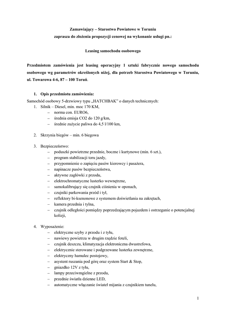 Zamawiający – Starostwo Powiatowe w Toruniu zaprasza do złożenia propozycji cenowej na wykonanie usługi pn.: Leasing samochodu osobowego Przedmiotem zamówienia jest leasing operacyjny 1 sztuki fabrycznie nowego samochodu osobowego wg parametrów określonych niżej, dla potrzeb Starostwa Powiatowego w Toruniu, ul. Towarowa 4-6, 87 – 100 Toruń. 1. Opis przedmiotu zamówienia: Samochód osobowy 5-drzwiowy typu „HATCHBAK” o danych technicznych: 1. Silnik – Diesel, min. moc 170 KM, norma con. EURO6, średnia emisja CO2 do 120 g/km, średnie zużycie paliwa do 4,5 l/100 km, 2. Skrzynia biegów – min. 6 biegowa 3. Bezpieczeństwo: poduszki powietrzne przednie, boczne i kurtynowe (min. 6 szt.), program stabilizacji toru jazdy, przypomnienie o zapięciu pasów kierowcy i pasażera, napinacze pasów bezpieczeństwa, aktywne zagłówki z przodu, elektrochromatyczne lusterko wewnętrzne, samokalibrujący się czujnik ciśnienia w oponach, czujniki parkowania przód i tył, reflektory bi-ksenonowe z systemem doświetlania na zakrętach, kamera przednia i tylna, czujnik odległości pomiędzy poprzedzającym pojazdem i ostrzeganie o potencjalnej kolizji, 4. Wyposażenie: elektryczne szyby z przodu i z tyłu, nawiewy powietrza w drugim rzędzie foteli, czujnik deszczu, klimatyzacja elektroniczna dwustrefowa, elektrycznie sterowane i podgrzewane lusterka zewnętrzne, elektryczny hamulec postojowy, asystent ruszania pod górę oraz system Start & Stop, gniazdko 12V z tyłu, lampy przeciwmgielne z przodu, przednie światła dzienne LED, automatyczne włączanie świateł mijania z czujnikiem tunelu, 1 sterowanie radiem w kole kierownicy, dodatkowe oświetlenie wnętrza oraz lampki do czytania z przodu i z tyłu, radio z nawigacją i panelem dotykowym min. 7”, koło zapasowe lub koło dojazdowe. 5. Kolor nadwozia: metalik zielony szmaragdowy (emerald). Dostarczony samochód musi spełniać polskie wymagania, w tym warunki techniczne, wynikające z ustawy z dnia 20.06.1997 r. Prawo o ruchu drogowym (tj. Dz. U. 2012, poz. 1137 z późn. zm.) i określone w rozporządzeniu Ministra Infrastruktury z dnia 31 grudnia 2002 roku w sprawie warunków technicznych pojazdów oraz zakresu ich niezbędnego wyposażenia (Dz. U. z 2015, poz. 305). Kody cpv: 34110000 - 1 Samochody osobowe 66114000 - 2 Usługi leasingu operacyjnego 66000000 - 0 Usługi finansowe i ubezpieczeniowe 66510000 - 8 Usługi ubezpieczeniowe 2. Termin realizacji zamówienia. Wydanie samochodu w ciągu 30 dni od dnia podpisania umowy. Leasing 48 miesięcy w równych, stałych przez cały okres kredytowania ratach. Możliwość wykupienia samochodu po tym terminie. 3. Pozostałe warunki zamówienia: Opłata wstępna 5%. Opłata manipulacyjna 0 %. Koszty: serwisu i napraw w limicie 135 000 km, ubezpieczenia OC, AC, NNW i ASSISTANCE na kraje Unii Europejskiej w trakcie trwania umowy ponoszone będą przez zamawiającego. Koszty powstałe przed przekazaniem przedmiotu leasingu, takie jak transport do siedziby zamawiającego, rejestracja i inne ponosi wykonawca. Terminy płatności oraz wysokość rat leasingowych zostaną określone w umowie leasingowej. 4. Kryterium oceny ofert: najniższa cena 5. Termin i miejsce składania ofert. Ofertę należy złożyć w zamkniętej kopercie, w siedzibie zamawiającego – kancelaria, pokój nr 100, ul. Towarowa 4-6, Toruń do dnia 19 marca 2015 r. godz. 10. Na kopercie proszę zamieścić następujące informacje: imię i nazwisko/firmę, adres Wykonawcy i nazwę zamówienia tj. Leasing samochodu osobowego. 2 6. W załączeniu: formularz oferty, wzór umowy, protokół przekazania przedmiotu leasingu. 3