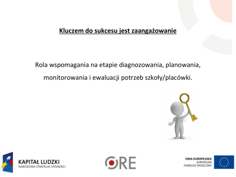 Kluczem do sukcesu jest zaangażowanie Rola wspomagania na etapie diagnozowania, planowania, monitorowania i ewaluacji potrzeb szkoły/placówki. Duża Rada Pedagogiczna TŁO 1 Praca z dorosłymi ROZPOCZYNAJĄC DYSKUSJĘ: określ cele, jakie chcesz osiągnąć podczas spotkania, powiedz krótko, jak będzie wyglądał przebieg spotkania (agenda), określ czas jego trwania, ustal zasady pracy na czas „warsztatu”. Zaciekaw….. Uruchom kreatywne myślenie…. Umysł jest jak spadochron – jest z niego użytek gdy…….. 5 CEL Proces grupowy to wszystko, co się dzieje, gdy ludzie skupieni wokół jakiegoś celu zaczynają ze sobą rozmawiać. Aby zacząć ze sobą rozmawiać trzeba stworzyć do tego warunki….. Zadbać o proces grupowy to: tworzyć przyjazne środowisko i zarządzać procesem, jeśli zajdzie taka potrzeba, zaangażować wszystkich uczestników i umożliwić ujawnienie potencjału grupy jako całości: jak? doprowadzając do nawiązania interakcji, wspierając interakcje oraz dbając o wzajemne zrozumienie, wzmacniając zaangażowanie Czego potrzebujemy, żeby szkoła była lepsza? Które obszary pracy naszej szkoły wymagają zmiany lub rozwoju? Czego potrzeba waszej szkole by zaszła pozytywna zmiana? Rozstanie się z wizją wyłącznie zewnętrznej odpowiedzialności za niemożność wprowadzenia zmian. Na co mamy wpływ? Selekcja pomysłów w oparciu o wybrane kryteria: Co jest dla was WAŻNE? Co ma kluczowy wpływ na inne obszary? Co jest pilne? Co może poczekać? Od czego zaczniemy? Dlaczego od tego? Warsztat diagnostyczno- rozwojowy Skutek: • rozpoczęcie rozmów na określony temat, •autentyczne zaangażowanie się nauczycieli w poszukanie możliwości rozwoju poprzez swoją pracę, •pojawianie się stwierdzenia: „mamy rozwiązanie” już na etapie diagnozy. Wspieraj… • informuj ludzi o zmianie i na czym ona polega; • daj ludziom szansę pożegnać się z przeszłością, potem pokazuj korzyści; • okazuj zrozumienie dla negatywnych reakcji; • więcej słuchaj, mniej mów; • pomagaj dostrzec POZYTYWNE aspekty zmiany; • uświadom stratę, jeśli ktoś nie przejdzie zmiany; • pozostaw WOLNOŚĆ WYBORU; • zachęcaj do podejmowania prób. DZIĘKUJĘ ZA UWAGĘ MARIOLA SOCHACKA Projekt współfinansowany z Unii Europejskiej w ramach Europejskiego Funduszu Społecznego