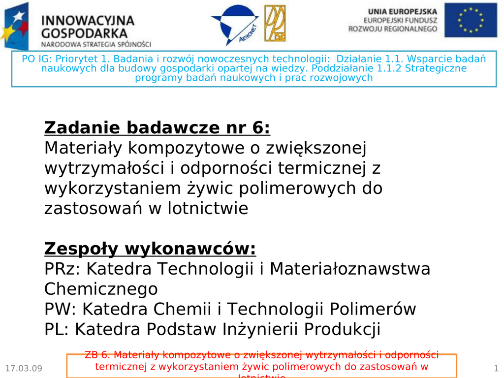 PO IG: Priorytet 1. Badania i rozwój nowoczesnych technologii: Działanie 1.1. Wsparcie badań naukowych dla budowy gospodarki opartej na wiedzy. Poddziałanie 1.1.2 Strategiczne programy badań naukowych i prac rozwojowych Zadanie badawcze nr 6: Materiały kompozytowe o zwiększonej wytrzymałości i odporności termicznej z wykorzystaniem żywic polimerowych do zastosowań w lotnictwie Zespoły wykonawców: PRz: Katedra Technologii i Materiałoznawstwa Chemicznego PW: Katedra Chemii i Technologii Polimerów PL: Katedra Podstaw Inżynierii Produkcji 17.03.09 ZB 6. Materiały kompozytowe o zwiększonej wytrzymałości i odporności termicznej z wykorzystaniem żywic polimerowych do zastosowań w 1 PO IG: Priorytet 1. Badania i rozwój nowoczesnych technologii: Działanie 1.1. Wsparcie badań naukowych dla budowy gospodarki opartej na wiedzy. Poddziałanie 1.1.2 Strategiczne programy badań naukowych i prac rozwojowych 28,8 8,8 3,5 11,8 23,5 23,6 ogień na pokładzie terroryzm nieznane awaryjne lądowanie inne przyczyny (zła pogoda itp.) utrata kontroli nad samolotem Główne przyczyny katastrof w lotnictwie pasażerskim w minionej dekadzie wg Mouritz A. P., Fire Safety of Advanced Composites for Aircraft, ATSB RESEARCH AND ANALYSIS REPORT, 2006 17.03.09 ZB 6. Materiały kompozytowe o zwiększonej wytrzymałości i odporności termicznej z wykorzystaniem żywic polimerowych do zastosowań w 2 PO IG: Priorytet 1. Badania i rozwój nowoczesnych technologii: Działanie 1.1. Wsparcie badań naukowych dla budowy gospodarki opartej na wiedzy. Poddziałanie 1.1.2 Strategiczne programy badań naukowych i prac rozwojowych Kompozyty (polimerowe) Spoiwo polimerowe •Termoplasty •Duroplasty 17.03.09 (Anizotropowe) napełniacze wzmacniające •Włókna naturalne •Włókna syntetyczne •Włókna nieorganiczne •Inne (np. polimery ciekłokrystaliczne, wybrane nanonapełniacze itp.) Elementy ‘inteligencji’: Polimery ZB 6. Materiały kompozytowe o zwiększonej wytrzymałości i odporności termicznej z wykorzystaniem żywic polimerowych do zastosowań w przewodzące 3 PO IG: Priorytet 1. Badania i rozwój nowoczesnych technologii: Działanie 1.1. Wsparcie badań naukowych dla budowy gospodarki opartej na wiedzy. Poddziałanie 1.1.2 Strategiczne programy badań naukowych i prac rozwojowych Duroplasty •poliestry nienasycone wzrastająca odporność •aminoplasty termiczna •poliuretany •fenoplasty •epoksydy •poliimidy •polibenzoksazyny •polioksazolidony Istotne cechy użytkowe: •skurcz utwardzania •adhezja do napełniacza •lepkość (formowanie) •cena wszystkie duroplasty składają się z C, H, O, N i są palne 17.03.09 ZB 6. Materiały kompozytowe o zwiększonej wytrzymałości i odporności termicznej z wykorzystaniem żywic polimerowych do zastosowań w 4 PO IG: Priorytet 1. Badania i rozwój nowoczesnych technologii: Działanie 1.1. Wsparcie badań naukowych dla budowy gospodarki opartej na wiedzy. Poddziałanie 1.1.2 Strategiczne programy badań naukowych i prac rozwojowych Dotychczasowe metody poprawy odporności duroplastów na ogień (uniepalniania): •Wprowadzanie do struktury chemicznej halogenów (F, Cl, Br, I), rzadziej P lub Si •Napełniacze nieorganiczne • korzystnie zawierające antymon (synergia z halogenami) • zdolne do pochłaniania dużej ilości ciepła cne przepisy UE zabraniają stosowania halogenów i antymonu, k wytwarzają podczas pożaru toksyczny dym, w tym dioksyny 17.03.09 ZB 6. Materiały kompozytowe o zwiększonej wytrzymałości i odporności termicznej z wykorzystaniem żywic polimerowych do zastosowań w 5 PO IG: Priorytet 1. Badania i rozwój nowoczesnych technologii: Działanie 1.1. Wsparcie badań naukowych dla budowy gospodarki opartej na wiedzy. Poddziałanie 1.1.2 Strategiczne programy badań naukowych i prac rozwojowych Dlaczego epoksydy? • Najlepsze właściwości adhezyjne, mały skurcz podczas utwardzania • Zastosowanie zarówno jako spoiwo kompozytów, jak i kleje, szpachlówki i uszczelnienia • Zadowalająca wytrzymałość i odporność termiczna • Dostępność modyfikatorów uniepalniających, np. utwardzaczy • Doświadczenie zespołu w zakresie syntezy i modyfikacji duroplastów, w tym epoksydów, • Zaplecze przemysłowe (ZCh Ciech-Organika Sarzyna), względnie niska cena, • Współpraca z innymi ośrodkami naukowymi, aktywnymi w dziedzinie syntezy i modyfikacji epoksydów, w tym syntezy żywic zawierających krzem (Uniwersytet AM w Poznaniu, Instytut Chemii Makromolekularnej w Pradze) • Mogą być w syntezieożywic polioksazolidonowych i ZB surowcem 6. Materiały kompozytowe zwiększonej wytrzymałości i odporności termicznej z wykorzystaniem żywic polimerowych do zastosowań w 17.03.09 składnikiem polibenzoksazyn 6 PO IG: Priorytet 1. Badania i rozwój nowoczesnych technologii: Działanie 1.1. Wsparcie badań naukowych dla budowy gospodarki opartej na wiedzy. Poddziałanie 1.1.2 Strategiczne programy badań naukowych i prac rozwojowych Napełnia cze nanonapełni acze Kształtujące kompozyt - włókna Wzmacniające – uniepalniające: • modyfikowane bemity • modyfikowane glinki warstwowe • nanorurki, nanowhiskersy 17.03.09 ZB 6. Materiały kompozytowe o zwiększonej wytrzymałości i odporności termicznej z wykorzystaniem żywic polimerowych do zastosowań w 7 PO IG: Priorytet 1. Badania i rozwój nowoczesnych technologii: Działanie 1.1. Wsparcie badań naukowych dla budowy gospodarki opartej na wiedzy. Poddziałanie 1.1.2 Strategiczne programy badań naukowych i prac rozwojowych 1. Hybrydowe napełniacze i utrwardzacze do żywic epoksydowych na osnowie bemitu lub wodorotlenku glinu Idea Chemiczne połączenie antypirenów nieorganicznych i organicznych bemit wodorotlene k glinu Al O OH Al(OH)3 n Substan cje organicz ne estry kwasu fosforowego (RO)2P(O)OH Oczekiwane efekty: działanie synergistyczne równomierne zdyspergowanie w matrycy polimerowej (napełniacze bierne) chemiczne wbud