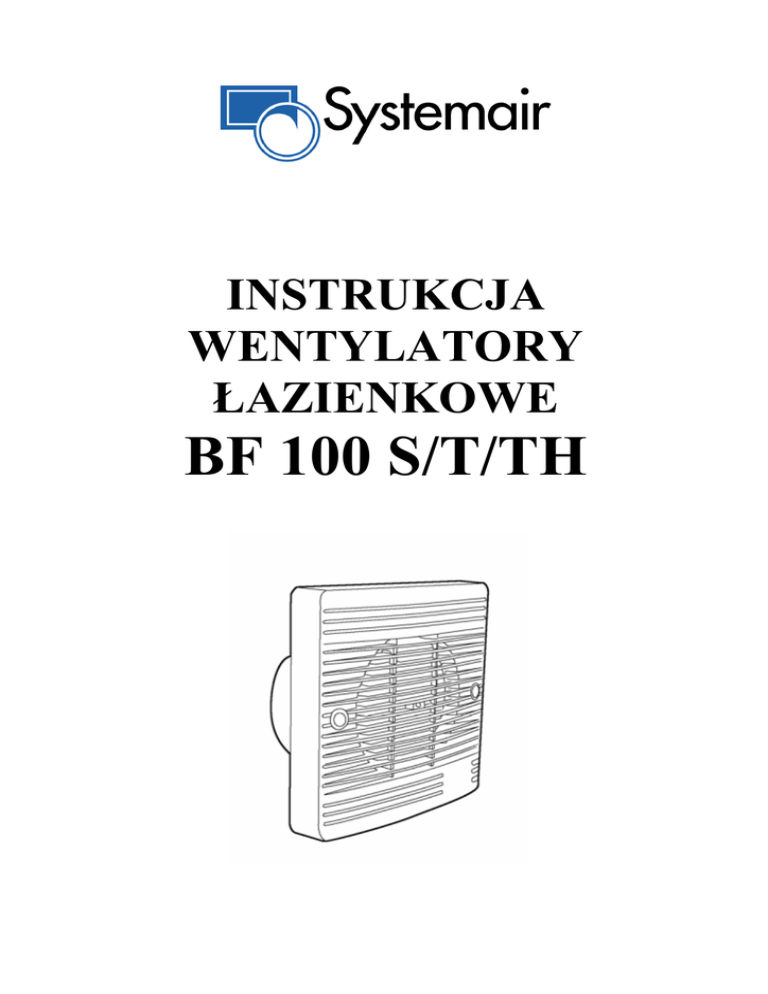 INSTRUKCJA WENTYLATORY ŁAZIENKOWE BF 100 S/T/TH Montaż Wentylator łazienkowy BF powinien być montowany na ścianie najwyżej jak to jest możliwe lub na suficie. Nie wolno montować wentylatorów w kabinach prysznicowych oraz w miejscach, w których osoba biorąca kąpiel mogłaby być narażona na bezpośredni kontakt z urządzeniem. Szczególne środki ostrożności muszą być podjęte w celu uniknięcia przepływów zwrotnych od przewodów kominowych lub od urządzeń z otwartą komorą spalania jak piecyki gazowe grzewcze wody użytkowej i/lub CO, paleniska kominków itp. Wentylator BF 100S –wentylator zwykły Wentylator BF 100T – wentylator ze zwłocznym wyłącznikiem czasowym Wentylator BF 100TH – wentylator ze zwłocznym wyłącznikiem czasowym i higrostatem /załączenie przy wzroście wilgotności/ Sposób montażu 1. Zdjąć zaślepki z dwóch śrub znajdujących się z przodu wentylatora, a następnie wykręcić śruby i zdjąć osłonę. 2. Przykładając korpus wentylatora do ściany (sufitu) zaznaczyć otwory pod śruby oraz wejście przewodu zasilającego. 3. Upewnić się, że wentylator jest właściwie ustawiony na ścianie (suficie) a następnie zdjąć wentylator, wywiercić twory i zamocować wsentylator. 4. Podłączyć przewód zasilający. 5. Zamocować osłonę czołową. Podłączenia elektryczne Uwaga: Podłączenie elektryczne powinno być wykonane przez osobę posiadającą wymagane przepisami kwalifikacje zawodowe. Przed wykonaniem podłączenia odłączyć zasilanie!!! Kabel zasilający musi być przymocowany w sposób pewny i podłączony do wentylatora zgodnie ze schematem podłączeniowym. W obwodzie zasilania zastosować rozłącznik z przerwą izolacyjną nie mniejszą niż 3mm. Wentylatory mają podwójną izolację i nie wymagają doprowadzenia przewodu ochronnego PE. Wentylator może być podłączony do wyłącznika oświetlenia (w takim przypadku zostanie załączony w trakcie włączenia oświetlenia) lub do osobnego wyłącznika. Przygotowanie przewodów elektrycznych (patrz rys. 1). Przed podłączeniem należy usunąć izolację z przewodów elektrycznych, a następnie podłączyć wg załączonych schematów. Rys. 1. Przygotowanie przewodów. Wyłącznik czasowy – timer (BF100T i BF100TH) Czas nastawy opóźnienia w wentylatorach z wyłącznikiem czasowym może być ustawiony w zakresie od 1 do 20 minut. Włączenie wentylatora i aktywacja timera odbywa się przez podanie napięcia na zacisk (terminal) „Switched live” (żółty). UWAGA: „Switched live” (żółty) oraz „ Permanent live” (pomarańczowy) podaje się tę samą fazę zasilania. Podanie różnych faz zniszczy układ timera. Po podaniu fazy na zacisk „Switched live” (żółty) wentylator uruchomi się. Zdjęcie napięcia z tego zacisku powoduje podtrzymanie pracy wentylatora przez czas ustawiony na pokrętle timera. Nastawa wyłącznika czasowego 1. Wyłączyć zasilanie wentylatora. 2. Zdjąć panel czołowy. Przy BF 100TH trzeba też zdjąć wewnętrzną osłonę. 3. Za pomocą wkrętaka z ostrzem 2...3 mm należy ustawić czas opóźnienia na potencjometrze. Obrót zgodnie z ruchem wskazówek zegara zmniejsza czas nastawy opóźnienia, obrót przeciwnie do ruchu wskazówek zegara spowoduje wydłużenie czasu opóźnienia. Higrostat (BF 100 TH) W przypadku, jeżeli wilgotność względna w pomieszczeniu będzie wyższa niż nastawa wentylator uruchomi się ponownie do czasu spadku wilgotności o 5 % poniżej nastawy. Zakres nastaw czujnika wilgotności względnej wynosi od 40 do 95 %. Najczęściej stosowany zakres nastaw to 7080 %. Nastawa czujnika wilgoci: Ustawić poziom załączenia wentylatora Przykładowy schemat podłączenia Wentylator BFT/TH Bezpiecznik Sterowanie S (żółty) (Switched live) Włącznik oświetlenia Zasilanie L (pomarańczowy) (Permanent live) Neutralny N (czarny) (Neutral) Oświetlenie w łazience N Uwaga: Potencjał na zaciskach zasilanie stałe oraz sterowanie (przewody żółty i pomarańczowy) musi pochodzić z tej samej fazy zasilania.Podanie napięć z dwóch faz uszkadza tirem. Żółty: Pomarańczowy: Czarny Sterowanie (faza) Faza - stałe Neutralny SYSTEMAIR SA Aleja Krakowska 169, Łazy k./Warszawy 05-552 Wólka Kosowska tel.: (+48 22) 703 5000 fax: (+48 22) 703 5099 [email protected] www.systemair.pl Oddział w Katowicach Oddział w Szczecinie ul. Czerwińskiego 6, pok. 308 40-123 Katowice tel:032 782 64 30 fax: 032 782 64 46 605 290 564 693 205 880 pl. Orła Białego 1, pok. 27 70-562 Szczecin tel. 91 812 35 92 fax: 91 488 13 92 601 942 162 Oddział w Poznaniu Oddział w Gdyni ul. Grunwaldzka 104, pok. 318 60-307 Poznań tel. 61 865 57 72 fax: (61 861 48 79 605 290 563 609 328 986 ul. Łużycka 10A, pok. 21 81-357 Gdynia tel.: 58 781 48 44 fax: 58 781 52 10 695 435 542 Oddział we Wrocławiu ul. Powstańców Śląskich 28/30 53-333 Wrocław tel.: 71 335 02 70 fax: 71 797 5519 603 298 430 691 292 800