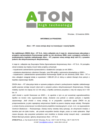 Wrocław, 23 kwietnia 2009r. INFORMACJA PRASOWA Aton – HT: nowa emisja akcji na inwestycje i rozwój Spółki. Na najbliŜszym ZWZA Aton - HT S.A., które odbędzie się 4 maja br. akcjonariusze zdecydują o przyjęciu sprawozdania finansowego spółki za rok obrotowy 2008, oraz o przyjęciu uchwały o podwyŜszeniu kapitału zakładowego Aton – HT, poprzez nową emisję akcji serii D, z prawem poboru dla dotychczasowych Akcjonariuszy. 4 maja br. odbędzie się Zwyczajne Walne Zgromadzenie Akcjonariuszy Aton – HT S.A.. W porządku obrad znalazły się między innymi takie projekty uchwał jak: - rozpatrzenie zatwierdzenia sprawozdania z działalności zarządu za rok 2008 r., - udzielenie absolutorium członkom Zarządu oraz RN spółki z wykonania obowiązków w 2008 r., - rozpatrzenie i zatwierdzenie sprawozdania finansowego Spółki za rok obrotowy 2008. Aton - HT w roku ubiegłym osiągnął stratę w wysokości 1.388.201,23 zł, którą w całości Zarząd chce pokryć z kapitału zapasowego Spółki. ZWZA Aton – HT zdecyduje takŜe w sprawie podjęcia uchwał o podwyŜszeniu kapitału zakładowego spółki poprzez emisję nowych akcji serii z prawem poboru dotychczasowych Akcjonariuszy. Emisja miałaby wynieś nie więcej niŜ 3,3 mln akcji, a Spółka zamierza pozyskać z niej nie więcej niŜ 4 125 tys. zł. Jeśli chodzi o wyniki finansowe za 2008 r., to zgodnie z tym co juŜ wcześniej sygnalizowaliśmy Spółka na koniec roku wypracowała stratę. Zostanie ona jednak w całości pokryta z kapitału zapasowego. Jeśli chodzi o nową emisję, to w przypadku uzyskania zgody ZWZA na jej przeprowadzenie, ja jako największy akcjonariusz Spółki na pewno obejmę swoje udziały. Pieniądze z emisji chcemy przeznaczyć na dokończenie projektów inwestycyjnych, w tym. m.in. na wyposaŜenie Centrum Badawczo – Rozwojowego. Dzisiaj mamy niestety taką sytuację, Ŝe otrzymanie kredytu z banków jest nie tylko trudne, ale przede wszystkim bardzo drogie, przez co mało opłacalne. Stąd nasza decyzja, aby pozyskać potrzebne nam środków w drodze emisji nowych akcji – powiedział Robert Barczyk prezes i główny akcjonariusz Aton – HT S.A. ATON-HT S.A., ul. Na Grobli 6,50-421 Wrocław, PL tel. +48 71 344 70 79 fax: +48 71 344 70 79 e-mail: [email protected], www.aton.com.pl Konieczność zasilenia Spółki kapitałem i decyzja o nowej emisji związana jest z koniecznością pozyskania środków finansowych na m.in.: - rozwój Spółki, - realizacją umowy z Min. Gospodarki przez Spółkę w ramach dofinansowania stworzenia i wyposaŜenia własnego Centrum Badawczo – Rozwojowego oraz wytworzenia 5 produktów mających znaczący wpływ w zakresie ochrony środowiska, - realizacją projektu w ramach Regionalnego Programu Operacyjnego dla Województwa Dolnośląskiego na lata 2007 - 2013. - opóźnieniem sprzedaŜy/komercjalizacji technologii, - opóźnieniem programu AMIENTE. Pozyskane w ramach emisji środki zostaną przeznaczone na dokończenie inwestycji w ramach umów na dofinansowanie projektów, w tym m.in. budowy i wyposaŜenia Centrum Badawczo – Rozwojowego. Dzięki temu Aton – HT będzie mógł realizować długoterminową strategię rozwoju Spółki zarówno w sferze badawczej, jak i produkcyjnej oraz sprzedaŜowej. Wsparcie finansowe jest w tym zakresie konieczne i wynika z faktu, iŜ refundacja kosztów w przypadku umów o dofinansowanie projektów następuje dopiero po ich poniesieniu. W przypadku nie pozyskania kapitału, Aton – HT nie mógłby dokończyć planowanych inwestycji w terminie, a to znacznie mogłoby spowolnić rozwój firmy, a tym samym wzrost wartości. Zarząd planował, iŜ wydatki w tym zakresie zostaną pokryte z zaplanowanej sprzedaŜy, nie mniej jednak sprzedaŜ ta okazała się niewystarczająca. Dodatkowo w związku z podpisaniem umowy ze Spółką BESTMONT na sprzedaŜ 10 urządzeń ATON 500BW, Spółka będzie potrzebować środków pienięŜnych na realizację zamówień w ramach tego kontraktu. Wynika to z faktu, iŜ w obecnej sytuacji rynkowej pozyskanie finansowania na inwestycje kapitałem obcym (w tym kredyt obrotowy) jest bardzo utrudnione, lub teŜ koszt jego pozyskania jest zbyt wysoki, a to z kolei wpłynęło by negatywnie na rentowność netto Spółki planowaną na rok 2009. Dodatkowo Spóła część środków przeznaczy na produkcję i sprzedaŜ urządzeń ATON 200 HR, na które to urządzenia Spółka przewiduje uzyskanie zamówień. Produkcja i sprzedaŜ wymienionych urządzeń pozwoli w pełni skomercjalizować technologię MTT, a tym samym wpłynie na realizację długoterminowej strategii Spółki. Z uwagi na charakter emisji z prawem poboru dla dotychczasowych akcjonariuszy, Zarząd uznał iŜ najbardziej zasadne byłoby przyjęcie ceny emisyjnej akcji serii D nie większej niŜ 1,25 PLN za kaŜdą ATON-HT S.A., ul. Na Grobli 6,50-421 Wrocław, PL tel. +48 71 344 70 79 fax: +48 71 344 70 79 e-mail: [email protected], www.aton.com.pl akcję serii D. Cena ta wynika z planowanego zapotrzebowania Spółki na kapitał. Ustalenie prawa poboru w opinii Zarządu powinno uwzględniać czas potrzebny na przeprowadzenie wszystkich niezbędnych procedur związanych z emisją. Zdaniem Zarządu najbardziej optymalna byłaby emisja w proporcji 2:1 (tj. jedna akcja serii D za dwie akcje serii A - C), gdyŜ pozwali ona na optymalizację kosztów emisji oraz pozyskanie kwoty zaspokajającej potrzeby kapitałowe spółki, przy minimalizacji obciąŜeń finansowych akcjonariuszy, którzy skorzystają z przysługującego im prawa poboru. ------------------------------------------------------------------------------------------------------------------------ATON-HT S.A. działa na rynku od 2005r., a od lutego 2008 r. jest notowana na NewConnect. Firma funkcjonuje w obszarze bezodpadowych innowacyjnych technologii utylizacji odpadów niebezpiecznych i odzysku cennych materiałów. Opracowywane i wdraŜane technologie oparte są o aut