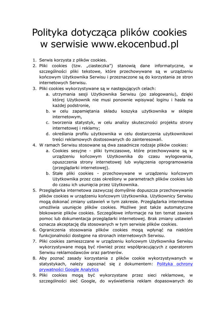 Polityka dotycząca plików cookies w serwisie www.ekocenbud.pl 1. Serwis korzysta z plików cookies. 2. Pliki cookies (tzw. „ciasteczka”) stanowią dane informatyczne, w szczególności pliki tekstowe, które przechowywane są w urządzeniu końcowym Użytkownika Serwisu i przeznaczone są do korzystania ze stron internetowych Serwisu. 3. Pliki cookies wykorzystywane są w następujących celach: a. utrzymania sesji Użytkownika Serwisu (po zalogowaniu), dzięki której Użytkownik nie musi ponownie wpisywać loginu i hasła na każdej podstronie, b. w celu zapamiętania składu koszyka użytkownika w sklepie internetowym, c. tworzenia statystyk, w celu analizy skuteczności projektu strony internetowej i reklamy; d. określania profilu użytkownika w celu dostarczenia użytkownikowi treści reklamowych dostosowanych do zainteresowań. 4. W ramach Serwisu stosowane są dwa zasadnicze rodzaje plików cookies: a. Cookies sesyjne - pliki tymczasowe, które przechowywane są w urządzeniu końcowym Użytkownika do czasu wylogowania, opuszczenia strony internetowej lub wyłączenia oprogramowania (przeglądarki internetowej). b. Stałe pliki cookies - przechowywane w urządzeniu końcowym Użytkownika przez czas określony w parametrach plików cookies lub do czasu ich usunięcia przez Użytkownika. 5. Przeglądarka internetowa zazwyczaj domyślnie dopuszcza przechowywanie plików cookies w urządzeniu końcowym Użytkownika. Użytkownicy Serwisu mogą dokonać zmiany ustawień w tym zakresie. Przeglądarka internetowa umożliwia usunięcie plików cookies. Możliwe jest także automatyczne blokowanie plików cookies. Szczegółowe informacje na ten temat zawiera pomoc lub dokumentacja przeglądarki internetowej. Brak zmiany ustawień oznacza akceptację dla stosowanych w tym serwisie plików cookies. 6. Ograniczenia stosowania plików cookies mogą wpłynąć na niektóre funkcjonalności dostępne na stronach internetowych Serwisu. 7. Pliki cookies zamieszczane w urządzeniu końcowym Użytkownika Serwisu wykorzystywane mogą być również przez współpracujących z operatorem Serwisu reklamodawców oraz partnerów. 8. Aby poznać zasady korzystania z plików cookie wykorzystywanych w statystykach, należy zapoznać się z dokumentem: Polityka ochrony prywatności Google Analytics 9. Pliki cookies mogą być wykorzystane przez sieci reklamowe, w szczególności sieć Google, do wyświetlenia reklam dopasowanych do sposobu, w jaki użytkownik korzysta z Serwisu. W tym celu mogą zachować informację o ścieżce nawigacji użytkownika lub czasie pozostawania na danej stronie. Zmiana ustawień w najbardziej popularnych wyszukiwarkach Zmiana ustawień w przeglądarce Internet Explorer 9 Z menu przeglądarki należy wybrać polecenie: Narzędzia > Opcje Internetowe > Prywatność. Suwakiem ustawiamy poziom prywatności (Akceptowanie wszystkich plików cookie/ Niski/ Średni/ Średnio-wysoki/ Wysoki/ Blokowanie wszystkich plików cookie). Zmiany należy zatwierdzić przyciskiem OK. Zmiana ustawień w przeglądarce Chrome Z menu przeglądarki należy wybrać polecenie: Ustawienia > Pokaż ustawienia zaawansowane > Ustawienia treści (w sekcji Prywatność) > Pliki cookie. Zmiana ustawień w przeglądarce Mozilla Firefox Z menu przeglądarki należy wybrać polecenie: Opcje > Prywatność. Uaktywnić pole Program Firefox: „będzie używał ustawień użytkownika”. Zmiana ustawień w przeglądarce Opera Z menu przeglądarki należy wybrać polecenie: Ustawienia > Preferencje > Zaawansowane.