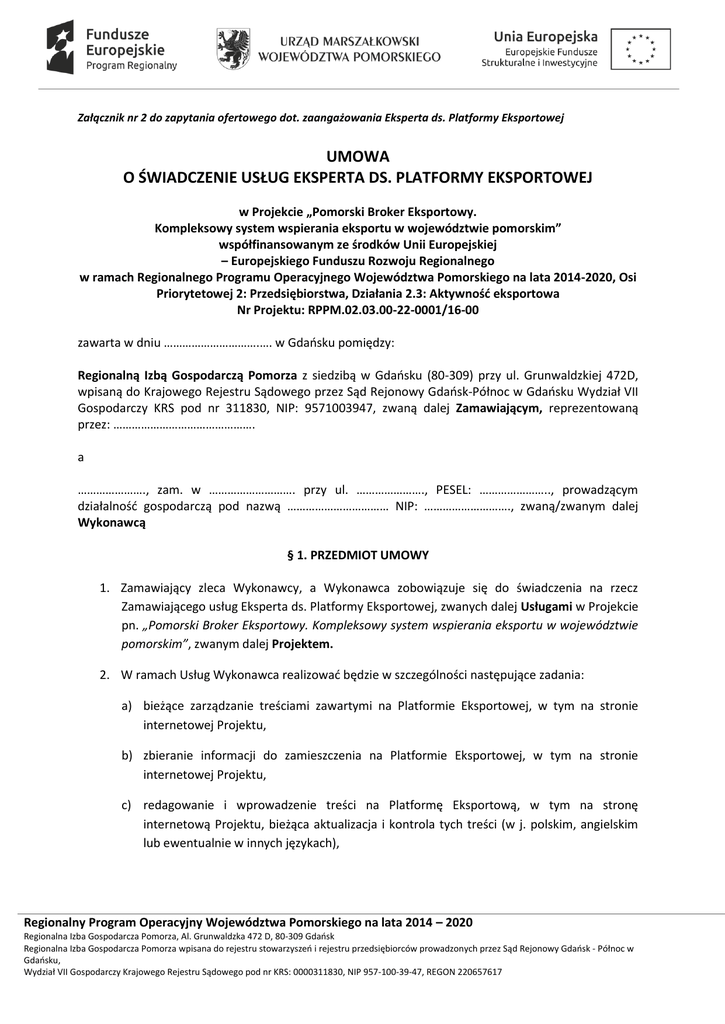 Załącznik nr 2 do zapytania ofertowego dot. zaangażowania Eksperta ds. Platformy Eksportowej UMOWA O ŚWIADCZENIE USŁUG EKSPERTA DS. PLATFORMY EKSPORTOWEJ w Projekcie „Pomorski Broker Eksportowy. Kompleksowy system wspierania eksportu w województwie pomorskim” współfinansowanym ze środków Unii Europejskiej – Europejskiego Funduszu Rozwoju Regionalnego w ramach Regionalnego Programu Operacyjnego Województwa Pomorskiego na lata 2014-2020, Osi Priorytetowej 2: Przedsiębiorstwa, Działania 2.3: Aktywność eksportowa Nr Projektu: RPPM.02.03.00-22-0001/16-00 zawarta w dniu ………………………….…. w Gdańsku pomiędzy: Regionalną Izbą Gospodarczą Pomorza z siedzibą w Gdańsku (80-309) przy ul. Grunwaldzkiej 472D, wpisaną do Krajowego Rejestru Sądowego przez Sąd Rejonowy Gdańsk-Północ w Gdańsku Wydział VII Gospodarczy KRS pod nr 311830, NIP: 9571003947, zwaną dalej Zamawiającym, reprezentowaną przez: ………………………………………. a …………………., zam. w ………………………. przy ul. …………………., PESEL: ………………….., prowadzącym działalność gospodarczą pod nazwą …………………………… NIP: ………………………., zwaną/zwanym dalej Wykonawcą § 1. PRZEDMIOT UMOWY 1. Zamawiający zleca Wykonawcy, a Wykonawca zobowiązuje się do świadczenia na rzecz Zamawiającego usług Eksperta ds. Platformy Eksportowej, zwanych dalej Usługami w Projekcie pn. „Pomorski Broker Eksportowy. Kompleksowy system wspierania eksportu w województwie pomorskim”, zwanym dalej Projektem. 2. W ramach Usług Wykonawca realizować będzie w szczególności następujące zadania: a) bieżące zarządzanie treściami zawartymi na Platformie Eksportowej, w tym na stronie internetowej Projektu, b) zbieranie informacji do zamieszczenia na Platformie Eksportowej, w tym na stronie internetowej Projektu, c) redagowanie i wprowadzenie treści na Platformę Eksportową, w tym na stronę internetową Projektu, bieżąca aktualizacja i kontrola tych treści (w j. polskim, angielskim lub ewentualnie w innych językach), Regionalny Program Operacyjny Województwa Pomorskiego na lata 2014 – 2020 Regionalna Izba Gospodarcza Pomorza, Al. Grunwaldzka 472 D, 80-309 Gdańsk Regionalna Izba Gospodarcza Pomorza wpisana do rejestru stowarzyszeń i rejestru przedsiębiorców prowadzonych przez Sąd Rejonowy Gdańsk - Północ w Gdańsku, Wydział VII Gospodarczy Krajowego Rejestru Sądowego pod nr KRS: 0000311830, NIP 957-100-39-47, REGON 220657617 d) stały kontakt z Koordynatorami Partnerów Projektu w celu aktualizacji informacji od Partnerów Projektu związanej z organizacją wydarzeń promujących, uzupełnianiem baz danych dot. mikro, małych i średnich przedsiębiorstw (MŚP), itp., e) tworzenie i prowadzenie baz danych na potrzeby Projektu, f) agregacja danych do baz danych, g) zbieranie informacji do kalendarza Projektu, wprowadzanie danych i bieżąca aktualizacja kalendarza wydarzeń h) wsparcie osób korzystających z Platformy Eksportowej i przeprowadzanie szkoleń w zakresie zasad jej obsługi, i) publiczne prezentowanie Platformy Eksportowej i jej treści, j) monitorowanie informacji dotyczących Projektu zamieszczanych w Internecie, k) monitorowanie sposobu korzystania z Platformy Eksportowej, zgłaszanie Zamawiającemu wszelkich uwag dotyczących funkcjonowania Platformy Eksportowej oraz informacji dotyczących Projektu l) zakładanie i prowadzenie kont dot. Projektu na portalach społecznościowych, wprowadzanie informacji, m) promocja Projektu. § 2. ZASADY REALIZACJI USŁUG 1) Wykonawca zobowiązuje się do bieżącego i efektywnego wykonywania Usług w każdym miesiącu obowiązywania niniejszej Umowy. 2) Minimalny wymiar czasu wykonywania Usług: średnio 20 godzin tygodniowo w miesięcznym rozliczeniu. 3) Wykonawca zobowiązuje się do świadczenia usług z najwyższą starannością, zgodnie z ofertą złożoną w odpowiedzi na zapytanie ofertowe oraz warunkami określonymi w zapytaniu ofertowym, Strategią Projektu Grantowego udostępnioną przez Zamawiającego, a także zgodnie z zaleceniami i wytycznymi Zamawiającego udzielanymi na etapie obowiązywania umowy i standardami, które zostaną opracowane i ustalone w Projekcie. 4) Zamawiający jest uprawniony do wskazywania Wykonawcy konkretnych czynności do realizacji w zakresie zadań określonych w § 1 ust. 2 Umowy. 5) Działania Wykonawcy podlegają stałemu monitoringowi i kontroli ze strony Zamawiającego. 6) Wykonawca na wezwanie Zamawiającego niezwłocznie przedstawi wszystkie wymagane przez Zamawiającego informacje i wyjaśnienia. Regionalny Program Operacyjny Województwa Pomorskiego na lata 2014 – 2020 Regionalna Izba Gospodarcza Pomorza, Al. Grunwaldzka 472 D, 80-309 Gdańsk Regionalna Izba Gospodarcza Pomorza wpisana do rejestru stowarzyszeń i rejestru przedsiębiorców prowadzonych przez Sąd Rejonowy Gdańsk - Północ w Gdańsku, Wydział VII Gospodarczy Krajowego Rejestru Sądowego pod nr KRS: 0000311830, NIP 957-100-39-47, REGON 220657617 7) Wykonawca zobowiązuje się do informowania Zamawiającego o wszelkich przeszkodach w świadczeniu Usług. 8) Wykonawca świadczyć będzie usługi określone niniejszą Umową w miejscu przez siebie wybranym. Na żądanie Zamawiającego Wykonawca będzie świadczyć Usługi w miejscu wskazanym przez Zamawiającego. 9) Wykonawca zobowiązany jest do osobistego świadczenia usług. § 3. WYNAGRODZENIE 1. Z tytułu niniejszej Umowy Wykonawcy przysługuje wynagrodzenie miesięczne w wysokości brutto …………………………………………. 2. Wynagrodzenie, o którym mowa powyżej, jest współfinansowane ze środków Unii Europejskiej – Europejskiego Funduszu Społecznego w ramach Regionalnego Programu Operacyjnego Województwa Pomorskiego na lata 2014-2020. 3. Określone powyżej wynagrodzenie jest wynagrodzeniem ryczałtowym i obejmuje wszelkie koszty Wykonawcy związa