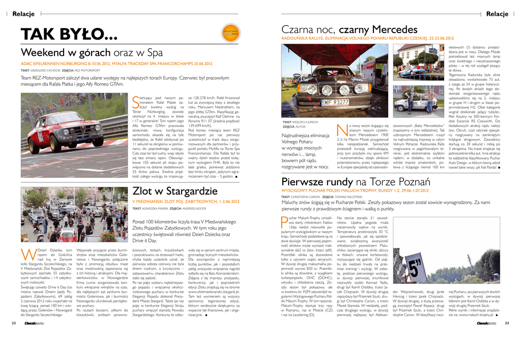 Relacje Relacje TAK BYŁO... Patronat Medialny Czarna noc, czarny Mercedes Radouňská Rallye, eliminacja Volnego Poharu Republiki Czeskiej, 22-23.06.2012 Weekend w górach oraz w Spa ADAC EifelRennen Nürburging 8-10.06.2012, MyAlfa Trackday Spa-Francorchamps 25.06.2012 tekst: grzegorz cichocki zdjęcia: rez motorsport Team REZ-Motorsport zaliczył dwa udane występy na najlepszych torach Europy. Czerwiec był pracowitym miesiącem dla Rafała Płatka i jego Alfy Romeo GTAm. S tartujący pod naszym patronatem Rafał Płatek zaliczył świetny wyścig na Torze Nürburging, zawody ukończył na 4. miejscu w klasie i 17 w generalce! Tym razem jego Alfa Romeo GTAm pracowała doskonale, nowa konfiguracja samochodu okazała się na tyle bezbłędna, że Rafał zdobywał po 11 sekund na okrążeniu w porównaniu do poprzedniego wyścigu. Cały czas tor był suchy, więc obyło się bez zmiany opon. Obowiązkowe 105 sekund pit stopu powięcono na dolanie dodatkowych 55 litrów paliwa. Średnia prędkość całego wyścigu to imponują- ce 128.278 km/h. Rafał finiszował tuż za zwycięzcą klasy z zeszłego roku, Marcusem Niestrathem, na jego żółtej GTAm. Klasyfikację generalną zwyciężył Ralf Oehme na Porsche 911 ST (średnia prędkość 139.699 km/h). Pod koniec miesiąca team REZ Motorsport po raz pierwszy uczestniczył w track dayu zorganizowanym dla partnerów i przyjaciół portalu MyAlfa na Torze Spa Francorchamps. Dla Rafała był to ważny dzień testów przed kolejnym wyścigiem FHR. Była to nie lada gratka, ponieważ jeżdżono bez limitu okrążen, jedynym ograniczeniem był czas – 5 godzin. Zlot w Stargardzie V Miedwiański Zlot Poj. Zabytkowych, 1-3.06.2012 tekst: agnieszka pisarek zdjęcia: andrzej noceń Ponad 100 kilometrów liczyła trasa V Miedwiańskiego Zlotu Pojazdów Zabytkowych. W tym roku jego uczestnicy świętowali również Dzień Dziecka oraz Drive it Day. W Dzień Dziecka, tym razem do Gościńca nad Iną w Żarowie koło Stargardu Szczecińskiego, na V Miedwiański Zlot Pojazdów Zabytkowych zjechało 55 zabytkowych samochodów i 14 zabytkowych motocykli. Świętując czwarty Drive it Day (co można nazwać Dniem Jazdy Pojazdami Zabytkowymi), 69 załóg 2 czerwca 2012 roku wyjechało na trasę liczącą ponad 100 km i wiodącą przez Goleniów i Nowogard do Stargardu Szczecińskiego. 22 Wspaniałe przyjęcie przez burmistrzów oraz mieszkańców Goleniowa i Nowogardu połączone było z promocją obydwu miast oraz możliwością zapoznania się z ich historią i atrakcjami. Dla majsterkowiczów, w Nowogardzie firma Lumix zorganizowała konkurs wkręcania wkrętów na czas, dla najlepszych zaś zarówno burmistrz Goleniowa, jak i burmistrz Nowogardu ufundowali pamiątkowe puchary. Po rzutach boulami, piłkami do koszykówki, próbach sprawno- ściowych, testach, krzyżówkach i poszukiwaniu na drzewach hasła, chyba każdy uczestnik uznał, że pierwsza sobota czerwca nie była dniem nudnym, a turystyczno – zabawowemu charakterowi Zlotu stało się zadość. Po raz piąty wyboru najładniejszego pojazdu i wręczenia okolicznościowego pucharu w konkursie Elegancji Pojazdu dokonał Prezydent Miasta Stargard. Także po raz piąty w konkursie Elegancji Stroju puchary wręczył starosta Powiatu Stargardzkiego. Konkursy te odby- wały się w samym centrum miasta, gromadząc licznych mieszkańców. Dla zwycięzców z najmniejszą liczbą punktów, jak i pozostałych załóg uroczyste wręczenie nagród odbyło się na Balu Komandorskim. Zdjęcia z tej imprezy, przejazdu, konkurencji, jak i poprzednich edycji Zlotu znajdują się na stronie www.zlotmiedwianski.stargard.pl. Tam też wymienieni są wszyscy sponsorzy tegorocznej edycji, którym serdecznie dziękujemy za wsparcie tak finansowe, jak i organizacyjne. tekst: wojciech jurecki zdjęcia: autor Najtrudniejsza eliminacja Volnego Poharu w wymaga mocnych nerwów i... lamp, bowiem pół rajdu rozgrywane jest w nocy. N a nowy sezon ścigający się znanym naszym czytelnikom Mercedesem 190E 2.3-16 Marcin Miziak przygotował kilka niespodzianek. Samochód przeszedł kurację odchudzającą, przy tym przybyło mu sporo KM i niutonometrów, dzięki silnikowi przerobionemu przez najlepszego w Europie specjalistę od szesnasto- zaworowych „Baby Mercedesów” (napiszemy o tym oddzielnie). Tak uzbrojonym Mercedesem ruszył na najtrudniejszą imprezę w całym Volnym Poharze. Radounska Rally rozgrywana w pagórkowatym terenie, jest ekstremalnie szybkim rajdem, w dodatku, co unikalne wśród imprez amatorskich, połowa z liczącego niemal 100 km oesowych (!) dystansu przejeżdżana jest w nocy. Dlatego Miziak potrzebował też mocnych lamp oraz świetnego i nieustraszonego pilota – w tej roli wystąpił piszący te słowa. Tegoroczna Radunska była silnie obsadzona, wystartowało 75 aut, z czego aż 24 w grupie historycznej. Po dwóch dniach tego doskonale zorganizowanego rajdu uplasowaliśmy się na 2. miejscu w grupie H i drugim w klasie pojemnościowej H2. Obie kategorie wygrał doskonale jadący tubylec, Petr Koutny na 300-konnym Fordzie Escorcie RS Cosworth. Do dodatkowych atrakcji rajdu należy tzw. Okruh, czyli odcinek specjalny rozgrywany na zamkniętym trójkącie drogowym. Zawodnicy startują co 30 sekund i robią po 3 okrążenia. Na trasie znajduje się jednocześnie kilka aut. Inna atrakcja to oddzielnie klasyfikowany Puchar Auto Design, w którym biorą udział nawet takie wozy, jak Fiat Panda! Pierwsze rundy na Torze Poznań Wyścigowy Puchar Polski Maluch-Trophy, Rundy 1-2, 29.06-1.07.2012 tekst: christophe carion zdjęcie: Tomasz Raczyński Maluchy znów ścigają się w Pucharze Polski. Zeszły pokazowy sezon został sowicie wynagrodzony. Za nami pierwsze rundy z prawdziwym ściagniem i walką o punkty. P uchar Maluch-Trophy umożliwia starty miłośnikom Fiatów 126p, kiedyś niezwykle popularnym wyścigówkom w naszym kraju. Samochody podzielone są na dwie dywizje. W pierwszej pojemność sil
