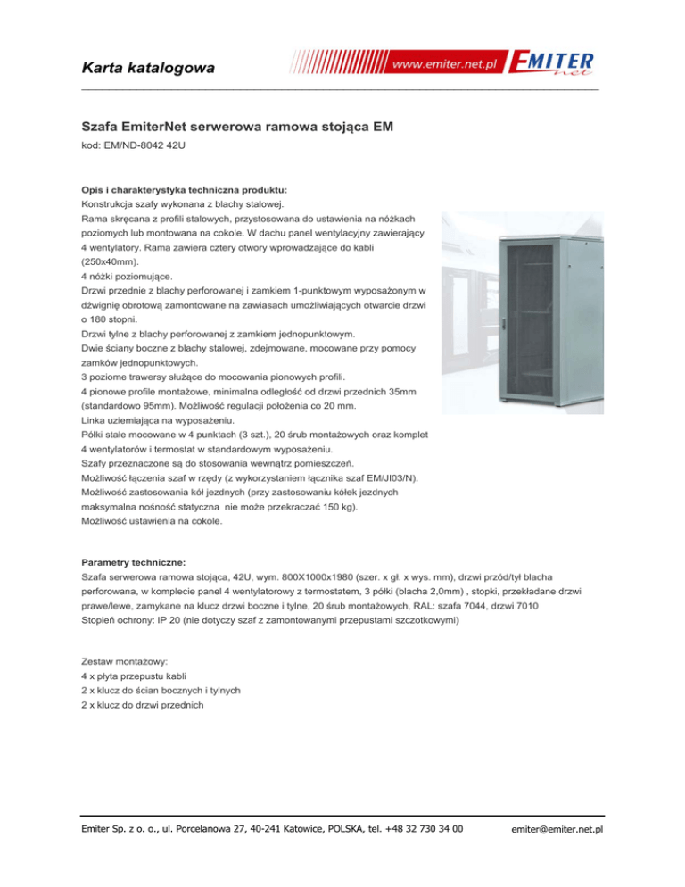Karta katalogowa ___________________________________________________________________________ Szafa EmiterNet serwerowa ramowa stojąca EM kod: EM/ND-8042 42U Opis i charakterystyka techniczna produktu: Konstrukcja szafy wykonana z blachy stalowej. Rama skręcana z profili stalowych, przystosowana do ustawienia na nóżkach poziomych lub montowana na cokole. W dachu panel wentylacyjny zawierający 4 wentylatory. Rama zawiera cztery otwory wprowadzające do kabli (250x40mm). 4 nóżki poziomujące. Drzwi przednie z blachy perforowanej i zamkiem 1-punktowym wyposażonym w dźwignię obrotową zamontowane na zawiasach umożliwiających otwarcie drzwi o 180 stopni. Drzwi tylne z blachy perforowanej z zamkiem jednopunktowym. Dwie ściany boczne z blachy stalowej, zdejmowane, mocowane przy pomocy zamków jednopunktowych. 3 poziome trawersy służące do mocowania pionowych profili. 4 pionowe profile montażowe, minimalna odległość od drzwi przednich 35mm (standardowo 95mm). Możliwość regulacji położenia co 20 mm. Linka uziemiająca na wyposażeniu. Półki stałe mocowane w 4 punktach (3 szt.), 20 śrub montażowych oraz komplet 4 wentylatorów i termostat w standardowym wyposażeniu. Szafy przeznaczone są do stosowania wewnątrz pomieszczeń. Możliwość łączenia szaf w rzędy (z wykorzystaniem łącznika szaf EM/JI03/N). Możliwość zastosowania kół jezdnych (przy zastosowaniu kółek jezdnych maksymalna nośność statyczna nie może przekraczać 150 kg). Możliwość ustawienia na cokole. Parametry techniczne: Szafa serwerowa ramowa stojąca, 42U, wym. 800X1000x1980 (szer. x gł. x wys. mm), drzwi przód/tył blacha perforowana, w komplecie panel 4 wentylatorowy z termostatem, 3 półki (blacha 2,0mm) , stopki, przekładane drzwi prawe/lewe, zamykane na klucz drzwi boczne i tylne, 20 śrub montażowych, RAL: szafa 7044, drzwi 7010 Stopień ochrony: IP 20 (nie dotyczy szaf z zamontowanymi przepustami szczotkowymi) Zestaw montażowy: 4 x płyta przepustu kabli 2 x klucz do ścian bocznych i tylnych 2 x klucz do drzwi przednich Emiter Sp. z o. o., ul. Porcelanowa 27, 40-241 Katowice, POLSKA, tel. +48 32 730 34 00 [email protected] Karta katalogowa ___________________________________________________________________________ Oznaczenia: kod nośność szerokość głębokość wysokość masa U/mm EM/ND-8042 42U 500 kg 800 1000 42/1980 135 kg Uwaga 1: wymiary podane są w milimetrach! Uwaga 2: Maksymalna nośność statyczna (500kg), przy ustawieniach profili montażowych w położeniu fabrycznym i symetrycznym obciążeniu na odpowiedniej ilości półkach mocowanych w czterech punktach. Przy innych warunkach nośność szafy może ulec zmniejszeniu. Dołożyliśmy wszelkich starań, aby przedstawione informacje były rzetelne i kompletne. Jednak nie ponosimy odpowiedzialności za dokładność i kompletność danych oraz w szczególności nie możemy zagwarantować, że niniejsza specyfikacja nie zawiera błędów lub pomyłek. Informacje zawarte w niniejszej specyfikacji mogą zostać zmienione w każdej chwili bez powiadomienia. Emiter Sp. z o. o., ul. Porcelanowa 27, 40-241 Katowice, POLSKA, tel. +48 32 730 34 00 [email protected]