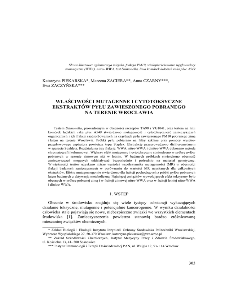 Słowa kluczowe: aglomeracja miejska, frakcja PM10, wielopierścieniowe węglowodory aromatyczne (WWA), nitro- WWA, test Salmonella, linia komórek ludzkich raka płuc A549 Katarzyna PIEKARSKA*, Marzena ZACIERA**, Anna CZARNY***, Ewa ZACZYŃSKA*** WŁAŚCIWOŚCI MUTAGENNE I CYTOTOKSYCZNE EKSTRAKTÓW PYŁU ZAWIESZONEGO POBRANEGO NA TERENIE WROCŁAWIA Testem Salmonella, prowadzonym w obecności szczepów TA98 i YG1041, oraz testem na linii komórek ludzkich raka płuc A549 stwierdzono mutagenność i cytotoksyczność zanieczyszczeń organicznych i ich frakcji zaadsorbowanych na cząstkach pyłu zawieszonego PM10 pobranego zimą i latem na terenie Wrocławia. Próbki pyłu pobierano na filtry szklane przy pomocy wysokoprzepływowego aspiratora powietrza typu Staplex. Ekstrakcję przeprowadzono dichlorometanem w aparacie Soxhleta. Rozdziału na trzy frakcje: WWA, nitro-WWA i dinitro-WWA dokonano metodą chromatografii kolumnowej. Większy efekt mutagenny i cytotoksyczny stwierdzono w próbce pyłów pobranych w sezonie zimowym niż w letnim. W badanych próbkach stwierdzono obecność zanieczyszczeń mogących oddziaływać bezpośrednio i pośrednio na materiał genetyczny. W większości testów uzyskano niższe wartości współczynnika mutagenności (MR) w obecności frakcji badanych zanieczyszczeń w porównaniu do wartości MR uzyskanych dla całkowitych ekstraktów. Efektu mutagennego nie stwierdzono dla frakcji pochodzących z próbki pyłów pobranych latem badanych z aktywacją metaboliczną. Najwięcej związków wywołujących efekt toksyczny było obecnych w próbce pobranej zimą i w frakcji zimowej nitro-WWA oraz w frakcji letniej nitro-WWA i dinitro-WWA. 1. WSTĘP Obecnie w środowisku znajduje się wiele tysięcy substancji wykazujących działanie toksyczne, mutagenne i potencjalnie kancerogenne. W wyniku działalności człowieka stale pojawiają się nowe, niebezpieczne związki we wszystkich elementach środowiska [1]. Zanieczyszczenia powietrza stanowią bardzo zróżnicowaną mieszaninę związków chemicznych. ____________ * Zakład Biologii i Ekologii Instytutu Inżynierii Ochrony Środowiska Politechniki Wrocławskiej, Wybrzeże Wyspiańskiego 27, 50-370 Wrocław, [email protected] ** Zakład Szkodliwości Chemicznych, Instytut Medycyny Pracy i Zdrowia Środowiskowego, ul. Kościelna 13, 41- 200 Sosnowiec *** Instytut Immunologii i Terapii Doświadczalnej PAN, ul. Weigla 12, 53- 114 Wrocław 303 Część z nich adsorbuje się na różnej wielkości cząstkach pyłu i wraz z nimi może przedostać się do układu oddechowego, a następnie przez pęcherzyki płucne do układu krwionośnego i tą drogą mogą rozprzestrzenić się po całym organizmie [2]. Wśród nich poważną grupę, stosunkowo dobrze poznaną, stanowią wielopierścieniowe węglowodory aromatyczne (WWA) – związki o działaniu mutagennym i kancerogennym. Dużą aktywnością mutagenną charakteryzują się także nitrowe, chlorowe i tlenowe pochodne WWA [3]. Od średnicy cząstek pyłu zależy ich szkodliwość dla organizmu. Cząstki respirabilne (inhalacyjne), o średnicy <10m, utrzymują się przez dłuższy czas w atmosferze, co zwiększa prawdopodobieństwo przedostania się ich do układu oddechowego człowieka [4,5]. Wykrycie oraz identyfikacja zanieczyszczeń w oparciu o analizę chemiczną jest kosztowna i wymaga zastosowania nowoczesnych technik analitycznych. Wymusza to konieczność rozpatrywania mutagenności i toksyczności mieszanin, a nie pojedynczych związków stanowiących zanieczyszczenie środowiska. Tylko na podstawie wyników uzyskanych metodami biologicznymi można otrzymać wiarygodne informacje odnośnie ich działania na organizm żywy, ponieważ wiele substancji wykazuje działanie synergistyczne lub antagonistyczne [6]. W badaniach nad oceną mutagenności zanieczyszczeń powietrza znalazł zastosowanie krótkoterminowy bakteryjny test Salmonella (test Amesa) [7,8]. Do badań toksyczności zanieczyszczeń powietrza w warunkach in vitro wykorzystuje się także różne linie komórkowe, np. komórki nabłonkopodobne ludzkiego raka płucA549. Przydatność linii komórkowych do oceny właściwości cytotoksycznych cząstek respirabilnych została potwierdzona w wielu badaniach [9]. Celem niniejszej pracy była ocena mutagenności i cytotoksyczności zanieczyszczeń organicznych zaadsorbowanych na cząstkach pyłu zawieszonego frakcji PM10 pobranego zimą i latem na terenie miasta Wrocławia. 2. MATERIAŁY I METODY Materiał do badań stanowiły próbki pyłu pobierane na filtry szklane za pomocą wysoko-przepływowego aspiratora powietrza typu Staplex PM-10. Próbki pyłów pobierano na stanowisku usytuowanym w dzielnicy Stare Miasto w miejscu o natężonym ruchu samochodowym. Próbki pobierano w sezonie letnim (od maja do września) i w sezonie zimowym (od listopada do marca). Filtry wraz z pyłami ekstrahowano w aparatach Soxhleta dichlorometanem bez dostępu światła, przez 16 godzin z 15 minutowym refluksem [10]. Następnie ekstrakty zagęszczano do sucha w wyparce próżniowej, a na koniec przedmuchiwano azotem. Uzyskane tą drogą suche ekstrakty poddawane były analizie w celu oznaczenia w nich zawartości WWA, nitro-WWA i dinitro-WWA oraz wykorzystywane były jako materiał do testów biologicznych. Surowy ekstrakt frakcjonowano na kolumnach szklanych wypełnionych żelem krzemionkowym zgodnie z metodyką podaną przez Zaciera M. [11]. 304 Wielopierścieniowe węglowodory aromatyczne oznaczano techniką wysokosprawnej chromatografii cieczowej z detekcją fluorescencyjną, natomiast zawartość nitro-WWA techniką chromatografii gazowej z detekcją mas. Suchą pozostałość ekstraktów pyłów przeznaczoną do badań biologicznych rozpuszczano w sterylnym dimetylosulfotlenku (DMSO) w taki sposób by w 1cm3 roztworu podstawowego znajdowały się zanieczyszczenia pochodzące z 1000m3 powietrza. Do testów wprowadzano wszystkie organiczne zanieczyszczenia (C) obe