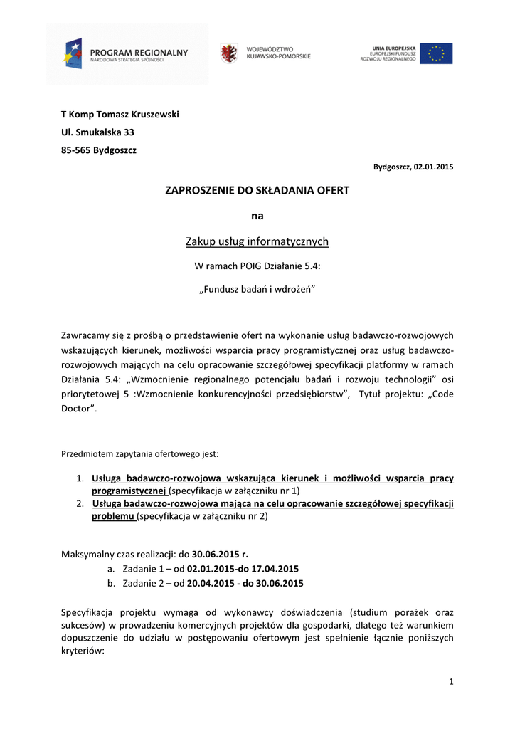 T Komp Tomasz Kruszewski Ul. Smukalska 33 85-565 Bydgoszcz Bydgoszcz, 02.01.2015 ZAPROSZENIE DO SKŁADANIA OFERT na Zakup usług informatycznych W ramach POIG Działanie 5.4: „Fundusz badań i wdrożeń” Zawracamy się z prośbą o przedstawienie ofert na wykonanie usług badawczo-rozwojowych wskazujących kierunek, możliwości wsparcia pracy programistycznej oraz usług badawczorozwojowych mających na celu opracowanie szczegółowej specyfikacji platformy w ramach Działania 5.4: „Wzmocnienie regionalnego potencjału badań i rozwoju technologii” osi priorytetowej 5 :Wzmocnienie konkurencyjności przedsiębiorstw”, Tytuł projektu: „Code Doctor”. Przedmiotem zapytania ofertowego jest: 1. Usługa badawczo-rozwojowa wskazująca kierunek i możliwości wsparcia pracy programistycznej (specyfikacja w załączniku nr 1) 2. Usługa badawczo-rozwojowa mająca na celu opracowanie szczegółowej specyfikacji problemu (specyfikacja w załączniku nr 2) Maksymalny czas realizacji: do 30.06.2015 r. a. Zadanie 1 – od 02.01.2015-do 17.04.2015 b. Zadanie 2 – od 20.04.2015 - do 30.06.2015 Specyfikacja projektu wymaga od wykonawcy doświadczenia (studium porażek oraz sukcesów) w prowadzeniu komercyjnych projektów dla gospodarki, dlatego też warunkiem dopuszczenie do udziału w postępowaniu ofertowym jest spełnienie łącznie poniższych kryteriów: 1 • • • • • • Doświadczenie w dostarczaniu systemów dla spółek giełdowych lub zagranicznych o innowacyjnym charakterze opartych o kulturę pracy w międzynarodowym środowisku, Doświadczenie w realizacji wdrożeń projektów wieloetapowych lub w konsorcjach – min. pół roku, Doświadczenie w tworzeniu systemów o dużej dostępności realizowanych w metodyce ITIL lub Prince2 – min. 4 lata, Doświadczenie w prowadzeniu projektów programistycznych oraz tworzeniu rozwiązań informatycznych dla platformy .NET, Doświadczenie w stosowaniu continuous integration, Doświadczenie w mierzeniu parametrów jakościowych tworzonego oprogramowania, tj. cyclomatic complexity, code coverace oraz defekt density. Dodatkowo w celu zapewnienia kontroli jakości wykonywanej usługi dostawca zapewni możliwość uczestniczenia co najmniej 2 pracowników ze strony T Komp w realizowanych pracach. Złożona oferta powinna zawierać: • • • • • • • • Nazwę i adres oferenta Datę sporządzenia, Cenę całkowitą brutto i netto, Cenę z podziałem na etapy (brutto, netto), Przy ofercie częściowej – wyraźne oznaczenie oferowanego zakresu realizacji usługi, Termin ważności oferty;, Warunki i termin płatności, Podpis wykonawcy wraz z pieczątką imienną i firmową Oferta może być dostarczona: • Za pośrednictwem poczty elektronicznej na adres: [email protected] • Za pośrednictwem poczty na adres: T Komp Tomasz Kruszewski, ul. Smukalska 33, 85-565 Bydgoszcz • Osobiście w siedzibie T Komp Tomasz Kruszewski, ul. Smukalska 33, 85-565 Bydgoszcz Termin składania ofert upływa: 06.02.2015r. Planowany termin 12.02.2015r. Wybór najkorzystniejszej oferty nastąpi w oparciu o kryterium ceny. 2 ZAŁĄCZNIK NR 1 Zadanie 1 Wyniki badań przemysłowych, mają pozwolić na opracowanie podstaw dla stworzenia przez T Komp nowej innowacyjnej platformy informatycznej "Code Doctor". Prowadzone prace badawcze będą miały na celu zdobycie nowej wiedzy prowadzącej do opracowania nowego produktu umożliwiającego programistom szybszą i efektywniejszą pracę. T Komp w historii swojej działalności wyodrębnił kilka najbardziej dotkliwych przeszkód w procesie wykonywania prac programistycznych, które nie znalazły dotychczas zadowalającego rozwiązanie. Do grupy tej należą: uszkodzenie kodu w repozytorium dla wszystkich programistów, co skutkuje zatrzymaniem pracy całego zespołu programistycznego; Programista rozwiązujący dany problem otrzymuje informacje zwrotne za późno aby proces twórczy był efektywny. Czas pętli zwrotnej jest skracany przez np. testy jednostkowe uruchamiane na komputerze programisty w tle, ale nie jest to praktykowane dla innych zasad odnoszących się do wiedzy zebranej w firmie (w szczególności do bibliotek i kodów źródłowych składających się na inne projekty informatyczne organizacji). Zwiększa to koszt o „czas wejścia w strefę" i "czas przełączania" pomiędzy zadaniami. Wiedza przy wdrażaniu i pracy programistów nie jest podawana w możliwych do zrozumienia ilościach dokładnie wtedy gdy jest potrzebna. Skutkuje to niestosowaniem się do przyjętych reguł i standardów. Prowadzi to do tworzenia przerośniętych procedur kontroli w organizacji zamiast wspomóc programistę już w trakcie procesu twórczego - dokładnie wtedy kiedy tego potrzebuje. Efektem niniejszego projektu ma być koncepcja platformy narzędziowej, skierowanej dla rozwiązań Microsoft.NET, która pozwoli zoptymalizować pracę i wdrożenie programistów. Obszarami początkowego zainteresowania, i narzędziowych dla programistów mają być: w obszarze usprawnień procesowych - indeksowanie bazy semantycznej kodów źródłowych oraz opisów API dla wszystkich projektów w organizacji, - udostępnianie natychmiastowych kontekstowych podpowiedzi podczas pisania kodu, bez dodatkowych kosztów oczekiwania na informacje zwrotne i przerywania procesu twórczego, - ułatwienie łączenia zmian w kodzie poprzez uwzględnienie semantyki języka (C#); - bieżące informowanie programistów o reorganizacjach kodu, utrzymywaniu reguł i zasad przyjętych w firmie. Prace badawcze powinny wziąć pod uwagę metodologię opracowaną w "Study of Task Processes for Improving Programmer Productivity" Damodaram Kamma, Indraprastha 3 Institute of Information Technology, w szczególności w obszarze podziału procesowych prac programisty na możliwe do skwantyfikowania odrębne elementy („task processes”). ZAŁĄCZNIK NR 2 Zadanie 2. Zadanie 2 rozpoczyna się po zakończeniu zadania 1 i realizowane będzie w