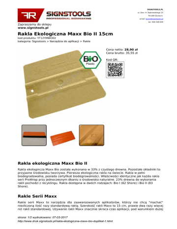 SIGNSTOOLS.PL ul. Gen. H. Dąbrowskiego 15 70-100 Szczecin email: [email protected] tel. 509 349 639 Zapraszamy do sklepu www.signstools.pl Rakla Ekologiczna Maxx Bio II 15cm kod produktu: YT12YMBIO02 kategoria: Signstools > Narzędzia do aplikacji > Rakle Cena netto: 28,90 zł Cena brutto: 35,55 zł Kod QR: Rakla ekologiczna Maxx Bio II Rakla ekologincza Maxx Bio została wykonana w 33% z czystego drewna. Pozostałe składniki to przyjazne środowisku tworzywa. Pierwsza ekologiczna rakla na świecie. Rakla w pełni biodegradowalna, posiada certyfikat biodegrowalności. Właściwości identyczne jak każda rakla serii ProWrap przy jednoczesnym dbaniu o środowisko naturalne. 23% drewna do wykonania rakli pochodzi z recyklingu. Rakla dostępna w dwóch rodzajach: Bio I (62 Shore) i Bio II (83 Shore). Rakle Serii Maxx Rakle serii Maxx to narzędzia dla zaawansowanych aplikatorów, którzy nie chcą "machać" niezliczoną ilość razy standardową raklą. Szerokość rakli Maxx to 15 cm, prawie dwa razy więcej niż rakli standardowej. Używanie rakli Maxx znacznie skraca czas aplikacji, pod warunkiem dużej strona: 1/2 wydrukowano: 07-03-2017 http://www.druk.signstools.pl/rakla-ekologiczna-maxx-bio-duplikat-1.html wprawy aplikatora. Seria wykonana została z naszych standardowych matriałów jakich używamy do produkcji. Mamy więc rakle różnej twardość co prawdopodonie zadowoli każdego aplikatora. Seria Maxx to nic innego jak staraszy i większy brat serii ProBasic. strona: 2/2 wydrukowano: 07-03-2017 http://www.druk.signstools.pl/rakla-ekologiczna-maxx-bio-duplikat-1.html