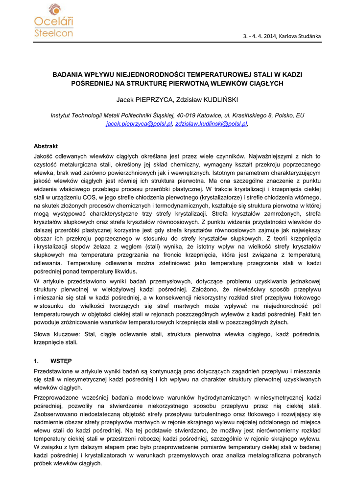 3. - 4. 4. 2014, Karlova Studánka BADANIA WPŁYWU NIEJEDNORODNOŚCI TEMPERATUROWEJ STALI W KADZI POŚREDNIEJ NA STRUKTURĘ PIERWOTNĄ WLEWKÓW CIĄGŁYCH Jacek PIEPRZYCA, Zdzisław KUDLIŃSKI Instytut Technologii Metali Politechniki Śląskiej, 40-019 Katowice, ul. Krasińskiego 8, Polsko, EU [email protected], [email protected], Abstrakt Jakość odlewanych wlewków ciągłych określana jest przez wiele czynników. Najważniejszymi z nich to czystość metalurgiczna stali, określony jej skład chemiczny, wymagany kształt przekroju poprzecznego wlewka, brak wad zarówno powierzchniowych jak i wewnętrznych. Istotnym parametrem charakteryzującym jakość wlewków ciągłych jest równiej ich struktura pierwotna. Ma ona szczególne znaczenie z punktu widzenia właściwego przebiegu procesu przeróbki plastycznej. W trakcie krystalizacji i krzepnięcia ciekłej stali w urządzeniu COS, w jego strefie chłodzenia pierwotnego (krystalizatorze) i strefie chłodzenia wtórnego, na skutek złożonych procesów chemicznych i termodynamicznych, kształtuje się struktura pierwotna w której mogą występować charakterystyczne trzy strefy krystalizacji. Strefa kryształów zamrożonych, strefa kryształów słupkowych oraz strefa kryształów równoosiowych. Z punktu widzenia przydatności wlewków do dalszej przeróbki plastycznej korzystne jest gdy strefa kryształów równoosiowych zajmuje jak największy obszar ich przekroju poprzecznego w stosunku do strefy kryształów słupkowych. Z teorii krzepnięcia i krystalizacji stopów żelaza z węglem (stali) wynika, że istotny wpływ na wielkość strefy kryształów słupkowych ma temperatura przegrzania na froncie krzepnięcia, która jest związana z temperaturą odlewania. Temperaturę odlewania można zdefiniować jako temperaturę przegrzania stali w kadzi pośredniej ponad temperaturę likwidus. W artykule przedstawiono wyniki badań przemysłowych, dotyczące problemu uzyskiwania jednakowej struktury pierwotnej w wielożyłowej kadzi pośredniej. Założono, że niewłaściwy sposób przepływu i mieszania się stali w kadzi pośredniej, a w konsekwencji niekorzystny rozkład stref przepływu tłokowego w stosunku do wielkości tworzących się stref martwych może wpływać na niejednorodność pól temperaturowych w objętości ciekłej stali w rejonach poszczególnych wylewów z kadzi pośredniej. Fakt ten powoduje zróżnicowanie warunków temperaturowych krzepnięcia stali w poszczególnych żyłach. Słowa kluczowe: Stal, ciągłe odlewanie stali, struktura pierwotna wlewka ciągłego, kadź pośrednia, krzepnięcie stali. 1. WSTĘP Przedstawione w artykule wyniki badań są kontynuacją prac dotyczących zagadnień przepływu i mieszania się stali w niesymetrycznej kadzi pośredniej i ich wpływu na charakter struktury pierwotnej uzyskiwanych wlewków ciągłych. Przeprowadzone wcześniej badania modelowe warunków hydrodynamicznych w niesymetrycznej kadzi pośredniej, pozwoliły na stwierdzenie niekorzystnego sposobu przepływu przez nią ciekłej stali. Zaobserwowano niedostateczną objętość strefy przepływu turbulentnego oraz tłokowego i rozwijający się nadmiernie obszar strefy przepływów martwych w rejonie skrajnego wylewu najdalej oddalonego od miejsca wlewu stali do kadzi pośredniej. Na tej podstawie stwierdzono, że możliwy jest nierównomierny rozkład temperatury ciekłej stali w przestrzeni roboczej kadzi pośredniej, szczególnie w rejonie skrajnego wylewu. W związku z tym dalszym etapem prac było przeprowadzenie pomiarów temperatury ciekłej stali w badanej kadzi pośredniej i krystalizatorach w warunkach przemysłowych oraz analiza metalograficzna pobranych próbek wlewków ciągłych. 3. - 4. 4. 2014, Karlova Studánka 2. POMIARY TEMPERATURY W KADZI POŚREDNIEJ I KRYSTALIZATORACH Przed przystąpieniem do pomiarów temperatury ciekłej stali w kadzi pośredniej i krystalizatorach, przeprowadzono badania pilotażowe mające na celu określenie technicznych warunków i możliwości ich realizacji oraz opracowanie metodyki badań najbardziej korzystnej z punktu widzenia minimalizacji ich wpływu na przebieg procesu technologicznego ciągłego odlewania stali. Na podstawie badań pilotażowych stwierdzono konieczność rozbudowy systemu pomiaru temperatury w kadzi pośredniej umożliwiający uzyskanie wyników w trzech jej punktach oraz wykorzystanie systemu ciągłego pomiaru za pomocą Contilancy. Stwierdzono również, że do pomiaru temperatury stali w krystalizatorach optymalnym rozwiązaniem jest wykorzystanie Minilancy z czujnikami wielokrotnego użytku bez osłony stalowej, które ograniczają możliwe wypryski ciekłej stali w trakcie ich zanurzania w ciekłej stali. Ze względu na ich niewielkie gabaryty zmniejszają również niebezpieczeństwo wpływu na system sterowania urządzeniem COS, który automatycznie reaguje na zakłócenia powstające w krystalizatorze korygując parametry odlewania np. zmieniając liniową prędkość odlewania. Tak zrealizowane badania pilotażowe w warunkach przemysłowych pozwoliły na opracowanie precyzyjnego programu badań możliwego do zrealizowania w warunkach ruchowych, określeniu punktów pomiaru temperatury w kadzi pośredniej Lanca 1 Lanca 2 i krystalizatorach, możliwości wykorzystania istniejącej w hucie aparatury pomiarowej Contilanca oraz możliwości zainstalowania i wykorzystania dodatkowej aparatury niezbędnej do właściwego przeprowadzenia badań. Schemat układu Wylew 1 Wylew 2 Wylew 3 pomiarowego temperatury w kadzi pośredniej przedstawia rys. 1. Rys. 1 Schemat punktów pomiarowych temperatury w kadzi Pomiary wykonano za pomocą dwóch lanc z standardowymi czujnikami zanurzanymi w rejonie wylewów nr 2 i 3. W rejonie wylewu nr 1 wykorzystano zainstalowaną na urządzeniu COS Contilancę do pomiaru ciągłego temperatury. W celu łatwej identyfikacji poszczególnych wytopów badawczych, oznaczono je symbolami WB i ponumerowano kolejnymi