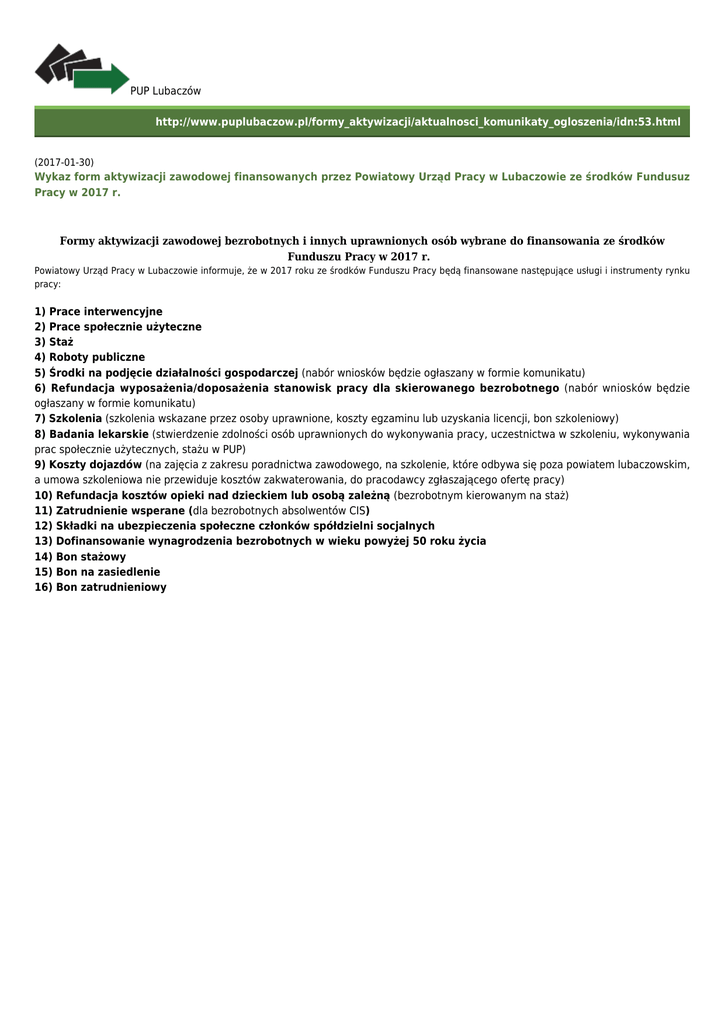 PUP Lubaczów http://www.puplubaczow.pl/formy_aktywizacji/aktualnosci_komunikaty_ogloszenia/idn:53.html (2017-01-30) Wykaz form aktywizacji zawodowej finansowanych przez Powiatowy Urząd Pracy w Lubaczowie ze środków Fundusuz Pracy w 2017 r. Formy aktywizacji zawodowej bezrobotnych i innych uprawnionych osób wybrane do finansowania ze środków Funduszu Pracy w 2017 r. Powiatowy Urząd Pracy w Lubaczowie informuje, że w 2017 roku ze środków Funduszu Pracy będą finansowane następujące usługi i instrumenty rynku pracy: 1) Prace interwencyjne 2) Prace społecznie użyteczne 3) Staż 4) Roboty publiczne 5) Środki na podjęcie działalności gospodarczej (nabór wniosków będzie ogłaszany w formie komunikatu) 6) Refundacja wyposażenia/doposażenia stanowisk pracy dla skierowanego bezrobotnego (nabór wniosków będzie ogłaszany w formie komunikatu) 7) Szkolenia (szkolenia wskazane przez osoby uprawnione, koszty egzaminu lub uzyskania licencji, bon szkoleniowy) 8) Badania lekarskie (stwierdzenie zdolności osób uprawnionych do wykonywania pracy, uczestnictwa w szkoleniu, wykonywania prac społecznie użytecznych, stażu w PUP) 9) Koszty dojazdów (na zajęcia z zakresu poradnictwa zawodowego, na szkolenie, które odbywa się poza powiatem lubaczowskim, a umowa szkoleniowa nie przewiduje kosztów zakwaterowania, do pracodawcy zgłaszającego ofertę pracy) 10) Refundacja kosztów opieki nad dzieckiem lub osobą zależną (bezrobotnym kierowanym na staż) 11) Zatrudnienie wsperane (dla bezrobotnych absolwentów CIS) 12) Składki na ubezpieczenia społeczne członków spółdzielni socjalnych 13) Dofinansowanie wynagrodzenia bezrobotnych w wieku powyżej 50 roku życia 14) Bon stażowy 15) Bon na zasiedlenie 16) Bon zatrudnieniowy wszystkie