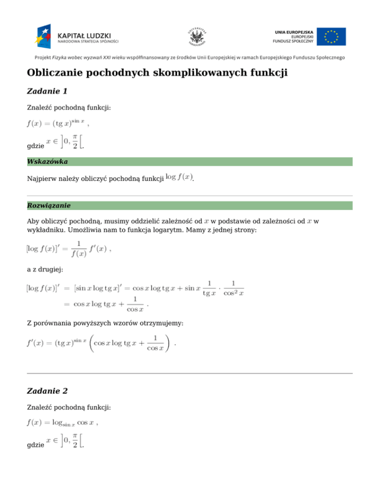Obliczanie pochodnych skomplikowanych funkcji Zadanie 1 Znaleźć pochodną funkcji: gdzie . Wskazówka Najpierw należy obliczyć pochodną funkcji . Rozwiązanie Aby obliczyć pochodną, musimy oddzielić zależność od w podstawie od zależności od wykładniku. Umożliwia nam to funkcja logarytm. Mamy z jednej strony: a z drugiej: Z porównania powyższych wzorów otrzymujemy: Zadanie 2 Znaleźć pochodną funkcji: gdzie . w Wskazówka Należy wykorzystać wzór na zamianę podstawy logarytmu. Rozwiązanie Aby oddzielić zależność funkcji od wykorzystamy wzór: dla i w podstawie logarytmu od zależności w argumencie, . Otrzymujemy: więc szukaną pochodną znaleźć możemy wykorzystując znany wzór na różniczkowanie ilorazu: Zadanie 3 Znaleźć pochodną funkcji: gdzie . Wskazówka Zadanie bardzo łatwe, bez wskazówki. Rozwiązanie Aby znaleźć pochodną wystarczy wykorzystać wzór na różniczkowanie funkcji złożonej. Otrzymujemy: Zadanie 4 Znaleźć pochodną funkcji: gdzie . Wskazówka Należy wykorzystać wzór na zamianę podstawy logarytmu. Rozwiązanie Aby oddzielić zależność funkcji od w podstawie logarytmu od zależności w argumencie, wykorzystamy wzór (6). Otrzymujemy w ten sposób: i szukaną pochodną znaleźć możemy wykorzystując znany wzór na różniczkowanie ilorazu:
