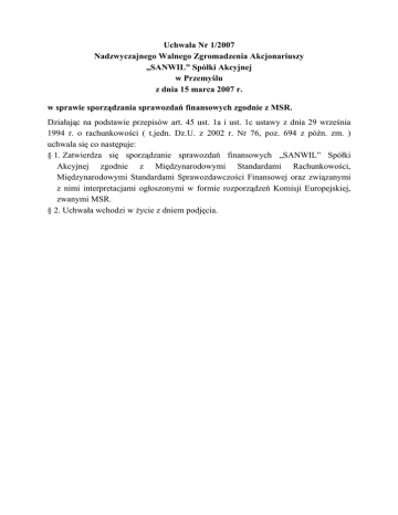 Uchwała Nr 1/2007 Nadzwyczajnego Walnego Zgromadzenia Akcjonariuszy „SANWIL” Spółki Akcyjnej w Przemyślu z dnia 15 marca 2007 r. w sprawie sporządzania sprawozdań finansowych zgodnie z MSR. Działając na podstawie przepisów art. 45 ust. 1a i ust. 1c ustawy z dnia 29 września 1994 r. o rachunkowości ( t.jedn. Dz.U. z 2002 r. Nr 76, poz. 694 z późn. zm. ) uchwala się co następuje: § 1. Zatwierdza się sporządzanie sprawozdań finansowych „SANWIL” Spółki Akcyjnej zgodnie z Międzynarodowymi Standardami Rachunkowości, Międzynarodowymi Standardami Sprawozdawczości Finansowej oraz związanymi z nimi interpretacjami ogłoszonymi w formie rozporządzeń Komisji Europejskiej, zwanymi MSR. § 2. Uchwała wchodzi w życie z dniem podjęcia. Uchwała Nr 2/2007 Nadzwyczajnego Walnego Zgromadzenia Akcjonariuszy „SANWIL” Spółki Akcyjnej w Przemyślu z dnia 15 marca 2007 r. w sprawie odwołania członka rady nadzorczej Działając na podstawie przepisów art. 385 § 1 kodeksu spółek handlowych oraz art. 17 ust. 3 pkt 4 statutu spółki uchwala się co następuje: § 1. Walne zgromadzenie akcjonariuszy odwołuje ze składu rady nadzorczej Piotra Zawiślaka. § 2. Uchwała wchodzi w życie z dniem podjęcia. Uchwała Nr 3/2007 Nadzwyczajnego Walnego Zgromadzenia Akcjonariuszy „SANWIL” Spółki Akcyjnej w Przemyślu z dnia 15 marca 2007 r. w sprawie odwołania członka rady nadzorczej Działając na podstawie przepisów art. 385 § 1 kodeksu spółek handlowych oraz art. 17 ust. 3 pkt 4 statutu spółki uchwala się co następuje: § 1. Walne zgromadzenie akcjonariuszy odwołuje ze składu rady nadzorczej Artura Górnika. § 2. Uchwała wchodzi w życie z dniem podjęcia. Uchwała Nr 4/2007 Nadzwyczajnego Walnego Zgromadzenia Akcjonariuszy „SANWIL” Spółki Akcyjnej w Przemyślu z dnia 15 marca 2007 r. W sprawie powołania członka rady nadzorczej Działając na podstawie przepisów art. 385 § 1 kodeksu spółek handlowych oraz zgodnie z art. 17 ust 3 pkt 4 statutu spółki uchwala się co następuje: § 1. Walne zgromadzenie akcjonariuszy powołuje do składu rady nadzorczej Adama Buchajskiego. § 2. Uchwała wchodzi w życie z dniem podjęcia. Uchwała Nr 5/2007 Nadzwyczajnego Walnego Zgromadzenia Akcjonariuszy „SANWIL” Spółki Akcyjnej w Przemyślu z dnia 15 marca 2007 r. W sprawie powołania członka rady nadzorczej Działając na podstawie przepisów art. 385 § 1 kodeksu spółek handlowych oraz zgodnie z art. 17 ust 3 pkt 4 statutu spółki uchwala się co następuje: § 1. Walne zgromadzenie akcjonariuszy powołuje do składu rady nadzorczej Andrzeja Majchrzaka. § 2. Uchwała wchodzi w życie z dniem podjęcia. Uchwała Nr 6/2007 Nadzwyczajnego Walnego Zgromadzenia Akcjonariuszy „SANWIL” Spółki Akcyjnej w Przemyślu z dnia 15 marca 2007 r. W sprawie zmiany statutu spółki Działając na podstawie art. 430 § 1 kodeksu spółek handlowych uchwala się, co następuje: § 1. Artykuł 17 ust. 2 statutu spółki otrzymuje nowe następujące brzmienie: „Kadencja Rady Nadzorczej jest wspólna i trwa trzy lata. W razie wygaśnięcia mandatu członka Rady Nadzorczej wybranego przez Walne Zgromadzenie przed upływem kadencji wskutek śmierci, rezygnacji albo odwołania go ze składu, Rada Nadzorcza w terminie 30 dni od daty wygaśnięcia mandatu dokona uzupełnienia swego składu w drodze kooptacji. Jeżeli Rada Nadzorcza nie dokona uzupełnienia w terminie 30 dni od daty wygaśnięcia mandatu, powołanie członka Rady nastąpi według zasad określonych w art. 17 ust. 3 Statutu Spółki”. § 2. Uchwała wchodzi w życie z dniem zarejestrowania. Uchwała Nr 7/2007 Nadzwyczajnego Walnego Zgromadzenia Akcjonariuszy „SANWIL” Spółki Akcyjnej w Przemyślu z dnia 15 marca 2007 r. W sprawie przyjęcia tekstu jednolitego Statutu Spółki Działając na podstawie przepisów art. 430 § 1 kodeksu spółek handlowych uchwala się, co następuje: § 1. Przyjmuje się tekst jednolity statusu spółki stanowiący załącznik do uchwały. § 2. Uchwała wchodzi w życie z dniem zarejestrowania zmian statutu.