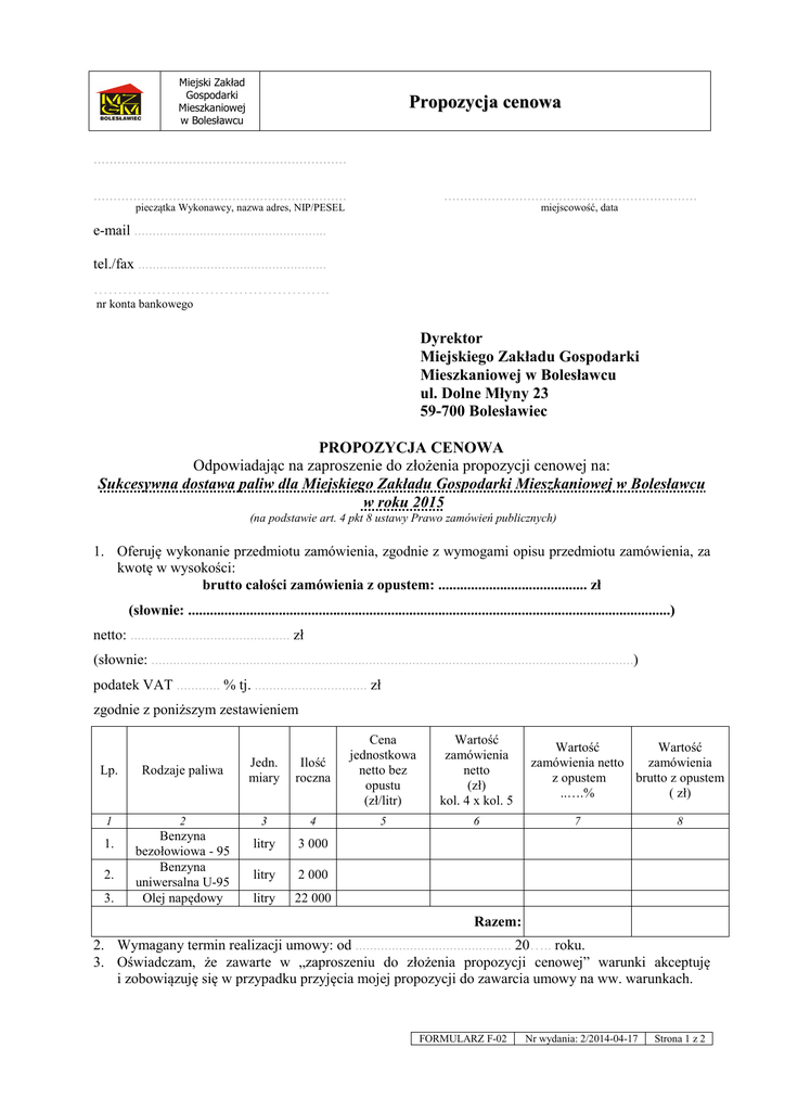 Miejski Zakład Gospodarki Mieszkaniowej w Bolesławcu Propozycja cenowa ................................................................ ................................................................ ................................................................ pieczątka Wykonawcy, nazwa adres, NIP/PESEL miejscowość, data e-mail ..................................................... tel./fax .................................................... …………………………………………. nr konta bankowego Dyrektor Miejskiego Zakładu Gospodarki Mieszkaniowej w Bolesławcu ul. Dolne Młyny 23 59-700 Bolesławiec PROPOZYCJA CENOWA Odpowiadając na zaproszenie do złożenia propozycji cenowej na: Sukcesywna dostawa paliw dla Miejskiego Zakładu Gospodarki Mieszkaniowej w Bolesławcu w roku 2015 (na podstawie art. 4 pkt 8 ustawy Prawo zamówień publicznych) 1. Oferuję wykonanie przedmiotu zamówienia, zgodnie z wymogami opisu przedmiotu zamówienia, za kwotę w wysokości: brutto całości zamówienia z opustem: ......................................... zł (słownie: .....................................................................................................................................) netto: ............................................ zł (słownie: .....................................................................................................................................) podatek VAT ............ % tj. ............................... zł zgodnie z poniższym zestawieniem Lp. 1 1. 2. 3. Rodzaje paliwa Jedn. miary Ilość roczna Cena jednostkowa netto bez opustu (zł/litr) 2 3 4 5 litry 3 000 litry 2 000 litry 22 000 Benzyna bezołowiowa - 95 Benzyna uniwersalna U-95 Olej napędowy Wartość zamówienia netto (zł) kol. 4 x kol. 5 6 Wartość Wartość zamówienia netto zamówienia z opustem brutto z opustem ..….% ( zł) 7 8 Razem: 2. Wymagany termin realizacji umowy: od ........................................... 20….. roku. 3. Oświadczam, że zawarte w „zaproszeniu do złożenia propozycji cenowej” warunki akceptuję i zobowiązuję się w przypadku przyjęcia mojej propozycji do zawarcia umowy na ww. warunkach. FORMULARZ F-02 Nr wydania: 2/2014-04-17 Strona 1 z 2 4. Zobowiązuję się, że w przypadku wygrania postępowania i realizacji zamówienia przy udziale Podwykonawców, Umowy z Podwykonawcami zostaną zawarte zgodnie z postanowieniami art. 647¹ ustawy Kodeks Cywilny. 5. Następujące części niniejszego zamówienia powierzę Podwykonawcom: L.p. Zakres prac Wartość prac Uwaga: Wypełniają tylko Wykonawcy, którzy powierzą wykonanie części zamówienia Podwykonawcom. 6. Załącznikami do propozycji są: dokumenty i załączniki wymienione w ust. 4 zaproszenia. …………………………………………. (data, podpis i pieczątka wykonawcy/dostawcy) FORMULARZ F-02 Nr wydania: 2/2014-04-17 Strona 2 z 2