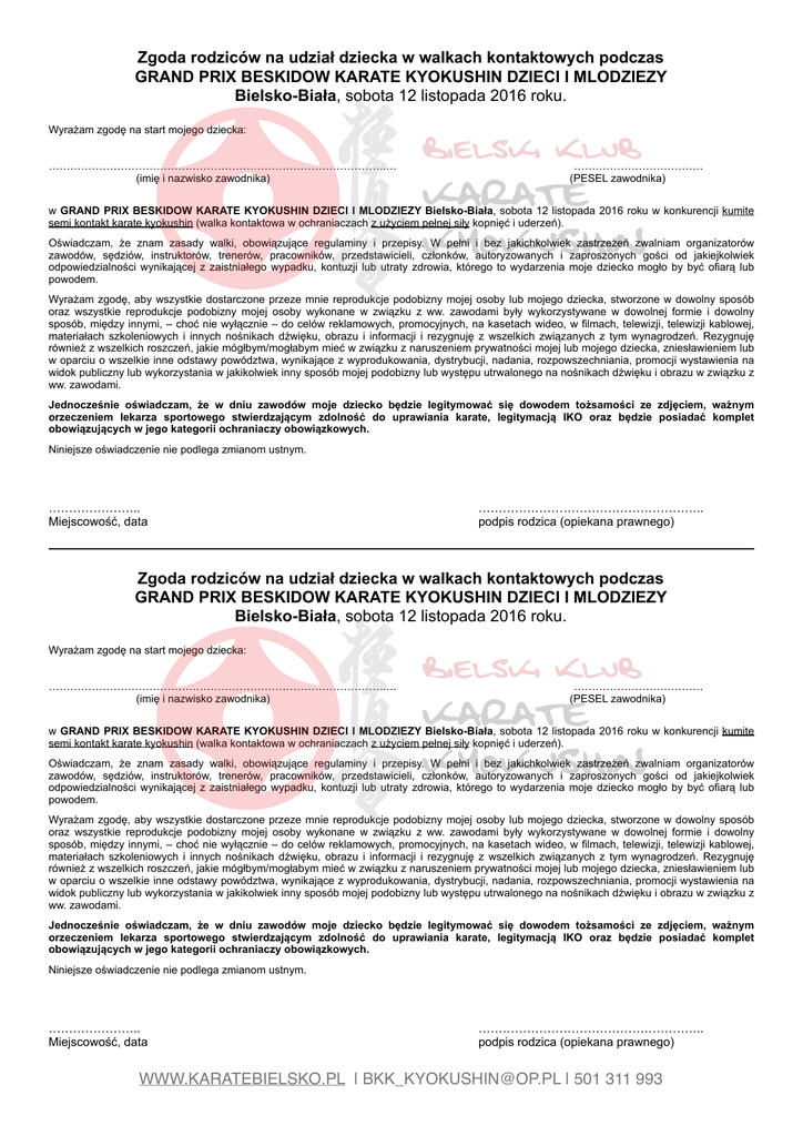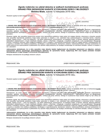 Zgoda rodziców na udział dziecka w walkach kontaktowych podczas GRAND PRIX BESKIDOW KARATE KYOKUSHIN DZIECI I MLODZIEZY Bielsko-Biała, sobota 12 listopada 2016 roku. Wyrażam zgodę na start mojego dziecka: ………………………………………………………………………………….… (imię i nazwisko zawodnika) ……………………………… (PESEL zawodnika) w GRAND PRIX BESKIDOW KARATE KYOKUSHIN DZIECI I MLODZIEZY Bielsko-Biała, sobota 12 listopada 2016 roku w konkurencji kumite semi kontakt karate kyokushin (walka kontaktowa w ochraniaczach z użyciem pełnej siły kopnięć i uderzeń). Oświadczam, że znam zasady walki, obowiązujące regulaminy i przepisy. W pełni i bez jakichkolwiek zastrzeżeń zwalniam organizatorów zawodów, sędziów, instruktorów, trenerów, pracowników, przedstawicieli, członków, autoryzowanych i zaproszonych gości od jakiejkolwiek odpowiedzialności wynikającej z zaistniałego wypadku, kontuzji lub utraty zdrowia, którego to wydarzenia moje dziecko mogło by być ofiarą lub powodem. Wyrażam zgodę, aby wszystkie dostarczone przeze mnie reprodukcje podobizny mojej osoby lub mojego dziecka, stworzone w dowolny sposób oraz wszystkie reprodukcje podobizny mojej osoby wykonane w związku z ww. zawodami były wykorzystywane w dowolnej formie i dowolny sposób, między innymi, – choć nie wyłącznie – do celów reklamowych, promocyjnych, na kasetach wideo, w filmach, telewizji, telewizji kablowej, materiałach szkoleniowych i innych nośnikach dźwięku, obrazu i informacji i rezygnuję z wszelkich związanych z tym wynagrodzeń. Rezygnuję również z wszelkich roszczeń, jakie mógłbym/mogłabym mieć w związku z naruszeniem prywatności mojej lub mojego dziecka, zniesławieniem lub w oparciu o wszelkie inne odstawy powództwa, wynikające z wyprodukowania, dystrybucji, nadania, rozpowszechniania, promocji wystawienia na widok publiczny lub wykorzystania w jakikolwiek inny sposób mojej podobizny lub występu utrwalonego na nośnikach dźwięku i obrazu w związku z ww. zawodami. Jednocześnie oświadczam, że w dniu zawodów moje dziecko będzie legitymować się dowodem tożsamości ze zdjęciem, ważnym orzeczeniem lekarza sportowego stwierdzającym zdolność do uprawiania karate, legitymacją IKO oraz będzie posiadać komplet obowiązujących w jego kategorii ochraniaczy obowiązkowych. Niniejsze oświadczenie nie podlega zmianom ustnym. ………………….. Miejscowość, data ……………………………………………….. podpis rodzica (opiekana prawnego) Zgoda rodziców na udział dziecka w walkach kontaktowych podczas GRAND PRIX BESKIDOW KARATE KYOKUSHIN DZIECI I MLODZIEZY Bielsko-Biała, sobota 12 listopada 2016 roku. Wyrażam zgodę na start mojego dziecka: ………………………………………………………………………………….… (imię i nazwisko zawodnika) ……………………………… (PESEL zawodnika) w GRAND PRIX BESKIDOW KARATE KYOKUSHIN DZIECI I MLODZIEZY Bielsko-Biała, sobota 12 listopada 2016 roku w konkurencji kumite semi kontakt karate kyokushin (walka kontaktowa w ochraniaczach z użyciem pełnej siły kopnięć i uderzeń). Oświadczam, że znam zasady walki, obowiązujące regulaminy i przepisy. W pełni i bez jakichkolwiek zastrzeżeń zwalniam organizatorów zawodów, sędziów, instruktorów, trenerów, pracowników, przedstawicieli, członków, autoryzowanych i zaproszonych gości od jakiejkolwiek odpowiedzialności wynikającej z zaistniałego wypadku, kontuzji lub utraty zdrowia, którego to wydarzenia moje dziecko mogło by być ofiarą lub powodem. Wyrażam zgodę, aby wszystkie dostarczone przeze mnie reprodukcje podobizny mojej osoby lub mojego dziecka, stworzone w dowolny sposób oraz wszystkie reprodukcje podobizny mojej osoby wykonane w związku z ww. zawodami były wykorzystywane w dowolnej formie i dowolny sposób, między innymi, – choć nie wyłącznie – do celów reklamowych, promocyjnych, na kasetach wideo, w filmach, telewizji, telewizji kablowej, materiałach szkoleniowych i innych nośnikach dźwięku, obrazu i informacji i rezygnuję z wszelkich związanych z tym wynagrodzeń. Rezygnuję również z wszelkich roszczeń, jakie mógłbym/mogłabym mieć w związku z naruszeniem prywatności mojej lub mojego dziecka, zniesławieniem lub w oparciu o wszelkie inne odstawy powództwa, wynikające z wyprodukowania, dystrybucji, nadania, rozpowszechniania, promocji wystawienia na widok publiczny lub wykorzystania w jakikolwiek inny sposób mojej podobizny lub występu utrwalonego na nośnikach dźwięku i obrazu w związku z ww. zawodami. Jednocześnie oświadczam, że w dniu zawodów moje dziecko będzie legitymować się dowodem tożsamości ze zdjęciem, ważnym orzeczeniem lekarza sportowego stwierdzającym zdolność do uprawiania karate, legitymacją IKO oraz będzie posiadać komplet obowiązujących w jego kategorii ochraniaczy obowiązkowych. Niniejsze oświadczenie nie podlega zmianom ustnym. ………………….. Miejscowość, data ……………………………………………….. podpis rodzica (opiekana prawnego) WWW.KARATEBIELSKO.PL | [email protected] | 501 311 993