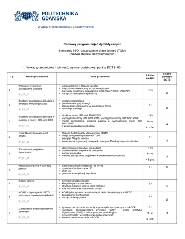 Ramowy program zajęć - Standardy ISO i zarządzanie przez jakość
