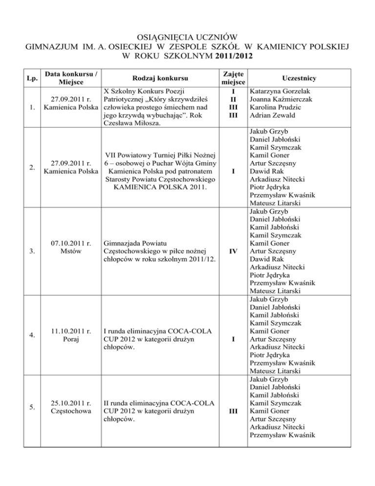 Osiągnięcia uczniów 2011/2012 - Gimnazjum w Kamienicy Polskiej