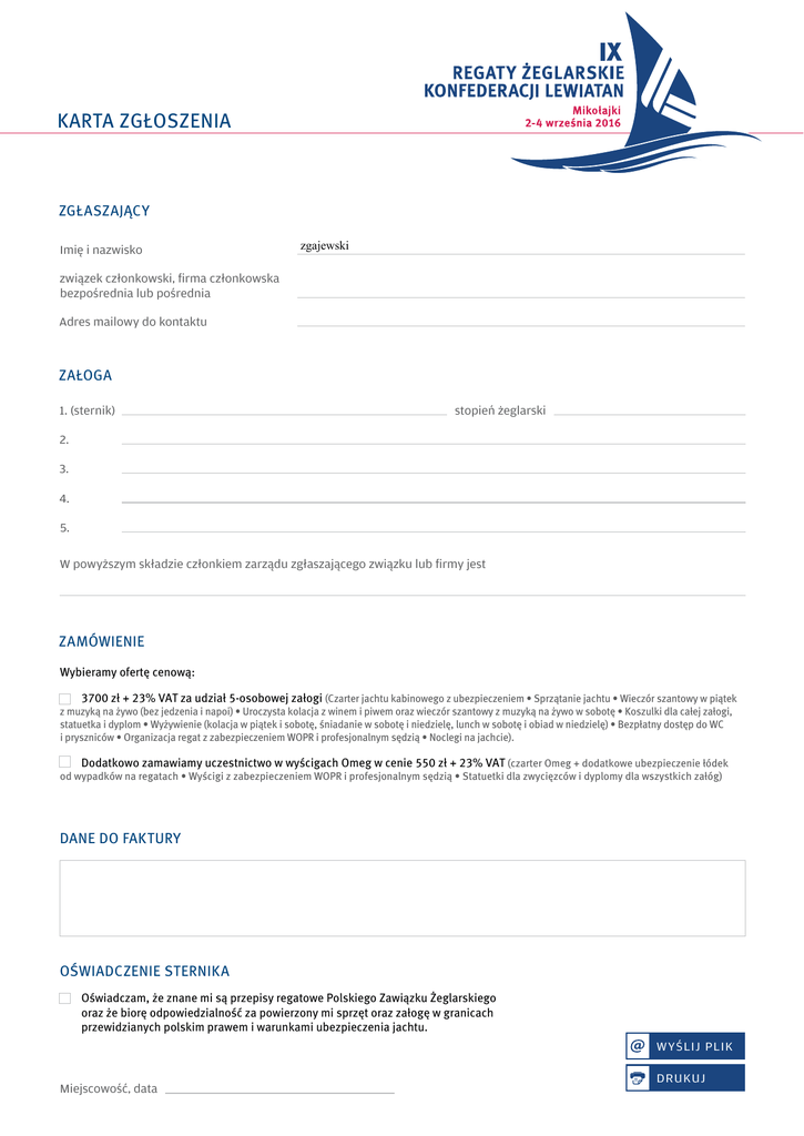 KARTA ZGŁOSZENIA INSTRUKCJA REGULAMIN ŻEGLUGI REGAT ZGŁASZAJĄCY Imię i nazwisko zgajewski związek członkowski, firma członkowska bezpośrednia lub pośrednia Adres mailowy do kontaktu ZAŁOGA 1. (sternik) stopień żeglarski 2. 3. 4. 5. W powyższym składzie członkiem zarządu zgłaszającego związku lub firmy jest ZAMÓWIENIE Wybieramy ofertę cenową: 3700 zł + 23% VAT za udział 5-osobowej załogi (Czarter jachtu kabinowego z ubezpieczeniem • Sprzątanie jachtu • Wieczór szantowy w piątek z muzyką na żywo (bez jedzenia i napoi) • Uroczysta kolacja z winem i piwem oraz wieczór szantowy z muzyką na żywo w sobotę • Koszulki dla całej załogi, statuetka i dyplom • Wyżywienie (kolacja w piątek i sobotę, śniadanie w sobotę i niedzielę, lunch w sobotę i obiad w niedzielę) • Bezpłatny dostęp do WC i pryszniców • Organizacja regat z zabezpieczeniem WOPR i profesjonalnym sędzią • Noclegi na jachcie). Dodatkowo zamawiamy uczestnictwo w wyścigach Omeg w cenie 550 zł + 23% VAT (czarter Omeg + dodatkowe ubezpieczenie łódek od wypadków na regatach • Wyścigi z zabezpieczeniem WOPR i profesjonalnym sędzią • Statuetki dla zwycięzców i dyplomy dla wszystkich załóg) DANE DO FAKTURY OŚWIADCZENIE STERNIKA Oświadczam, że znane mi są przepisy regatowe Polskiego Zawiązku Żeglarskiego oraz że biorę odpowiedzialność za powierzony mi sprzęt oraz załogę w granicach przewidzianych polskim prawem i warunkami ubezpieczenia jachtu. WYŚLIJ PLIK Miejscowość, data DRUKUJ