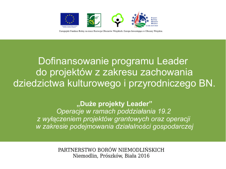 Dofinansowanie programu Leader do projektów z zakresu zachowania dziedzictwa kulturowego i przyrodniczego BN. „Duże projekty Leader” Operacje w ramach poddziałania 19.2 z wyłączeniem projektów grantowych oraz operacji w zakresie podejmowania działalności gospodarczej PARTNERSTWO BORÓW NIEMODLIŃSKICH Niemodlin, Prószków, Biała 2016 Kim jesteśmy? 8 gmin 1 010 km² 75 342 mieszkańców 126 sołectw Co już zrobiliśmy? W latach 2009-2014 128 projektów 7,5 mln zł Ośrodkiem Działaj Lokalnie O roku 2013 jesteśmy Co już zrobiliśmy? Lokalna Strategia Rozwoju (LSR) Nowa Strategia do 2020 Do roku 2020 10,1 mln zł z czego 8,1 mln zł na projekty 7 Przedsięwzięć LSR PARTNERSTWO BORÓW NIEMODLIŃSKICH Niemodlin, Prószków, Biała 2016 12 3 4 5 67 4 PRZEDSIĘWZIĘCIE 4: PRZESTRZEŃ KULTUR - materialne i niematerialne dziedzictwo kulturowe Borów Niemodlińskich - zwiększamy liczbę działań ochrony czynnej, badań i inwentaryzacji, zwiększamy poziom wiedzy o lokalnych zasobach kulturowych oraz ilość małej infrastruktury umożliwiającej dostęp do zabytków. PARTNERSTWO BORÓW NIEMODLIŃSKICH Niemodlin, Prószków, Biała 2016 5 PRZEDSIĘWZIĘCIE 5: KRAJOBRAZY - ożywione i nieożywione dziedzictwo przyrodnicze Borów Niemodlińskich - zwiększamy liczbę działań ochrony czynnej, badań i inwentaryzacji, zwiększamy poziom wiedzy o lokalnych zasobach przyrodniczych oraz ilość małej infrastruktury umożliwiającej zrównoważone korzystanie z zasobów PARTNERSTWO BORÓW NIEMODLIŃSKICH Niemodlin, Prószków, Biała 2016 Środki UE będą przez nas przyznawane w trzech rodzajach: ● Premie na rozpoczynanie działalności gosp. (operacje w zakresie podejmowania działalności gospodarczej)- dotacja do 60 000 zł Duże projekty Leader- (rozwój biznesu, dziedzictwo kulturowe i przyrodnicze, kapitał ludzki), minimalna wartość całego projektu musi wynosić 50 000 zł ● Projekty grantowe (małe projekty Leader, niebiznesowe, prospołeczne)minimalna wartość projektu musi wynosić 5 000 zł a maksymalna 50 000 zł ● PARTNERSTWO BORÓW NIEMODLIŃSKICH Niemodlin, Prószków, Biała 2016 4 5 Duże projekty Leader Duże projekty Leader Małe projekty Leader PARTNERSTWO BORÓW NIEMODLIŃSKICH Niemodlin, Prószków, Biała 2016 Duże projekty Leader: 1. Zachowanie dziedzictwa lokalnego. 2. Budowy lub przebudowy ogólnodostępnej i niekomercyjnej infrastruktury turystycznej lub rekreacyjnej, lub kulturalnej. 3. Promowania obszaru objętego LSR, w tym produktów lub usług lokalnych. PARTNERSTWO BORÓW NIEMODLIŃSKICH Niemodlin, Prószków, Biała 2016 1. Zachowanie dziedzictwa lokalnego. 2. Budowy lub przebudowy ogólnodostępnej i niekomercyjnej infrastruktury turystycznej lub rekreacyjnej lub kulturalnej. 4 5 Duże projekty Leader 3. Promowania obszaru objętego LSR, w tym produktów lub usług lokalnych. Duże projekty Leader 1. Zachowanie dziedzictwa lokalnego. 2. Budowy lub przebudowy ogólnodostępnej i niekomercyjnej infrastruktury turystycznej lub rekreacyjnej lub kulturalnej. 3. Promowania obszaru objętego LSR, w tym produktów lub usług lokalnych. ZAKRES PROJEKTÓW: 1. Zachowanie dziedzictwa lokalnego w 4: - dla JST, instytucja kultury, dla której organizatorem jest JST : - operacja dotyczy obiektów małej architektury, sprzętu i wyposażenia oraz innych elementów nie będących obiektem budowlanym, a wpisanych do rejestru bądź ewidencji zabytków, - operacja dotyczy odnawiania lub poprawy stanu zabytkowych obiektów budowlanych, służących zachowaniu dziedzictwa kulturowego w miejscowościach powyżej 5000 mieszkańców - operacja dotyczy zakupu obiektów charakterystycznych dla tradycji budownictwa w danym regionie z przeznaczeniem na cele publiczne w miejscowościach powyżej 5 000 mieszkańców, - operacja dotyczy przeprowadzenia badań związanych dziedzictwem kulturowym wsi - dla organizacji pozarządowych, innych osób prawnych, jednostek nie posiadających osob. prawnej oraz kościołów: - odnawianie lub poprawa stanu zabytkowych obiektów budowlanych, obiektów małej architektury, sprzętu i wyposażenia oraz innych elementów nie będących obiektem budowlanym, a wpisanych do rejestru bądź ewidencji zabytków, - zakup obiektów charakterystycznych dla tradycji budownictwa w danym regionie z przeznaczeniem na cele publiczne - operacja dotyczy przeprowadzenia badań związanych dziedzictwem kulturowym wsi ZAKRES PROJEKTÓW: 2. Budowy lub przebudowy ogólnodostępnej i niekomercyjnej infrastruktury turystycznej lub rekreacyjnej lub kulturalnej w 4: - dla JST: - budowa, modernizacja lub wyposażanie budynków pełniących funkcje kulturalne, w tym świetlic i domów kultury w miejscowościach powyżej 5000 mieszkańców - kształtowanie przestrzeni publ. w miejscowościach powyżej 5000 mieszkańców - dla Instytucji kultury dla której organizatorem jest JST: - budowa, modernizacja lub wyposażanie budynków pełniących funkcje kulturalne, w tym świetlic i domów kultury w miejscowościach powyżej 5000 mieszkańców - kształtowanie przestrzeni publ. zgodnie z wymaganiami ładu przestrzennego - dla organizacji pozarządowych, innych osób prawnych, jednostek nie posiadających osob. prawnej oraz kościołów: - budowa przebudowa modernizacja lub wyposażenie obiektów pełniących funkcje kulturalne, w tym świetlic i domów kultury, - kształtowanie przestrzeni publicznej ZAKRES PROJEKTÓW: 3. Promowania obszaru objętego LSR, w tym produktów lub usług lokalnych w 4: - dla JST, Instytucji kultury dla której organizatorem jest JST, organizacji pozarządowych, innych osób prawnych, jednostek nie posiadających osob. prawnej oraz kościołów: - operacja dotyczy wydawnictw - operacja dotyczy organizacji wydarzeń kulturalnych ZAKRES PROJEKTÓW: 1. Zachowanie dziedzictwa lokalnego w 5: - dla JST, instytucja kultury, dla której organizatorem jest JST, organizacji pozarządowych, innych osób prawnych, jednostek nie posiadających o