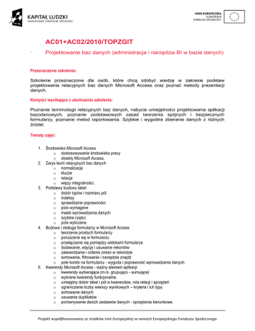 AC01+AC02/2010/TOPZGIT · Projektowanie baz danych (administracja i narzędzia BI w bazie danych) Przeznaczenie szkolenia: Szkolenie przeznaczone dla osób, które chcą zdobyć wiedzę w zakresie podstaw projektowania relacyjnych baz danych Microsoft Access oraz poznać metody prezentacji danych. Korzyści wynikające z ukończenia szkolenia: Poznanie terminologii relacyjnych baz danych, nabycie umiejętności projektowania aplikacji bazodanowych, poznanie podstawowych zasad tworzenia spójnych i bezpiecznych formularzy, poznanie metod raportowania. Szybkie i wygodne zbieranie danych z różnych źródeł. Tematy zajęć: 1. Środowisko Microsoft Access o dostosowywanie środowiska pracy o obiekty Microsoft Access. 2. Zarys teorii relacyjnych baz danych o normalizacja o klucze o relacje o więzy integralności. 3. Podstawy budowy tabel o dobór typów i rozmiaru pól o indeksy o sprawdzanie poprawności o pola wymagane o maski wprowadzania danych o szybkie części o pola wyliczane. 4. Budowa i obsługa formularzy w Microsoft Access o tworzenie prostych formularzy o poruszanie się w formularzu o przełączanie się pomiędzy widokami formularza o dodawanie, edycja i usuwanie rekordów o zatwierdzanie i cofanie zmian w rekordzie o sortowanie, filtrowanie i narzędzie znajdź o pole kombi na formularzu - wygoda i poprawność wprowadzania danych. 5. Kwerendy Microsoft Access - ważny element aplikacji o kwerendy wybierające (m.in. grupująco - sumujące) o wybrane kwerendy funkcjonalne. o umiejętny dobór tabel i pól w kwerendzie, rola relacji i sprzężeń o ograniczanie liczby wierszy wynikowych – kryteria i ich typy o sortowanie danych o usuwanie duplikatów o porównywanie dwóch zestawów danych - sprzężenia kierunkowe. Projekt współfinansowany ze środków Unii Europejskiej w ramach Europejskiego Funduszu Społecznego 6. Prezentacja danych o tworzenie raportu o formatowanie raportu o wyróżnianie danych spełniających określone kryteria o przygotowanie raportu do wydruku o dystrybucja raportu do innych formatów. 7. Eksportowanie danych o optymalne sposoby eksportowania danych do Microsoft Excel o eksport do Microsoft Word 8. Wydruki masowe o korzystanie z kreatora etykiet adresowych o drukowanie listów w korespondencji seryjnej. 9. Zakończenie prac nad aplikacją o tworzenie przycisków uruchamiających formularze, raporty, kwerendy o tworzenie formularza startowego, dającego dostęp do wszystkich funkcji aplikacji (opcje autostartu/uruchomienia) o oddzielenie danych od aplikacji. Projekt współfinansowany ze środków Unii Europejskiej w ramach Europejskiego Funduszu Społecznego