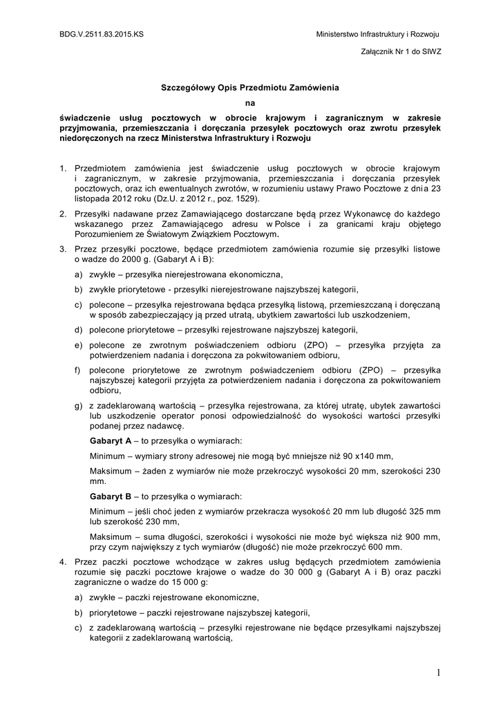 BDG.V.2511.83.2015.KS Ministerstwo Infrastruktury i Rozwoju Załącznik Nr 1 do SIWZ Szczegółowy Opis Przedmiotu Zamówienia na świadczenie usług pocztowych w obrocie krajowym i zagranicznym w zakresie przyjmowania, przemieszczania i doręczania przesyłek pocztowych oraz zwrotu przesyłek niedoręczonych na rzecz Ministerstwa Infrastruktury i Rozwoju 1. Przedmiotem zamówienia jest świadczenie usług pocztowych w obrocie krajowym i zagranicznym, w zakresie przyjmowania, przemieszczania i doręczania przesyłek pocztowych, oraz ich ewentualnych zwrotów, w rozumieniu ustawy Prawo Pocztowe z dni a 23 listopada 2012 roku (Dz.U. z 2012 r., poz. 1529). 2. Przesyłki nadawane przez Zamawiającego dostarczane będą przez Wykonawcę do każdego wskazanego przez Zamawiającego adresu w Polsce i za granicami kraju objętego Porozumieniem ze Światowym Związkiem Pocztowym. 3. Przez przesyłki pocztowe, będące przedmiotem zamówienia rozumie się przesyłki listowe o wadze do 2000 g. (Gabaryt A i B): a) zwykłe – przesyłka nierejestrowana ekonomiczna, b) zwykłe priorytetowe - przesyłki nierejestrowane najszybszej kategorii, c) polecone – przesyłka rejestrowana będąca przesyłką listową, przemieszczaną i doręczaną w sposób zabezpieczający ją przed utratą, ubytkiem zawartości lub uszkodzeniem, d) polecone priorytetowe – przesyłki rejestrowane najszybszej kategorii, e) polecone ze zwrotnym poświadczeniem odbioru (ZPO) – przesyłka przyjęta za potwierdzeniem nadania i doręczona za pokwitowaniem odbioru, f) polecone priorytetowe ze zwrotnym poświadczeniem odbioru (ZPO) – przesyłka najszybszej kategorii przyjęta za potwierdzeniem nadania i doręczona za pokwitowaniem odbioru, g) z zadeklarowaną wartością – przesyłka rejestrowana, za której utratę, ubytek zawartości lub uszkodzenie operator ponosi odpowiedzialność do wysokości wartości przesyłki podanej przez nadawcę. Gabaryt A – to przesyłka o wymiarach: Minimum – wymiary strony adresowej nie mogą być mniejsze niż 90 x140 mm, Maksimum – żaden z wymiarów nie może przekroczyć wysokości 20 mm, szerokości 230 mm. Gabaryt B – to przesyłka o wymiarach: Minimum – jeśli choć jeden z wymiarów przekracza wysokość 20 mm lub długość 325 mm lub szerokość 230 mm, Maksimum – suma długości, szerokości i wysokości nie może być większa niż 900 mm, przy czym największy z tych wymiarów (długość) nie może przekroczyć 600 mm. 4. Przez paczki pocztowe wchodzące w zakres usług będących przedmiotem zamówienia rozumie się paczki pocztowe krajowe o wadze do 30 000 g (Gabaryt A i B) oraz paczki zagraniczne o wadze do 15 000 g: a) zwykłe – paczki rejestrowane ekonomiczne, b) priorytetowe – paczki rejestrowane najszybszej kategorii, c) z zadeklarowaną wartością – przesyłki rejestrowane nie będące przesyłkami najszybszej kategorii z zadeklarowaną wartością, 1 BDG.V.2511.83.2015.KS Ministerstwo Infrastruktury i Rozwoju Załącznik Nr 1 do SIWZ d) ze zwrotnym poświadczeniem odbioru, e) priorytetowe ze zwrotnym poświadczeniem odbioru. Gabaryt A – to przesyłka o wymiarach: Minimum – wymiary strony adresowej nie mogą być mniejsze niż 90 x 140 mm, Maksimum – żaden z wymiarów nie może przekroczyć długości 600 mm, szerokość 500 mm, wysokość 300 mm. Gabaryt B – to przesyłka o wymiarach: Minimum – jeśli choć jeden z wymiarów przekracza długość 600 mm lub szerokość 500 mm lub wysokość 300 mm, Maksimum – suma długości i największego obwodu mierzonego w innym kierunku niż długość nie może być większa niż 3000 mm, przy czym największy wymiar nie może przekroczyć 1500 mm. f) nadawane na warunkach szczególnych – w przypadkach gdy przesyłka wymaga szczególnej ostrożności. g) przesyłka niestandardowa o najdłuższym boku do 2000 mm i wadze do 10 kg. 5. Wykonawca zobowiązany jest do odbioru dwa razy dziennie przesyłek przygotowanych do wyekspediowania oraz zwrotów, z Kancelarii Głównej Ministerstwa Infrastruktury i Rozwoju, zlokalizowanej w siedzibie Zamawiającego w Warszawie przy ulicy Wspólnej 2/4 od poniedziałku do piątku w godzinach między 9.00-10.00 oraz 13.00-14.00. Odbioru dokonywać będzie upoważniony przedstawiciel Wykonawcy po okazaniu upoważnienia. Odbiór przesyłek przygotowanych do wyekspediowania będzie każdorazowo dokumentowany przez Wykonawcę pieczęcią, podpisem i datą w pocztowej książce nadawczej (dla przesyłek rejestrowanych) oraz na zestawieniu ilościowym przesyłek wg poszczególnych kategorii wagowych (dla przesyłek zwykłych). 6. Zamawiający zobowiązuje się do umieszczenia na przesyłce listowej lub paczce nazwy odbiorcy wraz z jego adresem (podany jednocześnie w pocztowej książce nadawczej), określając rodzaj przesyłki (zwykła, polecona, priorytet czy ze zwrotnym poświadczeniem odbioru – ZPO) oraz umieszczania na stronie adresowej każdej nadawanej przesyłki nadruku (pieczątki) określającej pełną nazwę i adres Zamawiającego. 7. Zamawiający zobowiązuje się do właściwego przygotowania przesyłek oraz sporządzania zestawień dla przesyłek. 8. Zamawiający zakłada, że wybrane przesyłki powinny spełniać warunki skutecznego i prawidłowego doręczenia postawione w KPC, KPK i KPA oraz skutecznego doręczenia w postępowaniach prowadzonych przed sądami administracyjnymi. 9. Stały odbiór: Wykonawca zobowiązany będzie do stałego odbioru listów i paczek z siedziby Zamawiającego w Warszawie przy ul. Wspólnej 2/4. 10. Zamawiający zobowiązuje się do nadawania przesyłek w stanie uporządkowanym, przez co należy rozumieć: a) dla przesyłek rejestrowanych – wpisanie każdej przesyłki do pocztowej książki nadawczej w dwóch egzemplarzach, z których oryginał będzie przeznaczony dla Wykonawcy w celach rozliczeniowych, a kopia stanowić będzie dla Zam awiającego potwierdzenie nadania danej partii przesyłek, b) dla przesyłek zwykły