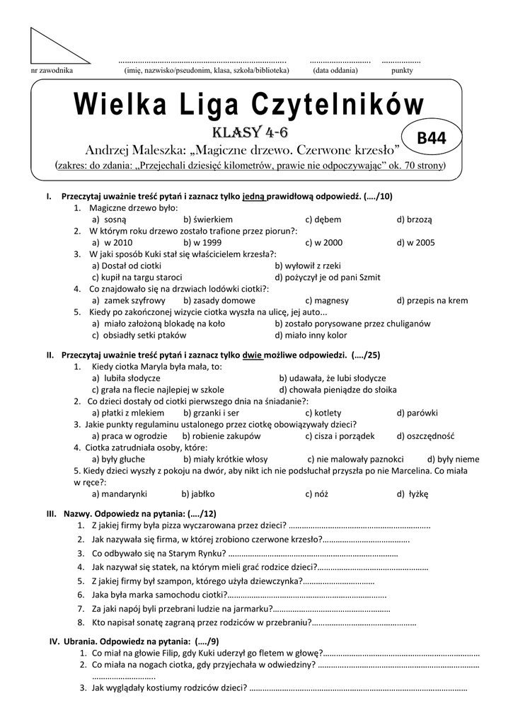 ………………………………………………………………….. nr zawodnika (imię, nazwisko/pseudonim, klasa, szkoła/biblioteka) ………………………. (data oddania) ……………… punkty Wielka Liga Czytelników KLASY 4-6 Andrzej Maleszka: „Magiczne drzewo. Czerwone krzesło” B44 (zakres: do zdania: „Przejechali dziesięć kilometrów, prawie nie odpoczywając” ok. 70 strony) I. Przeczytaj uważnie treść pytań i zaznacz tylko jedną prawidłową odpowiedź. (…./10) 1. Magiczne drzewo było: a) sosną b) świerkiem c) dębem d) brzozą 2. W którym roku drzewo zostało trafione przez piorun?: a) w 2010 b) w 1999 c) w 2000 d) w 2005 3. W jaki sposób Kuki stał się właścicielem krzesła?: a) Dostał od ciotki b) wyłowił z rzeki c) kupił na targu staroci d) pożyczył je od pani Szmit 4. Co znajdowało się na drzwiach lodówki ciotki?: a) zamek szyfrowy b) zasady domowe c) magnesy d) przepis na krem 5. Kiedy po zakończonej wizycie ciotka wyszła na ulicę, jej auto... a) miało założoną blokadę na koło b) zostało porysowane przez chuliganów c) obsiadły setki ptaków d) miało inny kolor II. Przeczytaj uważnie treść pytań i zaznacz tylko dwie możliwe odpowiedzi. (…./25) 1. Kiedy ciotka Maryla była mała, to: a) lubiła słodycze b) udawała, że lubi słodycze c) grała na flecie najlepiej w szkole d) chowała pieniądze do słoika 2. Co dzieci dostały od ciotki pierwszego dnia na śniadanie?: a) płatki z mlekiem b) grzanki i ser c) kotlety d) parówki 3. Jakie punkty regulaminu ustalonego przez ciotkę obowiązywały dzieci? a) praca w ogrodzie b) robienie zakupów c) cisza i porządek d) oszczędność 4. Ciotka zatrudniała osoby, które: a) były głuche b) miały krótkie włosy c) nie malowały paznokci d) były nieme 5. Kiedy dzieci wyszły z pokoju na dwór, aby nikt ich nie podsłuchał przyszła po nie Marcelina. Co miała w ręce?: a) mandarynki b) jabłko c) nóż d) łyżkę III. Nazwy. Odpowiedz na pytania: (…./12) 1. Z jakiej firmy była pizza wyczarowana przez dzieci? ……………………………………………………….. 2. Jak nazywała się firma, w której zrobiono czerwone krzesło?…………………………………. 3. Co odbywało się na Starym Rynku? …………………………………………………………………… 4. Jak nazywał się statek, na którym mieli grać rodzice dzieci?…………………………………………… 5. Z jakiej firmy był szampon, którego użyła dziewczynka?…………………………… 6. Jaka była marka samochodu ciotki?………………………………………………………………. 7. Za jaki napój byli przebrani ludzie na jarmarku?……………………………………………… 8. Kto napisał sonatę zagraną przez rodziców w przebraniu?………………………………………… IV. Ubrania. Odpowiedz na pytania: (…./9) 1. Co miał na głowie Filip, gdy Kuki uderzył go fletem w głowę?……………………………………………………………… 2. Co miała na nogach ciotka, gdy przyjechała w odwiedziny? …………..…………………………………………………… ……………………….. 3. Jak wyglądały kostiumy rodziców dzieci? ………………….…………………………………………………………………… V. Rozwiąż krzyżówkę. (…./14) 1. Kuki zerwał go z sufitu. 2. Imię siostry mamy Filipa. 3. Nazwisko reżysera filmowej adaptacji „Czerwonego krzesła”. 4. Instrument zniszczony przez Kukiego. 5. Kolor krzesła. 6. Imię siostry Filipa. Hasło:……………………………………………………………. VI. 1 2 3 4 5 6 Korzystając ze słowników, leksykonów lub encyklopedii w wersji papierowej przetłumacz na język angielski oraz napisz tytuł książki, z której korzystałeś (źródło): (…/6) 1. drzewo:………………………………….. 2. krzesło:……………………………………………… Żródło:…………………………………………………………………………………………………… VII. Korzystając ze słownika języka polskiego w wersji papierowej wyjaśnij pojęcia oraz napisz tytuł książki, z której korzystałeś (źródło): (…./10) 1.Haracz:……………………………………………………………………………………………………. 2.Jarmark:…………………………………………………………………………………………………… Źródło:……………………………………………………………………………………………………… VIII. Rozwiąż zadanie matematyczne: (…./6) W fabryce mebli znajdują się 3 maszyny do produkcji krzeseł. Jedna maszyna w ciągu 30 minut produkuje 10 krzeseł. Ile krzeseł zostanie wyprodukowanych w ciągu dnia, zakładając, że maszyny pracują 8 godzin dziennie? Działanie:…………………………………………………………………………………………………………………………………………………… ………………………………………………………………………………………………………………………………………………………………… Odpowiedź:………………………………………………………………………………………………… IX. Zadanie przyrodnicze: (…./6) Które z podanych drzew jest drzewem liściastym, a które iglastym: olsza - .............................................. lipa - ....................................................... modrzew - ........................................ świerk - .................................................. cis - ................................................. jesion - ................................................... X. Gdybyś był/była właścicielem magicznego krzesła,