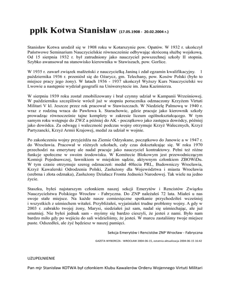 ppłk Kotwa Stanisław (17.05.1908 - 20.02.2004 r.) Stanisław Kotwa urodził się w 1908 roku w Kotarszynie pow. Opatów. W 1932 r. ukończył Państwowe Seminarium Nauczycielskie równocześnie odbywając skróconą służbę wojskową. Od 15 sierpnia 1932 r. był zatrudniony jako nauczyciel powszechnej szkoły II stopnia. Szybko awansował na stanowisko kierownika w Stawiszach, pow. Gorlice. W 1935 r. zawarł związek małżeński z nauczycielką Janiną i zdał egzamin kwalifikacyjny. 1 października 1936 r. przeniósł się do Ożarycz, gm. Telechany, pow. Kosów Polski (było to miejsce pracy jego żony). W latach 1936 - 1937 ukończył Wyższy Kurs Nauczycielski we Lwowie a następnie wydział geografii na Uniwersytecie im. Jana Kazimierza. W sierpniu 1939 roku został zmobilizowany i brał czynny udział w Kampanii Wrześniowej. W październiku szczęśliwie wrócił już w stopniu porucznika odznaczony Krzyżem Virtuti Militari V kl. Jeszcze przez rok pracował w Stawiszczach. W Niedzielę Palmową w 1940 r. wraz z rodziną wraca do Pawłowa k. Starachowic, gdzie pracuje jako kierownik szkoły prowadząc równocześnie tajne komplety w zakresie liceum ogólnokształcącego. W tym samym roku wstępuje do ZWZ a później do AK - początkowo jako zastępca dowódcy, później jako dowódca. Za odwagę i waleczność podczas wojny otrzymuje Krzyż Walecznych, Krzyż Partyzancki, Krzyż Armii Krajowej, medal za udział w wojnie. Po zakończeniu wojny przyjeżdża na Ziemie Odzyskane, początkowo do Janowic a w 1947 r. do Wrocławia. Pracował w różnych szkołach, cały czas dokształcając się. W roku 1970 przechodzi na emeryturę ale nadal pracuje jako nauczyciel kontraktowy. Pełni też różne funkcje społeczne w swoim środowisku. W Komitecie Blokowym jest przewodniczącym Komisji Pojednawczej, ławnikiem w miejskim sądzie, aktywnym członkiem ZBOWiDu. W tym czasie otrzymuje szereg odznaczeń: medal 40lecia PRL, Budowniczy Wrocławia, Krzyż Kawalerski Odrodzenia Polski, Zasłużony dla Województwa i miasta Wrocławia (srebrna i złota odznaka), Zasłużony Działacz Frontu Jedności Narodowej. Tak wiele na jedno życie. Staszku, byłeś najstarszym członkiem naszej sekcji Emerytów i Rencistów Związku Nauczycielstwa Polskiego Wrocław - Fabryczna. Do ZNP należałeś 72 lata. Miałeś u nas swoje stałe miejsce. Na każde nasze comiesięczne spotkanie przychodziłeś wcześniej i wszystkich z uśmiechem witałeś. Przybliżałeś, wyjaśniałeś trudne problemy wojny. A gdy w 2003 r. zabrakło twojej żony, Marysi, siedziałeś już sam, nadal się uśmiechając, ale już smutniej. Nie byłeś jednak sam - myśmy się bardzo cieszyli, że jesteś z nami. Było nam bardzo miło gdy po wejściu do sali widzieliśmy, że jesteś. W marcu zastaliśmy twoje miejsce puste. Odszedłeś, ale żyć będziesz w naszej pamięci. Sekcja Emerytów i Rencistów ZNP Wrocław - Fabryczna GAZETA WYBORCZA - WROCŁAW 2004-06-15, ostatnia aktualizacja 2004-06-15 16:42 UZUPEŁNIENIE Pan mjr Stanisław KOTWA był członkiem Klubu Kawalerów Orderu Wojennego Virtuti Militari pod Patronatem Szefa WSzW we Wrocławiu. Dokąd zdrowie pozwalało brał aktywny udział w spotkaniach klubowych. Na wniosek Zarządu Dolnośląskiego Związku Żołnierzy LWP im. 2 Armii WP Minister Obrony Narodowej awansował go do stopnia podpułkownika i przyznał złoty medal Za Zasługi dla Obronności Kraju. Niestety zmarł i akt nominacyjny oraz odznaczenie przesłaliśmy córce. po. Sekretarza Klubu ppłk rez. mgr Krzysztof MAJER
