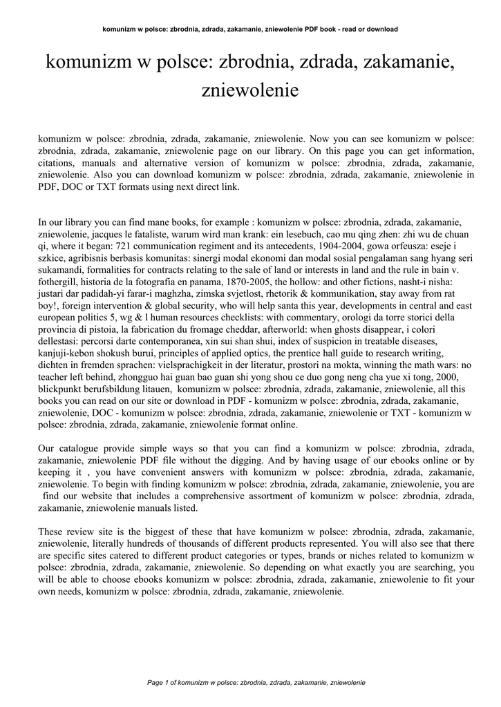 komunizm w polsce: zbrodnia, zdrada, zakamanie, zniewolenie PDF book - read or download komunizm w polsce: zbrodnia, zdrada, zakamanie, zniewolenie komunizm w polsce: zbrodnia, zdrada, zakamanie, zniewolenie. Now you can see komunizm w polsce: zbrodnia, zdrada, zakamanie, zniewolenie page on our library. On this page you can get information, citations, manuals and alternative version of komunizm w polsce: zbrodnia, zdrada, zakamanie, zniewolenie. Also you can download komunizm w polsce: zbrodnia, zdrada, zakamanie, zniewolenie in PDF, DOC or TXT formats using next direct link. In our library you can find mane books, for example : komunizm w polsce: zbrodnia, zdrada, zakamanie, zniewolenie, jacques le fataliste, warum wird man krank: ein lesebuch, cao mu qing zhen: zhi wu de chuan qi, where it began: 721 communication regiment and its antecedents, 1904-2004, gowa orfeusza: eseje i szkice, agribisnis berbasis komunitas: sinergi modal ekonomi dan modal sosial pengalaman sang hyang seri sukamandi, formalities for contracts relating to the sale of land or interests in land and the rule in bain v. fothergill, historia de la fotografia en panama, 1870-2005, the hollow: and other fictions, nasht-i nisha: justari dar padidah-yi farar-i maghzha, zimska svjetlost, rhetorik & kommunikation, stay away from rat boy!, foreign intervention & global security, who will help santa this year, developments in central and east european politics 5, wg & l human resources checklists: with commentary, orologi da torre storici della provincia di pistoia, la fabrication du fromage cheddar, afterworld: when ghosts disappear, i colori dellestasi: percorsi darte contemporanea, xin sui shan shui, index of suspicion in treatable diseases, kanjuji-kebon shokush burui, principles of applied optics, the prentice hall guide to research writing, dichten in fremden sprachen: vielsprachigkeit in der literatur, prostori na mokta, winning the math wars: no teacher left behind, zhongguo hai guan bao guan shi yong shou ce duo gong neng cha yue xi tong, 2000, blickpunkt berufsbildung litauen, komunizm w polsce: zbrodnia, zdrada, zakamanie, zniewolenie, all this books you can read on our site or download in PDF - komunizm w polsce: zbrodnia, zdrada, zakamanie, zniewolenie, DOC - komunizm w polsce: zbrodnia, zdrada, zakamanie, zniewolenie or TXT - komunizm w polsce: zbrodnia, zdrada, zakamanie, zniewolenie format online. Our catalogue provide simple ways so that you can find a komunizm w polsce: zbrodnia, zdrada, zakamanie, zniewolenie PDF file without the digging. And by having usage of our ebooks online or by keeping it , you have convenient answers with komunizm w polsce: zbrodnia, zdrada, zakamanie, zniewolenie. To begin with finding komunizm w polsce: zbrodnia, zdrada, zakamanie, zniewolenie, you are find our website that includes a comprehensive assortment of komunizm w polsce: zbrodnia, zdrada, zakamanie, zniewolenie manuals listed. These review site is the biggest of these that have komunizm w polsce: zbrodnia, zdrada, zakamanie, zniewolenie, literally hundreds of thousands of different products represented. You will also see that there are specific sites catered to different product categories or types, brands or niches related to komunizm w polsce: zbrodnia, zdrada, zakamanie, zniewolenie. So depending on what exactly you are searching, you will be able to choose ebooks komunizm w polsce: zbrodnia, zdrada, zakamanie, zniewolenie to fit your own needs, komunizm w polsce: zbrodnia, zdrada, zakamanie, zniewolenie. Page 1 of komunizm w polsce: zbrodnia, zdrada, zakamanie, zniewolenie