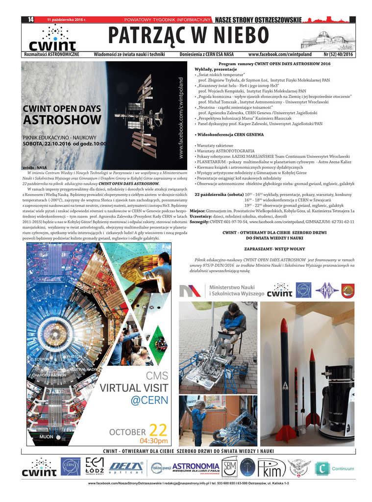 14 11 października 2016 r. Rozmaitości ASTRONOMICZNE PATRZĄC W NIEBO Wiadomości ze świata nauki i techniki Doniesienia z CERN ESA NASA www.facebook.com/cwintpoland Nr (52) 40/2016 Program ramowy CWINT OPEN DAYS ASTROSHOW 2016 Wykłady, prezentacje • „Świat niskich temperatur” prof. Zbigniew Trybuła, dr Szymon Łoś, Instytut Fizyki Molekularnej PAN • „Kwantowy świat helu - He4 i jego izotop He3” prof. Wojciech Kempiński, Instytut Fizyki Molekularnej PAN • „Pogoda kosmiczna - wpływ zjawisk słonecznych na Ziemię i jej bezpośrednie otoczenie” prof. Michał Tomczak , Instytut Astronomiczny - Uniwersytet Wrocławski • „Neutrina - cząstki zmieniające tożsamość” prof. Agnieszka Zalewska, CERN Genewa /Uniwersytet Jagielloński • „Perspektywa kolonizacji Marsa” Kazimierz Błaszczak • Panel dyskusyjny prof. Kacper Zalewski, Uniwersytet Jagielloński/PAN • Wideokonferencja CERN GENEWA • Warsztaty rakietowe • Warsztaty ASTROFOTOGRAFIA • Pokazy robotyczne: ŁAZIKI MARSJAŃSKIE Team Continuum Uniwersytet Wrocławski • PLANETARIUM - pokazy multimedialne w planetarium cyfrowym - Astro Arena Kalisz • Kiermasz książek i astronomicznych pomocy dydaktycznych • Występy artystyczne młodzieży z Gimnazjum w Kobylej Górze • Prezentacje osiągnięć kół naukowych młodzieży • Obserwacje astronomiczne obiektów głębokiego nieba: gromad gwiazd, mgławic, galaktyk W imieniu Centrum Wiedzy i Nowych Technologii w Parzynowie i we współpracy z Ministerstwem Nauki i Szkolnictwa Wyższego oraz Gimnazjum i Urzędem Gminy w Kobylej Górze zapraszamy w sobotę 22 października na piknik edukacyjno-naukowy CWINT OPEN DAYS ASTROSHOW. W ramach imprezy przygotowaliśmy dla dzieci, młodzieży i dorosłych wiele atrakcji związanych z Kosmosem i Wielką Nauką. Będziemy prowadzić eksperymenty z ciekłym azotem w skrajnie niskich 22 października (sobota) 1000 - 1600 wykłady, prezentacje, pokazy, warsztaty, konkursy temperaturach (-200°C), zajrzymy do wnętrza Słońca i zjawisk tam zachodzących, porozmawiamy 1630 - 1800 wideokonferencja z CERN w Szwajcarii z zaproszonymi naukowcami na temat neutrin, ciemnej materii, antymaterii i izotopu He3. Będziemy 1900 - 2200 obserwacje gromad gwiazd, mgławic, galaktyk stawiać wiele pytań i szukać odpowiedzi również u naukowców w CERN w Genewie podczas bezpo- Miejsce: Gimnazjum im. Powstańców Wielkopolskich, Kobyla Góra, ul. Kazimierza Tetmajera 1a średniej wideokonferencji – tym razem prof. Agnieszka Zalewska (Prezydent Rady CERN w latach Uczestnicy: dzieci, młodzież szkolna, studenci, dorośli 2011-2015) będzie u nas w Kobylej Górze! Będziemy montować i odpalać rakiety, sterować robotami Szczegóły: CWINT: 601-97-70-54, www.facebook.com/cwintpoland, GIMNAZJUM: 62 731-62-11 marsjańskimi, wejdziemy w świat astrofotografii, obejrzymy multimedialne prezentacje w planetarium cyfrowym, spotkamy wielu interesujących i ciekawych ludzi! A gdy wieczorem i nocą pogoda CWINT - OTWIERAMY DLA CIEBIE SZEROKO DRZWI pozwoli będziemy podziwiać kuliste gromady gwiazd, mgławice i odległe galaktyki. DO ŚWIATA WIEDZY I NAUKI ZAPRASZAMY- WSTĘP WOLNY Piknik edukacyjno-naukowy CWINT OPEN DAYS ASTROSHOW jest finansowany w ramach umowy 975/P-DUN/2016 ze środków Ministra Nauki i Szkolnictwa Wyższego przeznaczonych na działalność upowszechniającą naukę C WINT - OTWIERAMY DLA CIEBIE SZEROKO DRZWI DO ŚWIATA WIEDZ Y I NAUKI www.facebook.com/NaszeStronyOstrzeszowskie I [email protected] I tel. 533 600 655 I 63-500 Ostrzeszów, ul. Kaliska 1-3