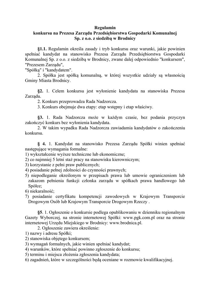 Regulamin konkursu na Prezesa Zarządu Przedsiębiorstwa Gospodarki Komunalnej Sp. z o.o. z siedzibą w Brodnicy §1.1. Regulamin określa zasady i tryb konkursu oraz warunki, jakie powinien spełniać kandydat na stanowisko Prezesa Zarządu Przedsiębiorstwa Gospodarki Komunalnej Sp. z o.o. z siedzibą w Brodnicy, zwane dalej odpowiednio "konkursem", "Prezesem Zarządu", "Spółką" i "kandydatem". 2. Spółka jest spółką komunalną, w której wszystkie udziały są własnością Gminy Miasta Brodnicy. §2. 1. Celem konkursu jest wyłonienie kandydata na stanowiska Prezesa Zarządu. 2. Konkurs przeprowadza Rada Nadzorcza. 3. Konkurs obejmuje dwa etapy: etap wstępny i etap właściwy. §3. 1. Rada Nadzorcza może w każdym czasie, bez podania przyczyn zakończyć konkurs bez wyłonienia kandydata. 2. W takim wypadku Rada Nadzorcza zawiadamia kandydatów o zakończeniu konkursu. § 4. 1. Kandydat na stanowisko Prezesa Zarządu Spółki winien spełniać następujące wymagania formalne: 1) wykształcenie wyższe techniczne lub ekonomiczne; 2) co najmniej 5 letni staż pracy na stanowisku kierowniczym; 3) korzystanie z pełni praw publicznych; 4) posiadanie pełnej zdolności do czynności prawnych; 5) niepodleganie określonym w przepisach prawa lub umowie ograniczeniom lub zakazom pełnienia funkcji członka zarządu w spółkach prawa handlowego lub Spółce; 6) niekaralność; 7) posiadanie certyfikatu kompetencji zawodowych w Krajowym Transporcie Drogowym Osób lub Krajowym Transporcie Drogowym Rzeczy . §5. 1. Ogłoszenie o konkursie podlega opublikowaniu w dzienniku regionalnym Gazety Wyborczej, na stronie internetowej Spółki: www.pgk.com.pl oraz na stronie internetowej Urzędu Miejskiego w Brodnicy: www.brodnica.pl. 2. Ogłoszenie zawiera określenie: 1) nazwy i adresu Spółki; 2) stanowiska objętego konkursem; 3) wymagań formalnych, jakie winien spełniać kandydat; 4) warunków, które spełniać powinno zgłoszenie do konkursu; 5) terminu i miejsca złożenia zgłoszenia kandydata; 6) zagadnień, które w szczególności będą oceniane w rozmowie kwalifikacyjnej. §6. 1. Kandydat może do dnia upływu terminu do składania zgłoszeń uzyskać w Urzędzie Miejskim w Brodnicy – Biuro Nadzoru Audytu i Kontroli informacje o Spółce ( pokój nr 309 , tel. 564930627 ). 2. Informacje obejmują: 1) aktualny odpis z Rejestru Przedsiębiorców KRS Spółki; 2) Akt Założycielski Spółki (tekst jednolity); 3) sprawozdania finansowe Spółki za 2010r. i 2011r.; 4) sprawozdania Zarządu Spółki za 2010r. i 2011r. §7. 1. Pisemne zgłoszenia do konkursu należy złożyć w zaklejonej, niepodpisanej kopercie z napisem "Konkurs na stanowisko Prezesa Zarządu Przedsiębiorstwa Gospodarki Komunalnej Sp. z o.o. w Brodnicy." 2. Zgłoszenia będą przyjmowane w terminie do dnia 11 maja 2012r. do godz. 14.00 w siedzibie Urzędzie Miejskim w Brodnicy (pok. 211) lub listownie na adres: Urząd Miejski w Brodnicy, ul. Kamionka 23, 87-300 Brodnica (decyduje data i godzina wpływu ). 3. Zgłoszenia kandydatów złożone po upływie terminu określonego do ich przyjmowania nie podlegają rozpatrzeniu. §8.1. Zgłoszenie kandydata powinno zawierać: 1) list motywacyjny; 2) kwestionariusz osobowy ze zdjęciem wraz z danymi kontaktowymi; 3) dyplom ukończenia studiów wyższych; 4) świadectwa pracy, zaświadczenie o niezakończonych okresach zatrudnienia, potwierdzające co najmniej 5 letni staż pracy na stanowisku kierowniczym; 5) oświadczenie o korzystaniu z pełni praw publicznych; 6) oświadczenie o posiadaniu pełnej zdolności do czynności prawnych; 7) oświadczenie o niepodleganiu wynikającym z przepisów prawa lub umowy ograniczeniom lub zakazom zajmowania stanowiska członka zarządu w spółkach handlowych lub Spółce; 8) oświadczenie o niekaralności; 9) oświadczenie o nietoczeniu się przeciwko kandydatowi postępowania karnego; 10) zaświadczenie lekarskie o stanie zdrowia stwierdzające zdolność do pracy na stanowisku Prezesa Zarządu (wystawione nie wcześniej niż 3 miesiące przed upływem terminu składania zgłoszenia do konkursu); 11) inne dokumenty poświadczające dodatkowe kwalifikacje, doświadczenie zawodowe i osiągnięcia zawodowe np. : zaświadczenia o ukończeniu kursów i szkoleń oraz o nagrodach i wyróżnieniach; 12) oświadczenie o złożeniu oświadczenia lustracyjnego w związku z kandydowaniem lub o złożeniu informacji o uprzednim złożeniu oświadczenia lustracyjnego; 13) oświadczenie o wyrażeniu zgody na przetwarzanie danych osobowych w zakresie niezbędnym do przeprowadzenia konkursu. 2. Do zgłoszenia dołącza się w oryginałach lub odpisach dokumenty potwierdzające wykształcenie, staż pracy, stan zdrowia oraz dokumenty dotyczące dodatkowych kwalifikacji, doświadczenia zawodowego i osiągnięć zawodowych. 3. Odpisy dokumentów, o których mowa w ust. 2, mogą być poświadczone przez kandydata. W takim przypadku w trakcie rozmowy kwalifikacyjnej kandydat jest obowiązany do przedstawienia Radzie Nadzorczej oryginałów lub urzędowych odpisów dokumentów, pod rygorem wykluczenia z dalszego postępowania konkursowego. §9. Do zgłoszenia kandydat dołącza ponadto sporządzoną na piśmie koncepcję funkcjonowania i rozwoju Spółki. Opracowanie powinno obejmować nie więcej niż 5 stron, format A-4. §10. 1. Etap wstępny konkursu, który odbywa się bez udziału kandydatów, polega na sprawdzeniu spełnienia przez kandydatów wymagań formalnych, określonych w ogłoszeniu. 2. Decyzję o dopuszczeniu poszczególnych kandydatów do właściwego etapu konkursu podejmuje Rada Nadzorcza. 3. Dopuszczenie przez Radę Nadzorczą choćby jednego kandydata do właściwego etapu konkursu uprawnia do przeprowadzenia konkursu do końca. 4. Osobom, które nie zostały zakwalifikowane do etapu właściwego zwraca się listem poleconym złożone przez nie dokumenty. §11. Etap właściwy obejmuje ocenę koncepcji funkcjonowania i rozwoju Spó