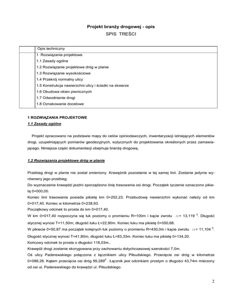 Projekt branŜy drogowej - opis SPIS TREŚCI Opis techniczny 1 Rozwiązania projektowe 1.1 Zasady ogólne 1.2 Rozwiązanie projektowe dróg w planie 1.3 Rozwiązanie wysokościowe 1.4 Przekrój normalny ulicy 1.5 Konstrukcja nawierzchni ulicy i ścieŜki na skwerze 1.6 Obudowa okien piwnicznych 1.7 Odwodnienie drogi 1.8 Oznakowanie docelowe 1 ROZWIĄZANIA PROJEKTOWE 1.1 Zasady ogólne Projekt opracowano na podstawie mapy do celów opiniodawczych, inwentaryzacji istniejących elementów drogi, uzupełniających pomiarów geodezyjnych, wytycznych do projektowania określonych przez zamawiającego. Niniejsza część dokumentacji obejmuje branŜę drogową. 1.2 Rozwiązania projektowe dróg w planie Przebieg drogi w planie nie został zmieniony. KrawęŜnik pozostanie w tej samej linii. Zostanie jedynie wyrównany jego przebieg. Do wyznaczenie krawędzi jezdni sporządzono linię trasowania osi drogi. Początek tyczenie oznaczono pikietą 0+000,00. Koniec linii trasowania posiada pikietę km 0+252,23. Przebudowę nawierzchni wykonać naleŜy od km 0+017,40. Koniec w kilometrze 0+238,93. Początkowy odcinek to prosta do km 0+017,40. 0 W km 0+017,40 rozpoczyna się łuk poziomy o promieniu R=100m i kącie zwrotu a= 13,119 . Długość stycznej wynosi T=11,50m; długość łuku Ł=22,90m. Koniec łuku ma pikietę 0+050,68. 0 W pikiecie 0+50,87 ma początek kolejnych łuk poziomy o promieniu R=430,0m i kącie zwrotu a= 11,104 . Długość stycznej wynosi T=41,80m; długość łuku Ł=83,33m. Koniec łuku ma pikietę 0+134,20. Końcowy odcinek to prosta o długości 118,03m.. Krawędź drogi zostanie skorygowana przy zachowaniu dotychczasowej szerokości 7,0m. Oś ulicy Paderewskiego połączona z łącznikiem ulicy Piłsudskiego. Przecięcie osi dróg w kilometrze 0 0+088,28. Kątem przecięcia osi dróg 99,289 . Łącznik jest odcinkiem prostym o długości 43,74m mierzony od osi ul. Paderewskiego do krawędzi ul. Piłsudskiego. 2 Wyokrąglenia łuków na skrzyŜowaniach R=5,0m; R=7,0m; wyjątkowo R=4,0m. Na wysepce kanalizującej przy skrzyŜowaniu ulic świrki i Wigury, promienie wyokrąglające krawędź wysepki R=2,0m. 1.3 Rozwiązania wysokościowe Dla dróg wykonano profile wykorzystując dane z pomiarów geodezyjnych. Obszar, na którym połoŜona jest ulica Paderewskiego poddany był działalności górniczej. Ze względu na wieloletnie szkody górnicze, rzędne w projekcie mogą nieznacznie róŜnić się od rzeczywistych. Projektowane rzędne na krawęŜniku naleŜy odnieść w terenie i uwzględnić istniejące zagospodarowanie. Rozwiązanie docelowe nie moŜe kolidować z cokołem ogrodzenia przedszkola oraz wejściem do posesji nr 11, które jest w poziomie chodnika. W przypadku wymaganej korekty niwelety drogi, szczególnie na początkowym odcinku ulicy, naleŜy zmianę uzgodnić z Inspektorem nadzoru. od km 0+000,00 do km 0+032,23 spadek i=+0,01% od km 0+032,23 do km 0+087,29 spadek i=-0,43% od km 0+087,29 do km 0+101,21 łuk pionowy R=1200m od km 0+101,21 do km 0+173,75 spadek i=-1,59% od km 0+173,75 do km 0+183,85 łuk pionowy R=1200m od km 0+183,85 do km 0+252,23 spadek i=-0,69% Odcinek 3-4 Od km 0+000 do km 0+006,41 spadek -2,% Od km 0+006,41 do km 0+012,51 łuk pionowy R=100 Od km 0+012,51 do km 0+034,38 spadek – 8,1% Od km 0+034,28 do km 0+0+44,38 łuk pionowy R=100 1.4 Przekrój normalny ulicy Ulica Paderewskiego posiada szerokość miedzy krawęŜnikami 7,0m. Na całej długości projektowanej ulicy spadek poprzeczny dwustronny wynosi 2%,. Rzędna na krawędzi jezdni jest obniŜona o 6cm od rzędnej w osi. Ściek jest obniŜony o 1cm od rzędnej nawierzchni. KrawęŜnik posiada wysokość 12 cm mierzoną od poziomu ścieku. Na zjazdach wysokość krawęŜnika wynosi 5cm a na przejściach dla pieszych nie więcej niŜ 2cm. Spadek poprzeczny na chodniku wynosi 2% w kierunku krawędzi jezdni. Szerokość chodnika jest zmienna ze względu na przyległe budynki. Chodniki wzdłuŜ ogrodzenia szpitala wytyczyć w granicy działki pasa drogowego tak by wyeliminować przycinanie kostek lub płyt chodnikowych. 1.5 Przekroje konstrukcyjne nawierzchni ulicy i ścieŜki na skwerze Kategorię ruchu ustalono na KR-2. PodłoŜe gruntowe G3 - wątpliwe. Przyjęto konstrukcję nawierzchni jezdni - warstwa ścieralna beton asfaltowy AC11S, grubość warstwy 5cm, - podbudowa zasadnicza, beton asfaltowy AC22P, grubość warstwy 7cm, - podbudowa z kamienia łamanego niezwiązanego 0/31,5 – grubość warstwy 20cm, 3 - wzmocnienie z kruszywa stabilizowanego cementem, Rm=2,5 MPa, gr. w-wy 15cm. KrawęŜnik: - krawęŜnik kamienny 15x30cm nowy, - podsypka cementowo-piaskowa, grubość warstwy 3 cm, - ława betonowa 15x30cm z oporem 18x15cm z betonu marki C12/15. Ściek kamienny: - ściek z trzech rzędów kostki 9/11 z odzysku, - podsypka cementowo-piaskowa, grubość warstwy 5 cm, - ława betonowa 15x30cm z betonu marki C12/15. Spoiny wypełnione zaprawą cementową Nawierzchnia chodnika z kostki kamiennej (ulica): - warstwa ścieralna z kostki kamiennej 9/11 z odzysku, grubość warstwy 10cm, - podsypka cementowo-piaskowa, grubość warstwy 3 cm, - podbudowa z kamienia łamanego 0/31,5 – grubość warstwy 15cm, - wzmocnienie z kruszywa stabilizowanego cementem, Rm=1,5 MPa, gr. w-wy 10cm. Nawierzchnia przylega do ściany budynku, lub ograniczona jest obrzeŜem kamiennym 8x30cm ułoŜonym na ławie betonowej. Dotyczy to odcinka przylegającego do pasa zieleni. Dopuszcza się zastosowanie krawęŜników kamiennych z odzysku. Spoiny w kostce wypełnione zaprawą cementową. Kostka układana w rzędach po obu stronach płyt chodnikowych. Dopuszcza się układanie kostki w łuki „segment” jeśli szerokość chodnika będzie wystarczająca. Nawierzchnia chodnika z płyt betonowych (ulica): - warstwa ścieralna – płyty betonowe o wymiarach 40x40cm– grubość warstwy około 7cm. Powierzchnia ścieralna płukana, zabezpieczona przed działaniem soli, promieniami UHV. Kolor jasny granit. Uz