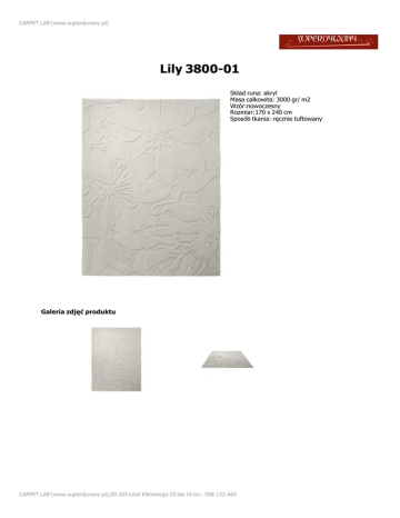 CARPET LAB (www.superdywany.pl) Lily 3800-01 Skład runa: akryl Masa całkowita: 3000 gr/ m2 Wzór:nowoczesny Rozmiar:170 x 240 cm Sposób tkania: ręcznie tuftowany Galeria zdjęć produktu CARPET LAB (www.superdywany.pl),90-205 Łódź Kilińskiego 25 lok.16 tel.: 508-132-665