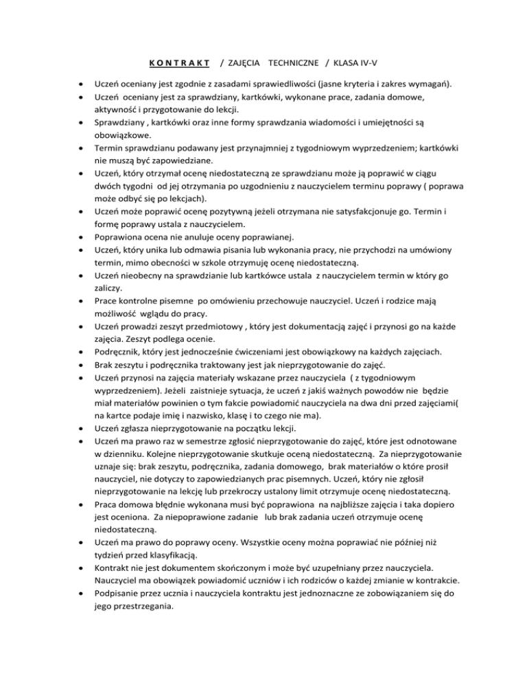 KONTRAKT / ZAJĘCIA TECHNICZNE / KLASA IV-V Uczeń oceniany jest zgodnie z zasadami sprawiedliwości (jasne kryteria i zakres wymagań). Uczeń oceniany jest za sprawdziany, kartkówki, wykonane prace, zadania domowe, aktywność i przygotowanie do lekcji. Sprawdziany , kartkówki oraz inne formy sprawdzania wiadomości i umiejętności są obowiązkowe. Termin sprawdzianu podawany jest przynajmniej z tygodniowym wyprzedzeniem; kartkówki nie muszą być zapowiedziane. Uczeń, który otrzymał ocenę niedostateczną ze sprawdzianu może ją poprawić w ciągu dwóch tygodni od jej otrzymania po uzgodnieniu z nauczycielem terminu poprawy ( poprawa może odbyć się po lekcjach). Uczeń może poprawić ocenę pozytywną jeżeli otrzymana nie satysfakcjonuje go. Termin i formę poprawy ustala z nauczycielem. Poprawiona ocena nie anuluje oceny poprawianej. Uczeń, który unika lub odmawia pisania lub wykonania pracy, nie przychodzi na umówiony termin, mimo obecności w szkole otrzymuję ocenę niedostateczną. Uczeń nieobecny na sprawdzianie lub kartkówce ustala z nauczycielem termin w który go zaliczy. Prace kontrolne pisemne po omówieniu przechowuje nauczyciel. Uczeń i rodzice mają możliwość wglądu do pracy. Uczeń prowadzi zeszyt przedmiotowy , który jest dokumentacją zajęć i przynosi go na każde zajęcia. Zeszyt podlega ocenie. Podręcznik, który jest jednocześnie ćwiczeniami jest obowiązkowy na każdych zajęciach. Brak zeszytu i podręcznika traktowany jest jak nieprzygotowanie do zajęć. Uczeń przynosi na zajęcia materiały wskazane przez nauczyciela ( z tygodniowym wyprzedzeniem). Jeżeli zaistnieje sytuacja, że uczeń z jakiś ważnych powodów nie będzie miał materiałów powinien o tym fakcie powiadomić nauczyciela na dwa dni przed zajęciami( na kartce podaje imię i nazwisko, klasę i to czego nie ma). Uczeń zgłasza nieprzygotowanie na początku lekcji. Uczeń ma prawo raz w semestrze zgłosić nieprzygotowanie do zajęć, które jest odnotowane w dzienniku. Kolejne nieprzygotowanie skutkuje oceną niedostateczną. Za nieprzygotowanie uznaje się: brak zeszytu, podręcznika, zadania domowego, brak materiałów o które prosił nauczyciel, nie dotyczy to zapowiedzianych prac pisemnych. Uczeń, który nie zgłosił nieprzygotowanie na lekcję lub przekroczy ustalony limit otrzymuje ocenę niedostateczną. Praca domowa błędnie wykonana musi być poprawiona na najbliższe zajęcia i taka dopiero jest oceniona. Za niepoprawione zadanie lub brak zadania uczeń otrzymuje ocenę niedostateczną. Uczeń ma prawo do poprawy oceny. Wszystkie oceny można poprawiać nie później niż tydzień przed klasyfikacją. Kontrakt nie jest dokumentem skończonym i może być uzupełniany przez nauczyciela. Nauczyciel ma obowiązek powiadomić uczniów i ich rodziców o każdej zmianie w kontrakcie. Podpisanie przez ucznia i nauczyciela kontraktu jest jednoznaczne ze zobowiązaniem się do jego przestrzegania.