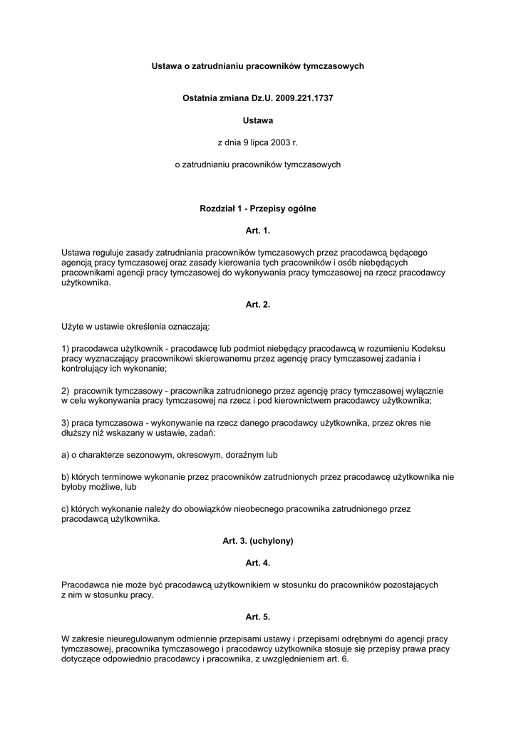 Ustawa o zatrudnianiu pracowników tymczasowych Ostatnia zmiana Dz.U. 2009.221.1737 Ustawa z dnia 9 lipca 2003 r. o zatrudnianiu pracowników tymczasowych Rozdział 1 - Przepisy ogólne Art. 1. Ustawa reguluje zasady zatrudniania pracowników tymczasowych przez pracodawcą będącego agencją pracy tymczasowej oraz zasady kierowania tych pracowników i osób niebędących pracownikami agencji pracy tymczasowej do wykonywania pracy tymczasowej na rzecz pracodawcy użytkownika. Art. 2. Użyte w ustawie określenia oznaczają: 1) pracodawca użytkownik - pracodawcę lub podmiot niebędący pracodawcą w rozumieniu Kodeksu pracy wyznaczający pracownikowi skierowanemu przez agencję pracy tymczasowej zadania i kontrolujący ich wykonanie; 2) pracownik tymczasowy - pracownika zatrudnionego przez agencję pracy tymczasowej wyłącznie w celu wykonywania pracy tymczasowej na rzecz i pod kierownictwem pracodawcy użytkownika; 3) praca tymczasowa - wykonywanie na rzecz danego pracodawcy użytkownika, przez okres nie dłuższy niż wskazany w ustawie, zadań: a) o charakterze sezonowym, okresowym, doraźnym lub b) których terminowe wykonanie przez pracowników zatrudnionych przez pracodawcę użytkownika nie byłoby możliwe, lub c) których wykonanie należy do obowiązków nieobecnego pracownika zatrudnionego przez pracodawcą użytkownika. Art. 3. (uchylony) Art. 4. Pracodawca nie może być pracodawcą użytkownikiem w stosunku do pracowników pozostających z nim w stosunku pracy. Art. 5. W zakresie nieuregulowanym odmiennie przepisami ustawy i przepisami odrębnymi do agencji pracy tymczasowej, pracownika tymczasowego i pracodawcy użytkownika stosuje się przepisy prawa pracy dotyczące odpowiednio pracodawcy i pracownika, z uwzględnieniem art. 6. Art. 6. Do pracowników tymczasowych nie stosuje się przepisów ustawy z dnia 13 marca 2003 r. o szczególnych zasadach rozwiązywania z pracownikami stosunków pracy z przyczyn niedotyczących pracowników. Rozdział II - Zasady zatrudniania pracowników tymczasowych i kierowania tych pracowników do wykonywania pracy tymczasowej Art. 7. Agencja pracy tymczasowej zatrudnia pracowników tymczasowych na podstawie umowy o pracę na czas określony lub umowy o pracę na czas wykonania określonej pracy. Art. 8. Pracownikowi tymczasowemu nie może być powierzone wykonywanie na rzecz pracodawcy użytkownika pracy: 1) szczególnie niebezpiecznej w rozumieniu przepisów wydanych na podstawie art. 23715 Kodeksu pracy; 2) na stanowisku pracy, na którym jest zatrudniony pracownik pracodawcy użytkownika, w okresie uczestniczenia tego pracownika w strajku; 3) na stanowisku pracy, na którym, w okresie ostatnich 3 miesięcy poprzedzających przewidywany termin rozpoczęcia wykonywania pracy tymczasowej przez pracownika tymczasowego, był zatrudniony pracownik pracodawcy użytkownika, z którym został rozwiązany stosunek pracy z przyczyn niedotyczących pracowników. Art. 9. 1. W celu zawarcia umowy o pracę między agencją pracy tymczasowej a pracownikiem tymczasowym pracodawca użytkownik uzgadnia z tą agencją na piśmie: 1) rodzaj pracy, która ma być powierzona pracownikowi tymczasowemu; 2) wymagania kwalifikacyjne konieczne do wykonywania pracy, która ma być powierzona pracownikowi tymczasowemu; 3) przewidywany okres wykonywania pracy tymczasowej; 4) wymiar czasu pracy pracownika tymczasowego; 5) miejsce wykonywania pracy tymczasowej. 2. Pracodawca użytkownik informuje agencję pracy tymczasowej na piśmie o: 1) wynagrodzeniu za pracę, która ma być powierzona pracownikowi tymczasowemu, określonym w przepisach o wynagrodzeniu obowiązujących u pracodawcy użytkownika; 2) warunkach wykonywania pracy tymczasowej w zakresie dotyczącym bezpieczeństwa i higieny pracy. 2a. Pracodawca użytkownik dostarcza pracownikowi tymczasowemu odzież i obuwie robocze oraz środki ochrony indywidualnej, zapewnia napoje i posiłki profilaktyczne, przeprowadza szkolenia w zakresie bezpieczeństwa i higieny pracy, ustala okoliczności i przyczyny wypadku przy pracy, przeprowadza ocenę ryzyka zawodowego oraz informuje o tym ryzyku. 2b. Do sposobu i terminów przeprowadzania szkoleń w zakresie bezpieczeństwa i higieny pracy przepisy Kodeksu pracy stosuje się odpowiednio. 3. Przed zawarciem umowy o pracę między agencją pracy tymczasowej a pracownikiem tymczasowym agencja pracy tymczasowej i pracodawca użytkownik uzgadniają na piśmie: 1) zakres informacji dotyczących przebiegu pracy tymczasowej, które mają wpływ na wysokość wynagrodzenia za pracę pracownika tymczasowego, oraz sposób i termin przekazywania tych informacji agencji pracy tymczasowej w celu prawidłowego obliczania wynagrodzenia za pracę tego pracownika; 2) zakres przejęcia przez pracodawcę użytkownika obowiązków pracodawcy dotyczących bezpieczeństwa i higieny pracy innych niż określone w ust. 2a; 3) zakres przejęcia przez pracodawcę użytkownika obowiązku pracodawcy dotyczącego wypłacania należności na pokrycie kosztów związanych z podróżą służbową. Art. 10. 1. Agencja pracy tymczasowej i pracodawca użytkownik mogą uzgodnić wykorzystanie przez pracownika tymczasowego urlopu wypoczynkowego, w całości lub w części, w okresie wykonywania pracy tymczasowej na rzecz tego pracodawcy użytkownika, ustalając zarazem tryb udzielenia tego urlopu. 2. Jeżeli okres wykonywania pracy na rzecz danego pracodawcy użytkownika obejmuje 6 miesięcy lub okres dłuższy, pracodawca użytkownik jest obowiązany umożliwić pracownikowi tymczasowemu wykorzystanie w tym okresie urlopu wypoczynkowego, udzielając, w terminie uzgodnionym z tym pracownikiem, czasu wolnego od pracy w wymiarze odpowiadającym przysługującemu temu pracownikowi urlopowi wypoczynkowemu. Art. 11. O uzgodnieniach, o których mowa w art. 9 i 10, agencja pracy tymczasowej zawiadamia osobę, której ma być powierzone wykonywanie pracy tymczasowej, przed zawarciem z nią umowy o pracę. Art. 12. U