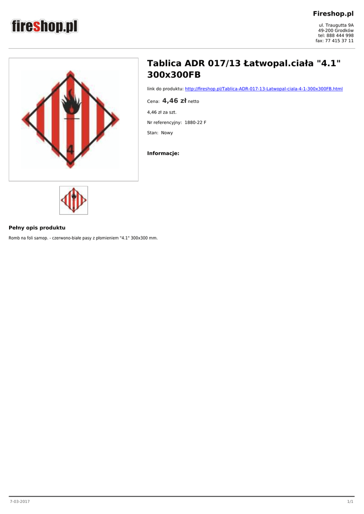 Fireshop.pl ul. Traugutta 9A 49-200 Grodków tel: 888 444 998 fax: 77 415 37 11 Tablica ADR 017/13 Łatwopal.ciała "4.1" 300x300FB link do produktu: http://fireshop.pl/Tablica-ADR-017-13-Latwopal-ciala-4-1-300x300FB.html Cena: 4,46 zł netto 4,46 zł za szt. Nr referencyjny: 1880-22 F Stan: Nowy Informacje: Pełny opis produktu Romb na foli samop. - czerwono-białe pasy z płomieniem "4.1" 300x300 mm. 7-03-2017 1/1