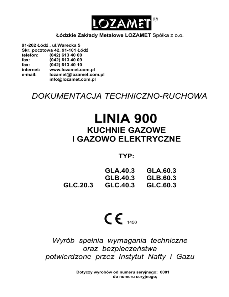 LOZAMEt Łódzkie Zakłady Metalowe LOZAMET Spółka z o.o. 91-202 Łódź , ul.Warecka 5 Skr. pocztowa 42, 91-101 Łódź telefon: (042) 613 40 00 fax: (042) 613 40 09 fax: (042) 613 40 10 internet: www.lozamet.com.pl e-mail: [email protected] [email protected] DOKUMENTACJA TECHNICZNO-RUCHOWA LINIA 900 KUCHNIE GAZOWE I GAZOWO ELEKTRYCZNE TYP: GLC.20.3 GLA.40.3 GLB.40.3 GLC.40.3 GLA.60.3 GLB.60.3 GLC.60.3 1450 Wyrób spełnia wymagania techniczne oraz bezpieczeństwa potwierdzone przez Instytut Nafty i Gazu Dotyczy wyrobów od numeru seryjnego; 0001 do numeru seryjnego; SPIS TREŚCI strona 1 CHARAKTERYSTYKA ....................................................................................................................... 3 1.1 Zastosowanie .............................................................................................................................. 3 1.2 Charakterystyka techniczna...................................................................................................... 3 1.3 Ogólny opis ................................................................................................................................. 7 2 INSTRUKCJA MONTAŻU................................................................................................................... 7 2.1 Ustawienie ................................................................................................................................... 7 2.2 Przyłączenie do instalacji........................................................................................................... 8 2.2.1 Wentylacja ................................................................................................................................ 8 2.2.2 Przyłączenia do instalacji gazowej......................................................................................... 8 2.2.2 Przyłączenie do instalacji elektrycznej .................................................................................. 9 2.3 Montaż wyposażenia dodatkowego ........................................................................................ 10 2.4 Przystosowanie do spalania innego gazu ............................................................................ 11 3 INSTRUKCJA OBSŁUGI .................................................................................................................. 12 3.1 Przygotowanie kuchni do pracy .............................................................................................. 12 3.2 Próbny rozruch.......................................................................................................................... 13 3.3 Czynności podczas pracy ........................................................................................................ 13 3.3.1 Zapalanie palników nawierzchniowych (do gotowania)..................................................... 13 3.3.2 Czynności podczas gotowania i smażenia na palnikach nawierzchniowych .................. 13 3.3.3 Zapalenie palnika piekarnika gazowego.............................................................................. 14 3.3.4 Włączenie piekarnika elektrycznego.................................................................................... 14 3.3.5 Czynności podczas pieczenia w piekarniku........................................................................ 15 3.3.6 Czynności po zakończeniu pracy......................................................................................... 16 3.4 Uwagi eksploatacyjne............................................................................................................... 16 4 WSKAZANIA BEZPIECZAŃSTWA I HIGIENY PRACY ................................................................... 16 5 INSTRUKCJA KONSERWACJI, KONSERWACJA I NAPRAWY ................................................... 18 5.1 Konserwacja bieżąca ................................................................................................................ 18 5.2 Konserwacja okresowa ............................................................................................................ 18 5.3 Naprawy i remonty .................................................................................................................... 18 5.4 Wykaz typowych uszkodzeń i zalecane sposoby naprawy................................................... 18 6 WYPOSAŻENIE STANDARDOWE I DODATKOWE ....................................................................... 20 7 WYKAZ CZĘŚCI ............................................................................................................................... 21 8 OPISY ZAŁĄCZONYCH RYSUNKÓW. ............................................................................................ 23 2 1 CHARAKTERYSTYKA 1.1 Zastosowanie Kuchnie przeznaczone są do przyrządzania produktów spożywczych wymagających gotowania, smażenia oraz pieczenia w piekarniku. Przeznaczone są do eksploatacji w zakładach zbiorowego żywienia. 1.2 Charakterystyka techniczna TABLICA 1 Typ GLC.20.3 GLA.40.3 GLB.40.3 GLC.40.3 GLA.60.3 GLB.60.3 Szerokość 450 mm 900 mm 1350 mm Głębokość 900 mm Wysokość do płyty górnej 850 mm Wysokość całkowita 1045 mm Masa [kg] 75 150 150 120 200 200 Palniki do gotowania 2 4 6 Piekarnik GN2/1 Gazowy Elektr. Gazowy Elektr. Moc piekarnika [KW] 6,5 2,1 +2,1 6,5 2,1 +2,1 Wymiary piekarnika [mm] 530 x 700 x 300 530 x 700 x 300 Zakres regulacji temp. [º C] 150÷300 50÷300 150÷320 50÷300 Szafka 1 1 1 Wymiary szafki (szerokość 345 x 750 714 x 750 345 x 750 x głębokość x wysokość) x 380 x 380 x 380 [mm] Wymiary rusztu 444mm x 358mm Dane przyłączenia Przyłącze gazu Gwint wewnętrzny R 3/4” ( DN 20 ) Przyłącze elektryczne Aprobata Kategorie Kraj przeznaczenia Odprowadzanie spalin Nie dotyczy Zabezpieczenie przed porażeniem prądem Dane palników Moc cieplna. Przepływ pełny / przepływ oszczędnościowy (minimalny) Pr