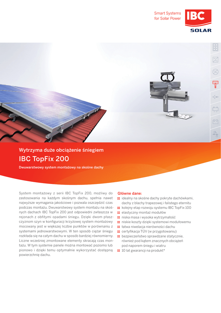 Wytrzyma duże obciążenie śniegiem IBC TopFix 200 Dwuwarstwowy system montażowy na skośne dachy System montażowy z serii IBC TopFix 200, możliwy do astosowania na każdym skośnym dachu, spełnia nawet z najwyższe wymagania jakościowe i pozwala oszczędzić czas podczas montażu. Dwuwarstwowy system montażu na skośnych dachach IBC TopFix 200 jest odpowiedni zwłaszcza w rejonach z obfitymi opadami śniegu. Dzięki dwom płaszczyznom szyn w konfiguracji krzyżowej system montażowy mocowany jest w większej liczbie punktów w porównaniu z systemami jednowarstwowymi. W ten sposób ciężar śniegu rozkłada się na całym dachu w sposób b ardziej równomierny. Liczne wcześniej zmontowane elementy skracają czas montażu. W tym systemie panele można montować poziomo lub pionowo i dzięki temu optymalnie wykorzystać dostępną powierzchnię dachu. Główne dane: idealny na skośne dachy pokryte dachówkami, dachy z blachy trapezowej i falistego eternitu kolejny etap rozwoju systemu IBC TopFix 100 elastyczny montaż modułów niska masa i wysoka wytrzymałość niskie koszty dzięki systemowi modułowemu łatwa niwelacja nierówności dachu certyfikacja TÜV (w przygotowaniu) bezpieczeństwo sprawdzane statycznie, również pod kątem znacznych obciążeń pod naporem śniegu i wiatru 10 lat gwarancji na produkt* Połączenie haków dachowych i profilu nośnego w ogólnym zarysie Wersja: 12.05.2010 r. LEGENDA L1 L2 (MB + 24 mm) x n1 + 32 mm Długość profilu nośnego = (MB + 24 mm) × liczba paneli w szeregu + 32 mm (MH + 20 mm) × n2 – 20 mm Długość łącza haków dachowych = (MH + 20 mm) × liczba szeregów z panelami – 20 mm MBszerokość panelu MHwysokość panelu A A złącze haków dachowych TF50 B profil nośny TF50 C hak dachowy D płytka łącząca Standard E maks. 300 mm F maks. 1200 mm Z maks. 1/4 wysokości panelu (należy przestrzegać wytycznych producenta panelu) łatwe projektowanie systemu za pomocą oprogramowania PV Manager firmy IBC SOLAR szybki montaż dzięki gotowym elementom montażowym i szybkozłączom montażowym niższe koszty dzięki systemowi modułowemu zminimalizowane wymagania dotyczące magazynowania z uwagi na standaryzowane jednostki montażowe Państwa partner IBC SOLAR: * Obowiązujące warunki gwarancji można otrzymać na życzenie od profesjonalnego partnera IBC SOLAR. Zastrzegamy sobie prawo do wprowadzania zmian służących doskonaleniu produktu. IBC SOLAR s. r. o. | Klikatá 353/13 | 158 00 Praga 5, Czechy | Tel. +48 71 70 72 920 | [email protected] | www.ibc-solar.pl