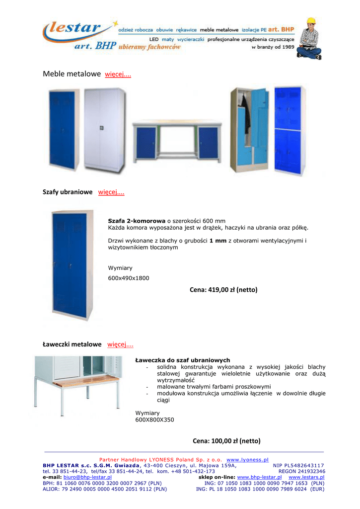 Meble metalowe więcej.... Szafy ubraniowe więcej.... Szafa 2-komorowa o szerokości 600 mm Każda komora wyposażona jest w drążek, haczyki na ubrania oraz półkę. Drzwi wykonane z blachy o grubości 1 mm z otworami wentylacyjnymi i wizytownikiem tłoczonym Wymiary 600x490x1800 Cena: 419,00 zł (netto) Ławeczki metalowe więcej.... Ławeczka do szaf ubraniowych solidna konstrukcja wykonana z wysokiej jakości blachy stalowej gwarantuje wieloletnie użytkowanie oraz dużą wytrzymałość malowane trwałymi farbami proszkowymi modułowa konstrukcja umożliwia łączenie w dowolnie długie ciągi Wymiary 600X800X350 Cena: 100,00 zł (netto) Partner Handlowy LYONESS Poland Sp. z o.o. www.ly oness.pl BHP LESTAR s.c. S.G.M. Gwiazda, 43-400 Cieszyn, ul. Majowa 159A, NIP PL5482643117 tel. 33 851-44-23, tel/fax 33 851-44-24, tel. kom. +48 501-432-173 REGON 241932346 e-mail: [email protected] sklep on-line: www.bhp-lestar.pl www.lestars.pl BPH: 81 1060 0076 0000 3200 0007 2967 (PLN) ING: 07 1050 1083 1000 0090 7947 1653 (PLN) ALIOR: 79 2490 0005 0000 4500 2051 9112 (PLN) ING: PL 18 1050 1083 1000 0090 7989 6024 (EUR) Ławka drewniana na metalowym stelażu Wymiary (długość)........x350x350 Cena za 1mb - 189,00zł (netto) Cena: 189,00 zł (netto) Szafy szkolne więcej.... Szafka szkolna ubraniowo-skrytkowa z daszkiem prostym. W każdym przedziale wieszaki na ubranie. Drzwi zamykane zamkami cylindrycznymi. Bez kieszeni na książki. Wymiary 610x490x1830 Cena: 479,00 zł (netto) Szafka szkolna, ubraniowa. - haczyki na ubrania w każdej komorze - szczeliny wentylacyjne w każdych drzwiach - zamknięcie na zamek cylindryczny z kluczykiem patentowym Wymiary 800x500x1800 Cena: 739,00 zł (netto) Partner Handlowy LYONESS Poland Sp. z o.o. www.ly oness.pl BHP LESTAR s.c. S.G.M. Gwiazda, 43-400 Cieszyn, ul. Majowa 159A, NIP PL5482643117 tel. 33 851-44-23, tel/fax 33 851-44-24, tel. kom. +48 501-432-173 REGON 241932346 e-mail: [email protected] sklep on-line: www.bhp-lestar.pl www.lestars.pl BPH: 81 1060 0076 0000 3200 0007 2967 (PLN) ING: 07 1050 1083 1000 0090 7947 1653 (PLN) ALIOR: 79 2490 0005 0000 4500 2051 9112 (PLN) ING: PL 18 1050 1083 1000 0090 7989 6024 (EUR) Szafy biurowe więcej.... Szafa biurowa z drzwiami uchylnymi - 4 przestawne półki - zamek obrotowy z kluczykiem patentowym - Wykonanie: blacha 0.8mm Wymiary 900X435X2000 Cena: 714,00 zł (netto) Nadstawki nad szafę więcej.... Nadstawka na szafę biurową - 1 półka przestawna zamek przekręcany i zamykany na kluczyk patentowy Wykonanie: blacha 0.8mm nastawka przystosowana jest do postawienia na szafie biurowej Wymiary 900x435x800 Cena: 429,00 zł (netto) Szafy szufladowe więcej.... Uniwersalna szafa szufladowa na format A4. Obciążenie szuflady do 40kg - wygodny dostęp do dokumentów - centralny zamek cylindryczny z kluczykiem patentowym - blokada wysuwu więcej niż 1 szuflady jednocześnie - na każdej szufladzie znajduje się tłoczony wizytownik umożliwiający wygodne opisywanie zawartości szuflad - stopki regulowane Wymiary 410x630x1295 Cena: 699,00 zł (netto) Partner Handlowy LYONESS Poland Sp. z o.o. www.ly oness.pl BHP LESTAR s.c. S.G.M. Gwiazda, 43-400 Cieszyn, ul. Majowa 159A, NIP PL5482643117 tel. 33 851-44-23, tel/fax 33 851-44-24, tel. kom. +48 501-432-173 REGON 241932346 e-mail: [email protected] sklep on-line: www.bhp-lestar.pl www.lestars.pl BPH: 81 1060 0076 0000 3200 0007 2967 (PLN) ING: 07 1050 1083 1000 0090 7947 1653 (PLN) ALIOR: 79 2490 0005 0000 4500 2051 9112 (PLN) ING: PL 18 1050 1083 1000 0090 7989 6024 (EUR) Stoły warsztatowe więcej.... Stół warsztatowy z dwoma szafkami uchylnymi Stelaż stołu wykonany z konstrukcji spawanej Blat stołu o grubości 40mm, możliwość wykonania tablicy narzędziowej Wymiary 1300x700x850 Cena: 719,00 zł (netto) Wózki warsztatowe więcej.... Uniwersalny wózek warsztatowy - - 4 podręczne szuflady na narzędzia obszerny schowek z drzwiami uchylanymi do góry na elektronarzędzia całość zamykana centralnie na zamek cylindryczny patentowy w bocznej ścianie wózka znajduje się tablica perforowana umożliwiająca zawieszenie narzędzi na zawiesiach Wykonanie: blacha 0.8mm Wymiary 650x450x900 Cena: 719,00 zł (netto) Partner Handlowy LYONESS Poland Sp. z o.o. www.ly oness.pl BHP LESTAR s.c. S.G.M. Gwiazda, 43-400 Cieszyn, ul. Majowa 159A, NIP PL5482643117 tel. 33 851-44-23, tel/fax 33 851-44-24, tel. kom. +48 501-432-173 REGON 241932346 e-mail: [email protected] sklep on-line: www.bhp-lestar.pl www.lestars.pl BPH: 81 1060 0076 0000 3200 0007 2967 (PLN) ING: 07 1050 1083 1000 0090 7947 1653 (PLN) ALIOR: 79 2490 0005 0000 4500 2051 9112 (PLN) ING: PL 18 1050 1083 1000 0090 7989 6024 (EUR)
